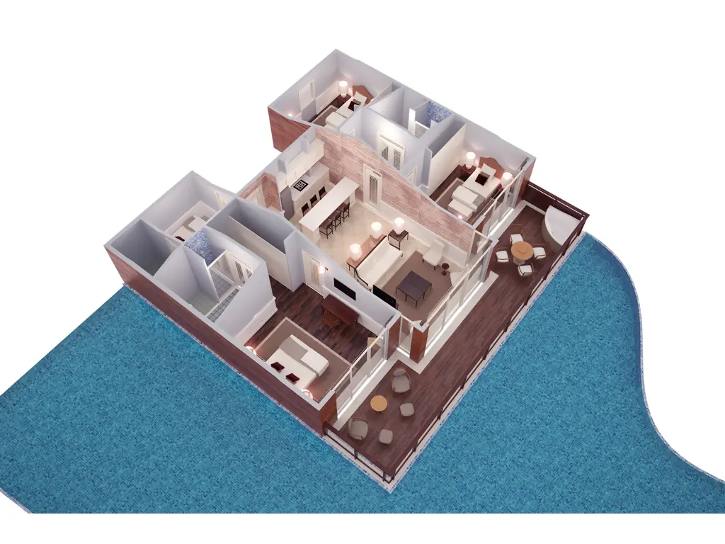 Dla max. 8 osób, Przestrzeń zewnętrzna: Taras, Telefon w pokoju, Aneks kuchenny, wanna i prysznic , Powierzchnia pokoju: ok. 138 m2, Dostawka: łóżko standardowe, Rodzaj podłogi: laminat, Sprzątanie codziennie, Salon, część jadalniana, miejsce do pracy, 3 sypialnie, Drzwi łączące między pokojami, Maksymalna liczba osób dorosłych: 6, Maksymalna liczba dzieci: 2, Concierge (bezpłatnie), Kwiaty i owoce, Widok na basen, Wyjście do wspólnego basenu, Liczba łazienek: 3, Liczba toalet: 3, Kuchenka mikrofalowa, Zestaw do parzenia kawy i herbaty, Klimatyzacja: Klimatyzacja indywidualna