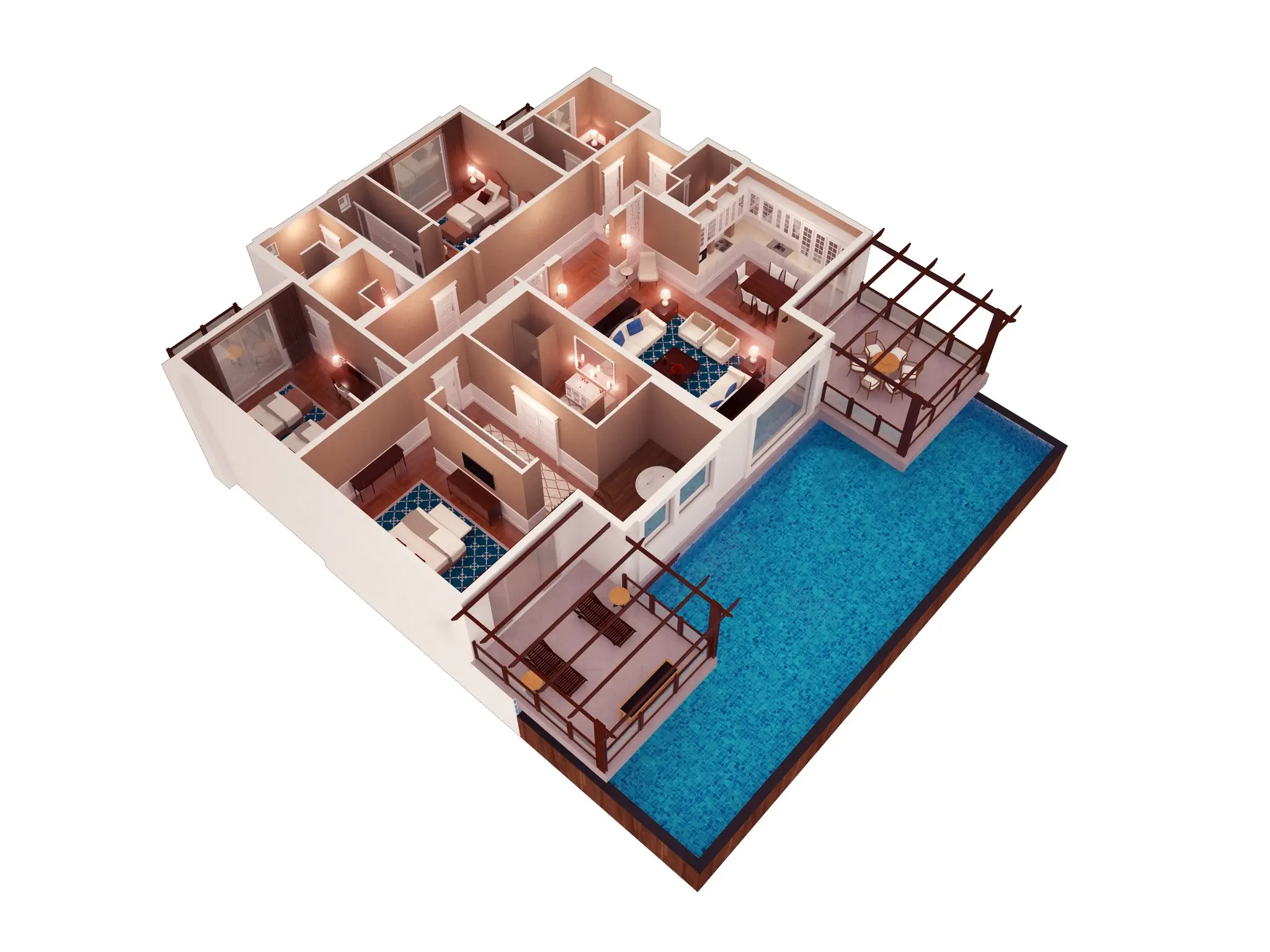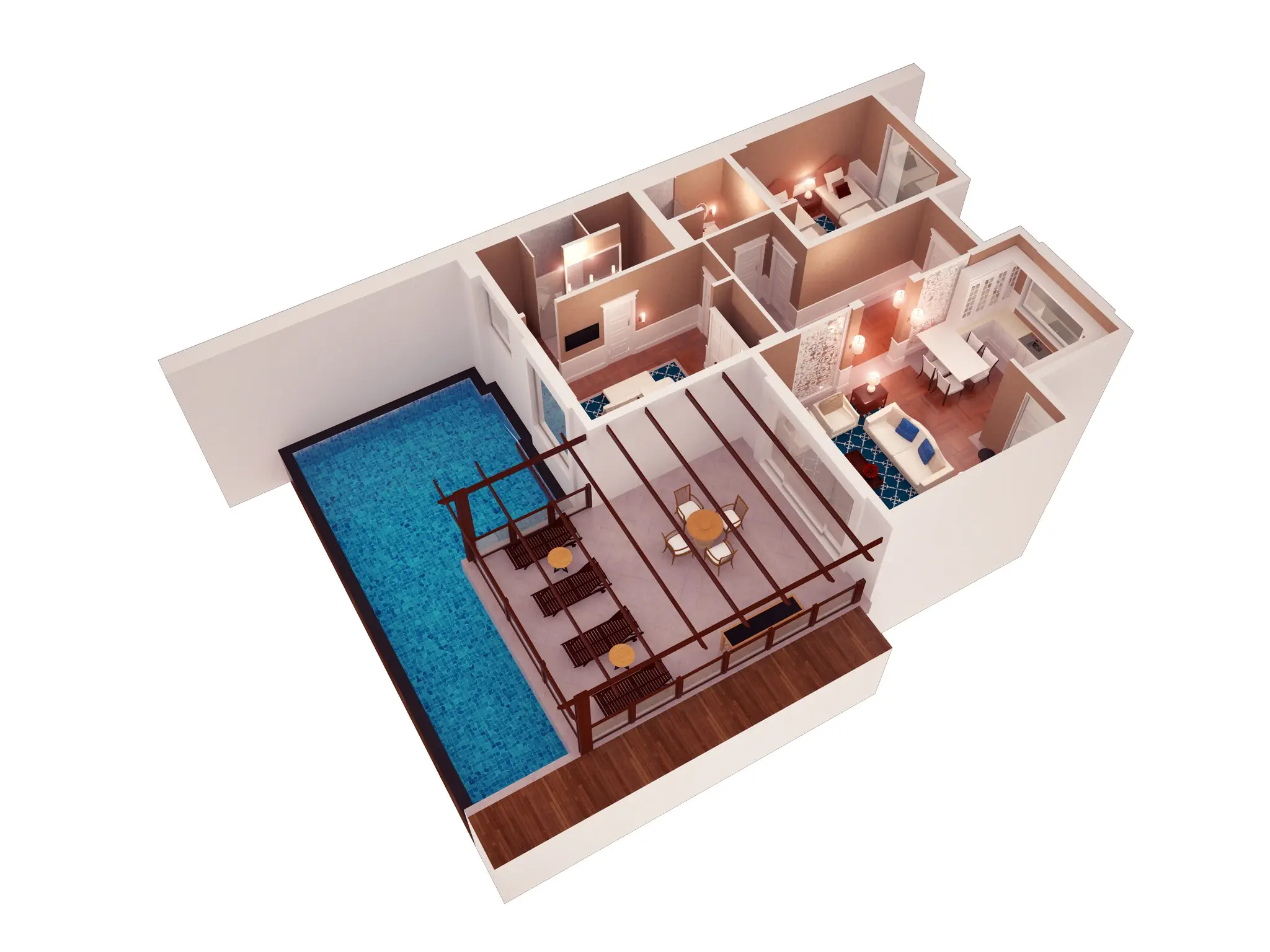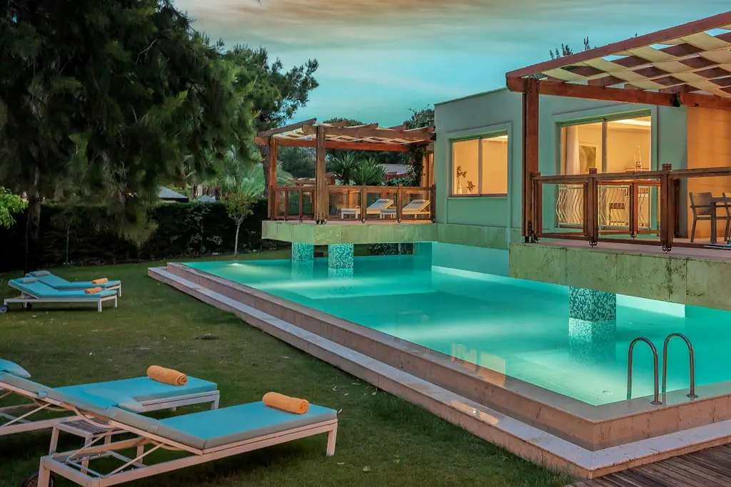 Dla max. 8 osób, Przestrzeń zewnętrzna: Taras, Telefon w pokoju, Aneks kuchenny, wanna i prysznic , Powierzchnia pokoju: ok. 175 m2, Dostawka: łóżko standardowe, Rodzaj podłogi: laminat, Sprzątanie codziennie, Salon, część jadalniana, miejsce do pracy, 3 sypialnie, Drzwi łączące między pokojami, Maksymalna liczba osób dorosłych: 6, Maksymalna liczba dzieci: 2, Concierge (bezpłatnie), Kwiaty i owoce, Widok na basen, Bezpośredni dostęp do plaży, Prywatny basen, Liczba łazienek: 3, Liczba toalet: 3, Kuchenka mikrofalowa, Zestaw do parzenia kawy i herbaty, Klimatyzacja: Klimatyzacja indywidualna
