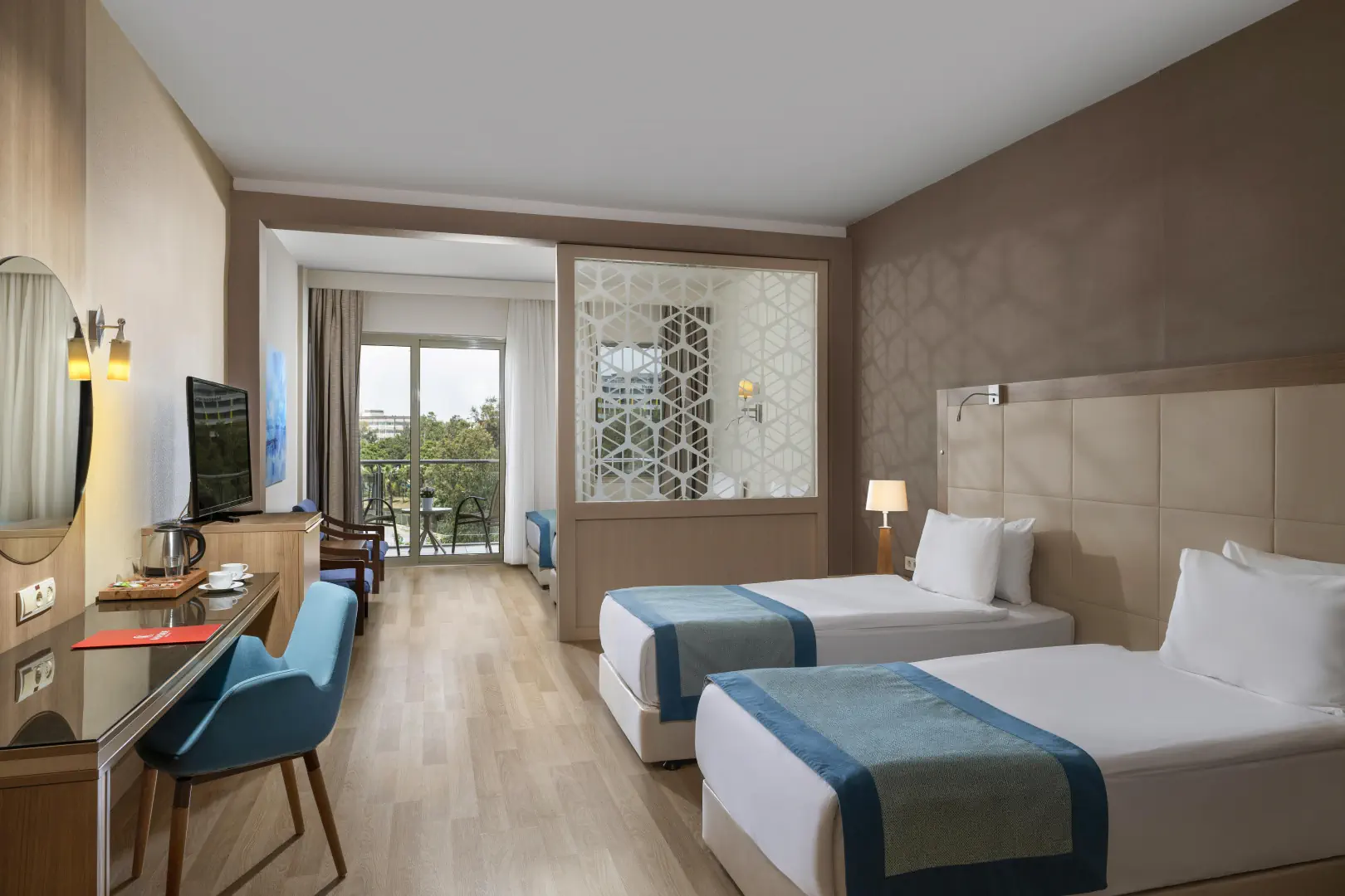 Dla max. 3 osób, Przestrzeń zewnętrzna: Balkon, Telefon w pokoju, prysznic, Powierzchnia pokoju: ok. 25 m2, Rodzaj podłogi: laminat, Sprzątanie codziennie, 1 sypialnia, Maksymalna liczba osób dorosłych: 2, Maksymalna liczba dzieci: 1, Widok na ogród, Liczba łazienek: 1, Liczba toalet: 1, Zestaw do parzenia kawy i herbaty, Klimatyzacja: Klimatyzacja centralna, Działa w godzinach: Styczeń, Luty, Marzec, Kwiecień, Maj, Czerwiec, Lipiec, Sierpień, Wrzesień, Październik, Listopad, Grudzień, Nieznany