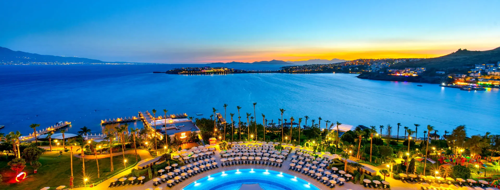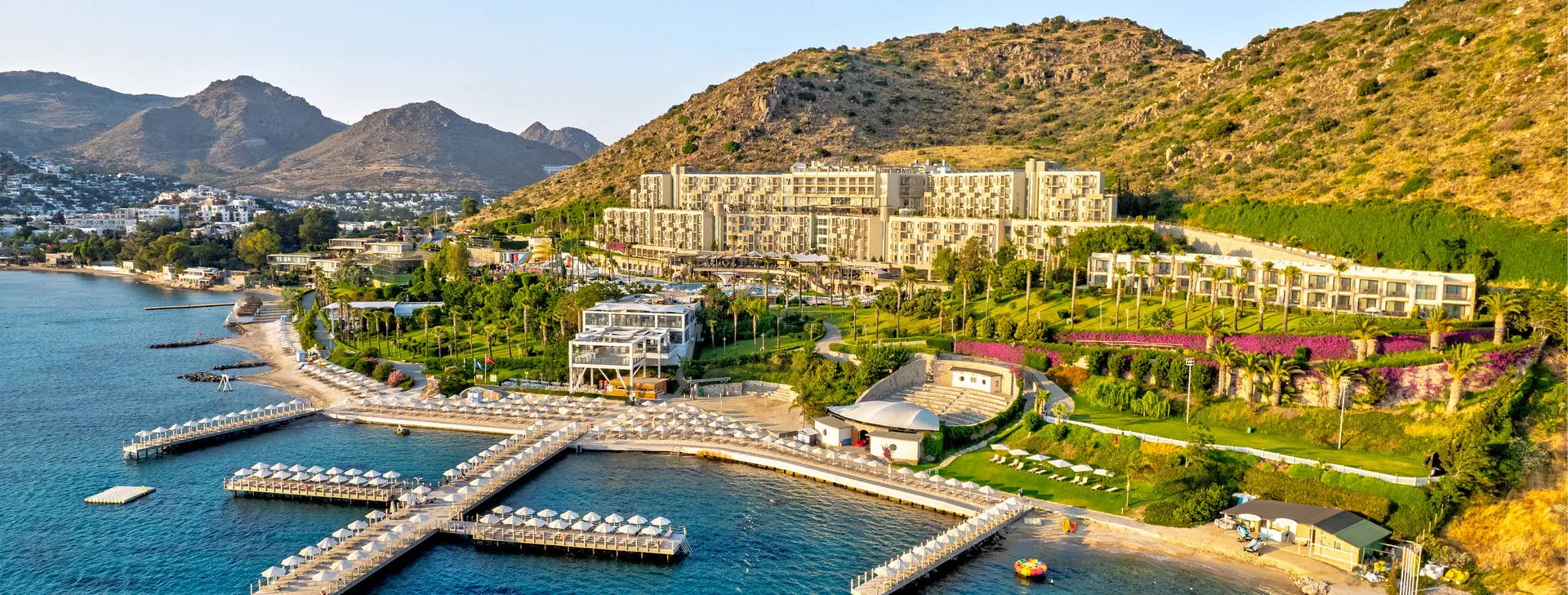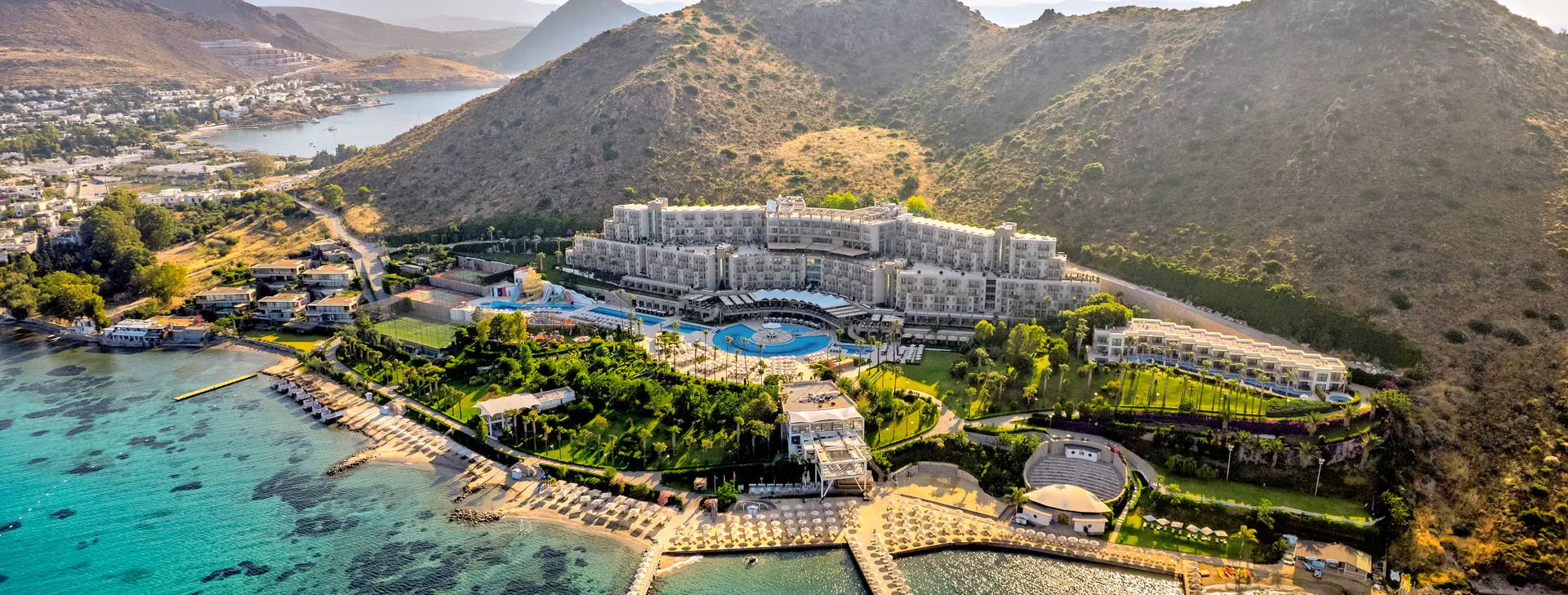 Położenie: Luksusowy hotel położony na zadbanym zielonym terenie o powierzchni 5 ha, rozciągającym się wzdłuż pięknej plaży uchodzącej do turkusowych wód Morza Egejskiego. Ok. 10 km do turystycznej miejscowości Turgutreis z wyborem barów, restauracji oraz sklepów. Ok. 25 km do centrum Bodrum oraz ok. 60 km do lotniska Bodrum-Milas. Plaża: Położony tuż przy pięknej, prywatnej, piaszczystej plaży rozciągającej się na długości ponad 400 m z prywatnym pomostem (zalecane obuwie ochronne). Ręczniki plażowe, leżaki i parasole dostępne bezpłatnie. Możliwość wynajęcia altany na plaży (za opłatą). Do dyspozycji gości: Recepcja 24 h, kantor, restauracja główna (wymagany strój wieczorowy), 5 restauracji a’la carte (otwarte w szczycie sezonu): turecka, włoska, meksykańska, chińska oraz z owocami morza (jedna bezpłatna wizyta w jednej restuaracji, nastepne wizyty płatne dodatkowo ok. 10 EUR/os., wymagana rezerwacja), 4 restauracje serwujące przekąski w ciągu dnia, 9 barów w tym bar przy basenie, na plaży i na pomoście oraz dyskoteka. Ponadto 3 baseny: główny, z animacjami i kryty, jacuzzi, aqua park z 5 zjeżdżalniami, 3 brodziki dla dzieci, bezpłatne ręczniki, leżaki i parasole. W hotelu znajduje się kino. Za dodatkową opłatą: room service 24 h, minimarket, sklep z pamiątkami, fotograf, fryzjer, lekarz, pralnia, usługi opiekunki dla dzieci (na zapytanie), wypożyczalnia samochodów. Wyżywienie: Ultra All Inclusive: śniadanie, późne śniadanie, lunch oraz obiadokolacja w formie urozmaiconego bufetu. W ciągu dnia przekąski oraz lody w wyznaczonych restauracjach. Lokalne oraz niektóre importowane napoje bezalkoholowe i alkoholowe dostępne 24 h w wybranych barach, świeżo wyciskane soki podczas śniadania oraz w Vitamin barze. Płatne dodatkowo: pozostałe importowane napoje bezalkoholowe i alkoholowe, wina butelkowane, szampan. Program sportowy i animacyjny: Hotel prowadzi animacje dzienne i wieczorne. Ponadto: niemotorowe sporty wodne, windsurfing (1 h/dzień, wymagana licencja), fitness, siłownia, centrum SPA, tenis, koszykówka, siatkówka plażowa, łucznictwo, rowery, tenis stołowy, bilard, rzutki. Za opłatą: zabiegi i masaże w centrum SPA, motorowe sporty wodne, oświetlenie kortów i boisk, kręgle, automaty do gier. Dla dzieci: mini klub. Internet: Bezpłatny Internet Wi-Fi na terenie całego hotelu, również w pokojach. Kategoria lokalna: ***** Strona www: