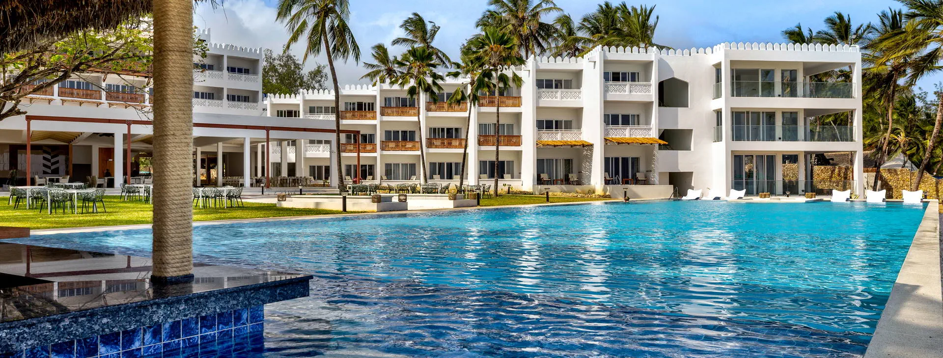 Położenie: Hotel położony na północnym wybrzeżu Mombasy, wybudowany w typowo afrykańskim stylu i otoczony tropikalnym ogrodem. Hotel składa się z trzech 2-piętrowych budynków, w których rozmieszczone są pokoje. Niedaleko centrum handlowe z restauracjami i dyskotekami. Do centrum Mombasy ok. 12 km, ok. 25 km do lotniska w Mombasie. Plaża: Hotel położony bezpośrednio przy szerokiej, piaszczystej plaży. Leżaki, parasole i ręczniki kąpielowe dostępne bezpłatnie na terenie hotelu przy plaży. Do dyspozycji gości: Recepcja 24 h, 2 restauracje: główna Ziwani oferująca dania kuchni międzynarodowej, orientalnej i wegetariańskiej, a’la carte Karibu Grill serwująca grillowane mięsa i ryby. 4 bary: Karibu Snack Bar serwujący przekąski w ciągu dnia, bar główny Dhow otwarty 24 h (po 23:30 za opłatą), Karibu (10:00-23:30) i Ziwani przy basenie (10:00-23:30). Na terenie hotelu znajdują się 2 baseny ze słodką wodą o nieregularnym kształcie, jeden z jacuzzi oraz brodzik dla dzieci. Dodatkowo: sala telewizyjna, kantor, sklepik z pamiątkami, sala konferencyjna, mini SPA. Pokoje: Hotel posiada 150 wygodnie urządzonych pokoi standardowych, zlokalizowanych w kilku 2-piętrowych budynkach, mogących zakwaterować max. 3 os. dorosłe. Wyposażone są w: łazienkę z prysznicem, suszarkę do włosów, klimatyzację, TV Sat., telefon, sejf (płatny ok. 2 USD/dzień), mini lodówkę, zestaw do przygotowywania kawy i herbaty, umeblowany balkon lub taras. Wyżywienie: All Inclusive: śniadania (07:00-10:00), późne śniadania kontynentalna (10:00-10:30), lunche (12:30-14:30) i obiadokolacje (19:00-22:00) w formie bufetu. Przekąski w barze Karibu (10:00-17:30), podwieczorek w godz. 16:00-17:30. Lokalne napoje bezalkoholowe i alkoholowe w godzinach 10:00-23:30. Trzy razy w tygodniu hotel organizuje kolacje tematyczne, m.in. wieczory afrykańskie. Wyżywienie na objeździe: śniadania, obiady i kolacje zgodnie z opisem w programie wycieczki. Program sportowy i animacyjny: Hotel prowadzi dzienne i wieczorne animacje m.in.: pokazy akrobatyczne, taneczne, wieczory z muzyką na żywo. Ponadto: boisko do squasha (sprzęt dostępny po opłaceniu zwrotnego depozytu), jedna lekcja nurkowania w basenie, siłownia, aqua aerobik, siatkówka i piłka nożna na plaży, tenis stołowy, bilard, rzutki. Dla dzieci: mini klub (10:00-18:00). Za opłatą: sporty wodne na plaży (snorkeling, windsurfing, nurkowanie), rejsy na rafę koralową, wyprawy na połów ryb. Internet: Bezpłatny Internet Wi-Fi w ogólnodostępnych częściach hotelu. Kącik internetowy dodatkowo płatny (ok. 4 USD/30 min.). Kategoria lokalna: Bamburi Beach*** / zakwaterowanie na objeździe*** Strona www: