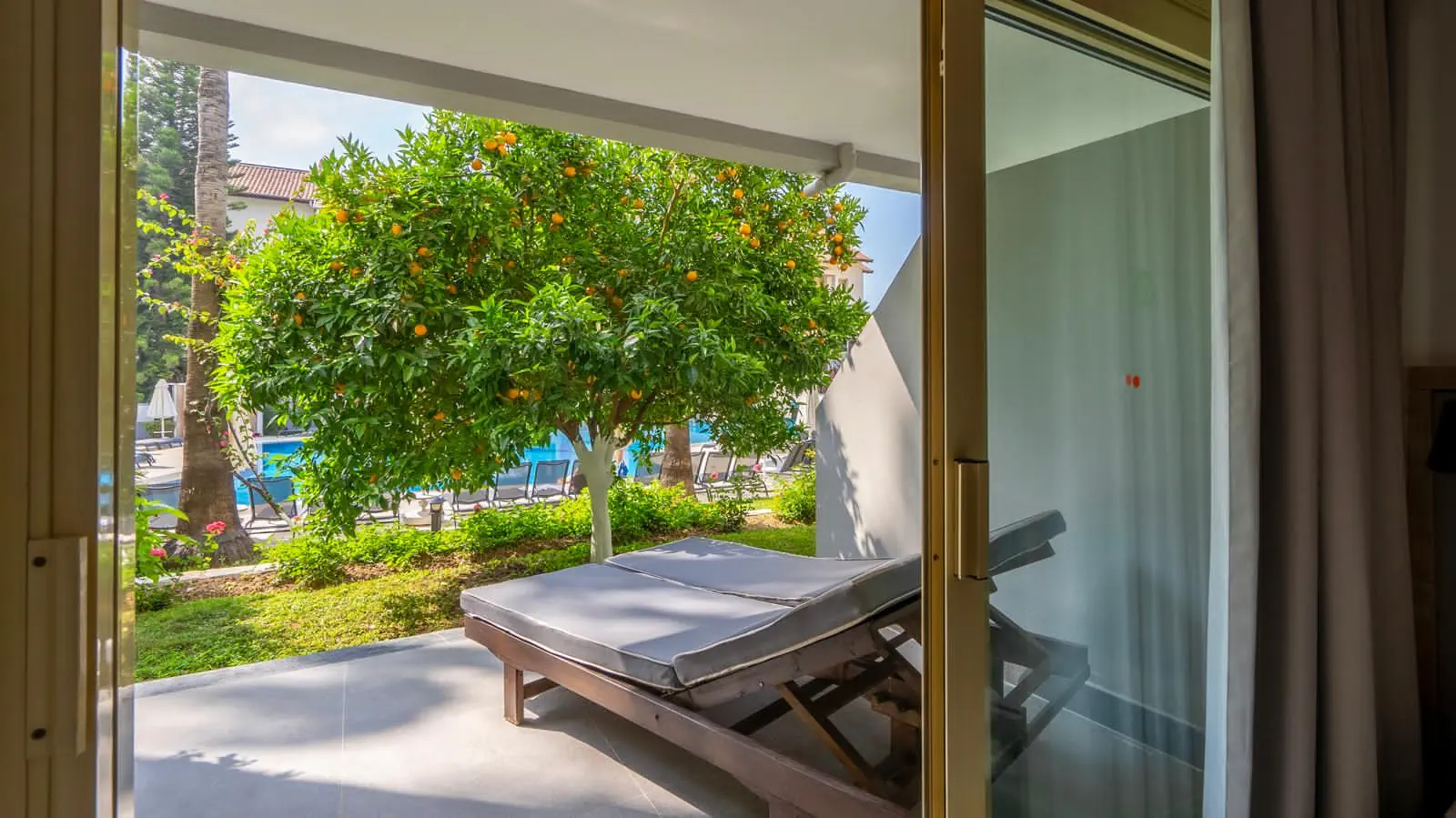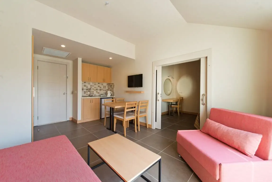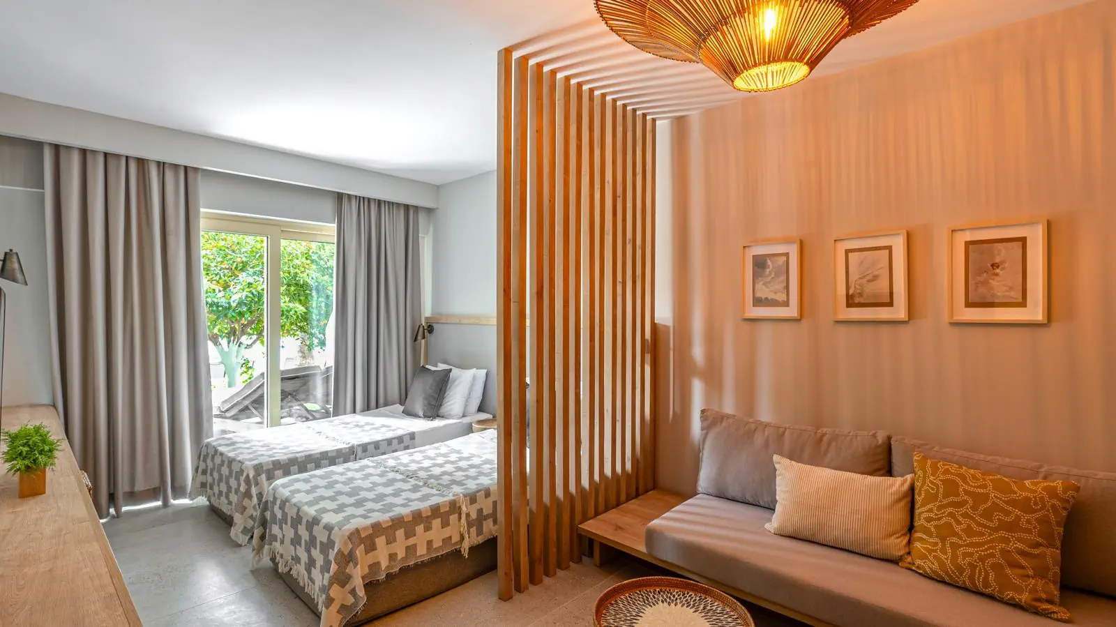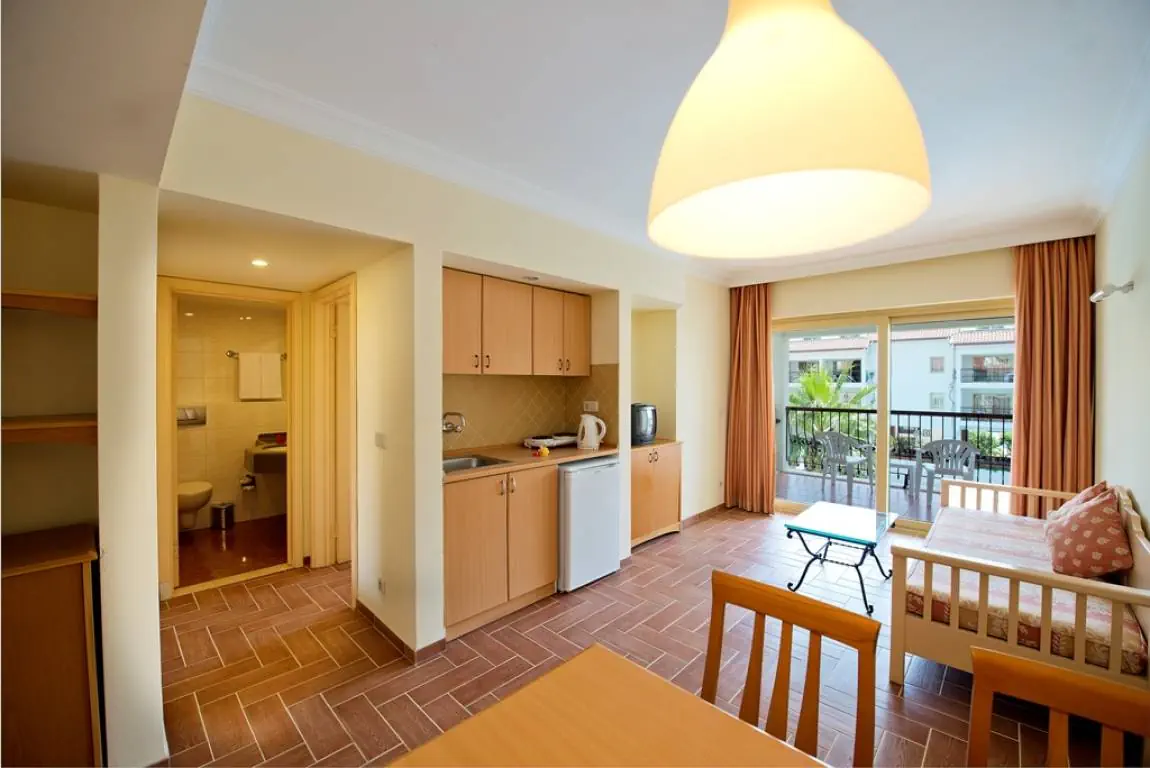 Dla max. 3 osób, Przestrzeń zewnętrzna: Balkon lub taras, Kanały telewizji: Angielski, Telefon w pokoju, Aneks kuchenny, wanna lub prysznic , Powierzchnia pokoju: ok. 42 m2, Dostawka: łóżko rozkładane, Rodzaj podłogi: płytki, Sprzątanie codziennie, Salon, część jadalniana, 1 sypialnia, Drzwi łączące między pokojami, Maksymalna liczba osób dorosłych: 2, Maksymalna liczba dzieci: 2, Widok na ogród i basen, Liczba łazienek: 1, Liczba toalet: 1, Klimatyzacja: Klimatyzacja indywidualna