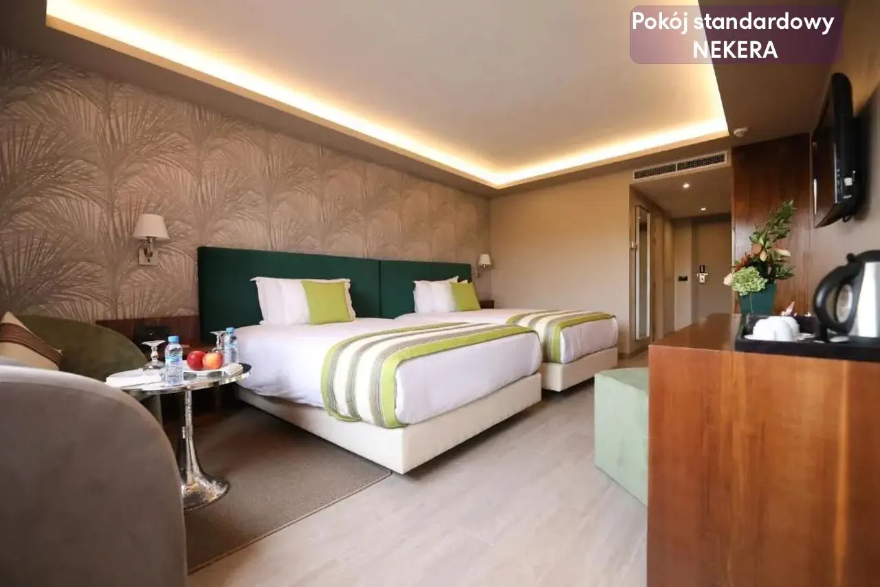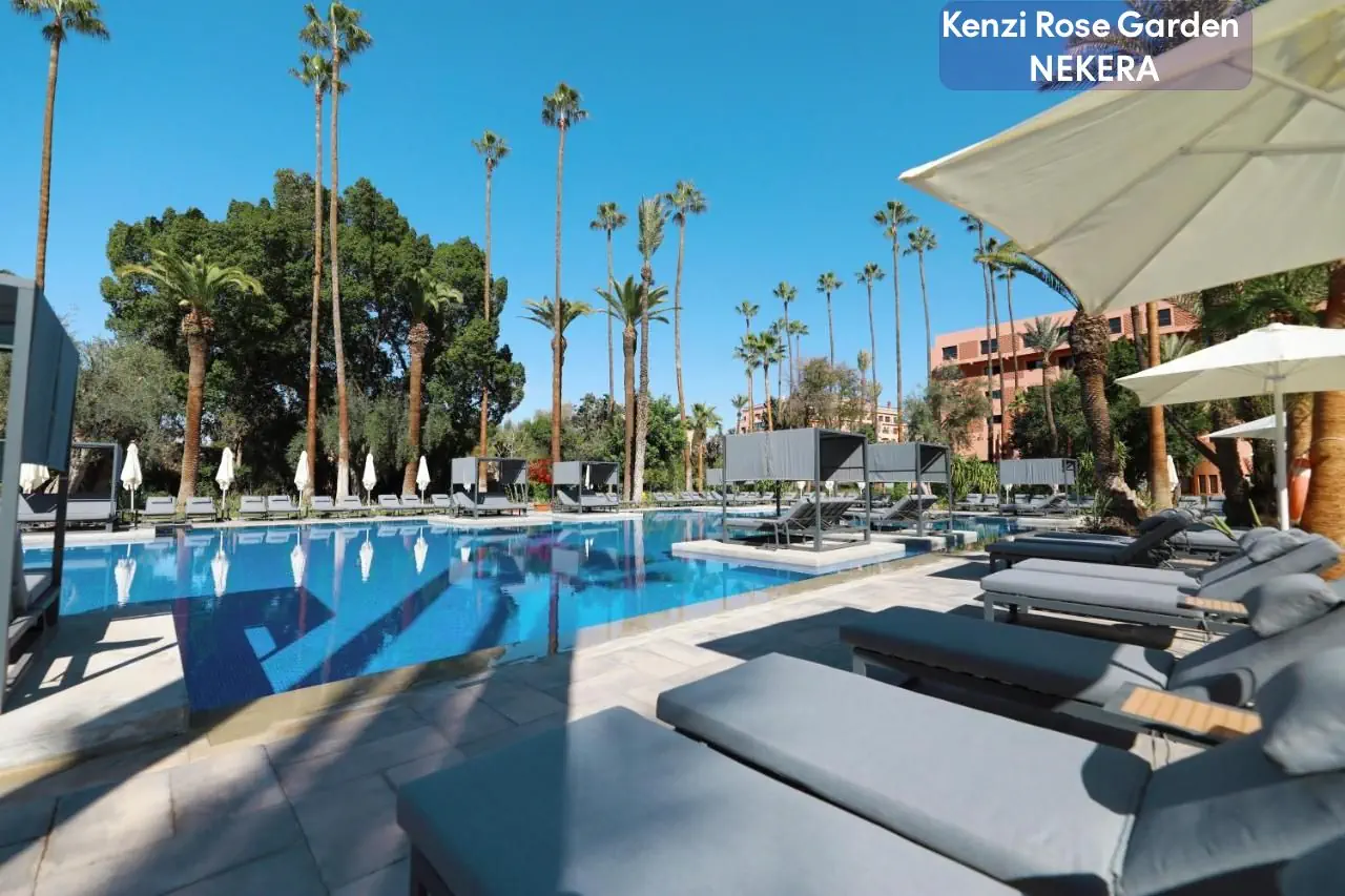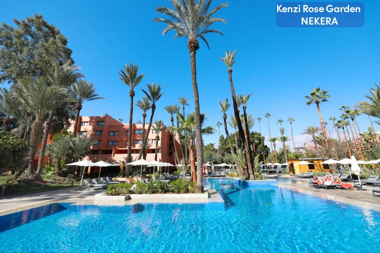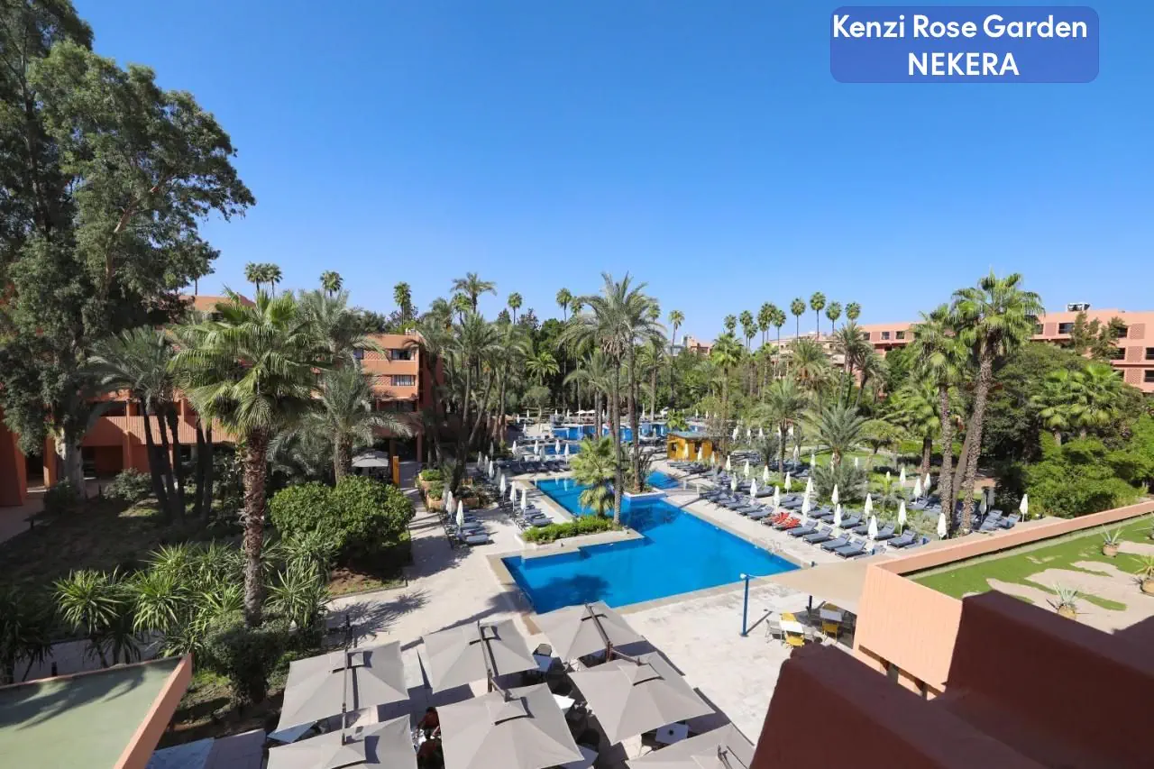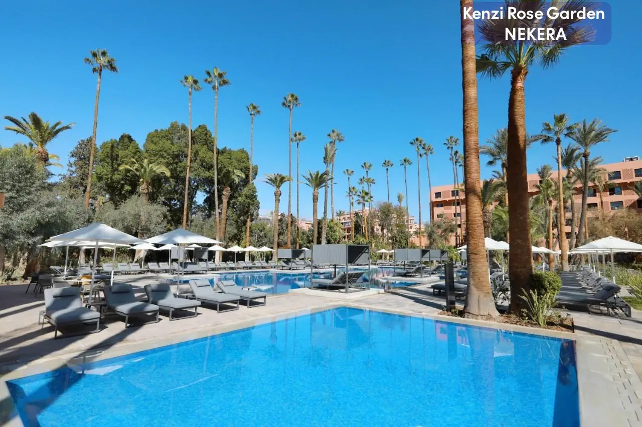 Kenzi Rose Garden to elegancki, pięciogwiazdkowy hotel zlokalizowany w sercu nowoczesnej dzielnicy Hivernage w Marrakeszu. Otoczony bujnymi ogrodami pełnymi róż, ten luksusowy obiekt oferuje spokojną oazę w tętniącym życiem mieście. Hotel zapewnia połączenie nowoczesnego komfortu z marokańskim urokiem, co czyni go idealnym wyborem dla turystów. Hotel zachwyca elegancką, nowoczesną architekturą, którą wzbogacają tradycyjne marokańskie elementy. Wnętrza są przestronne, stylowo urządzone i pełne luksusowych detali. Duże okna wpuszczają mnóstwo naturalnego światła, co w połączeniu z ciepłymi kolorami i eleganckimi materiałami tworzy przytulną atmosferę.