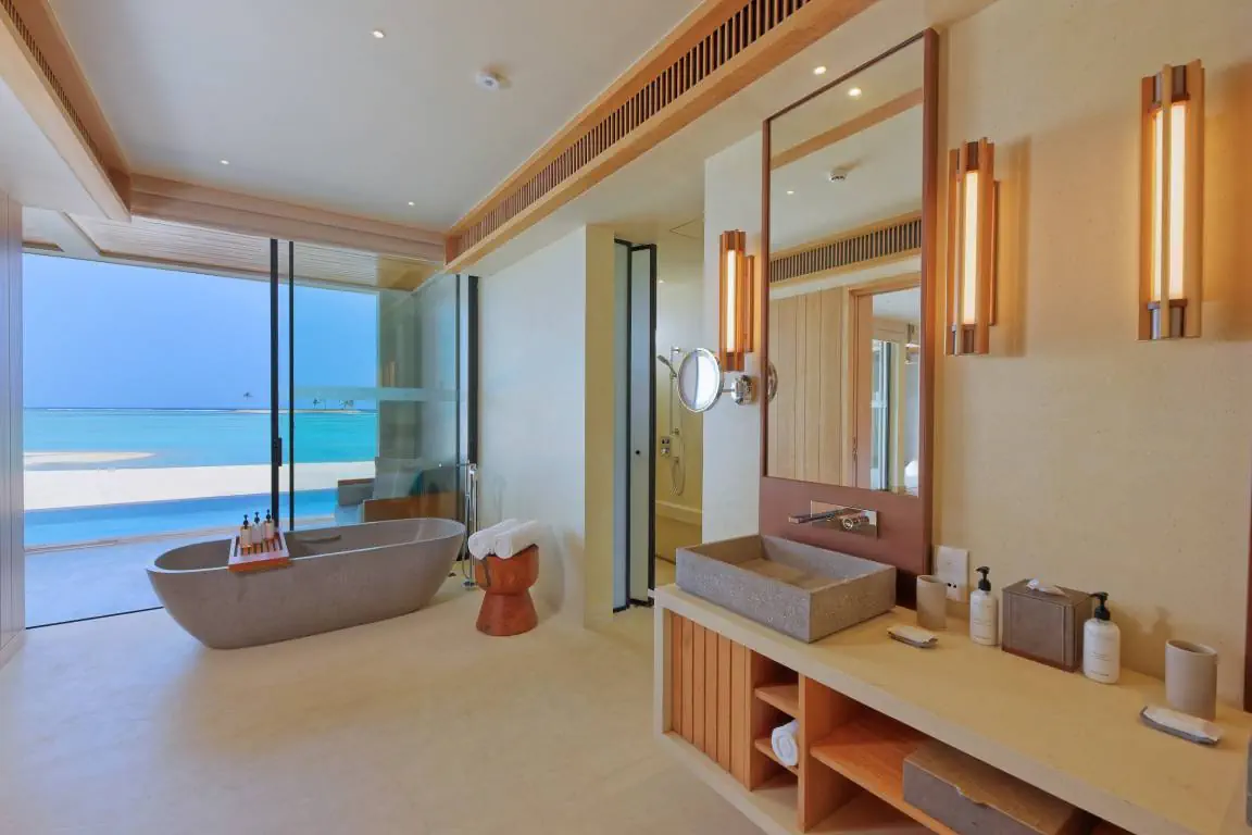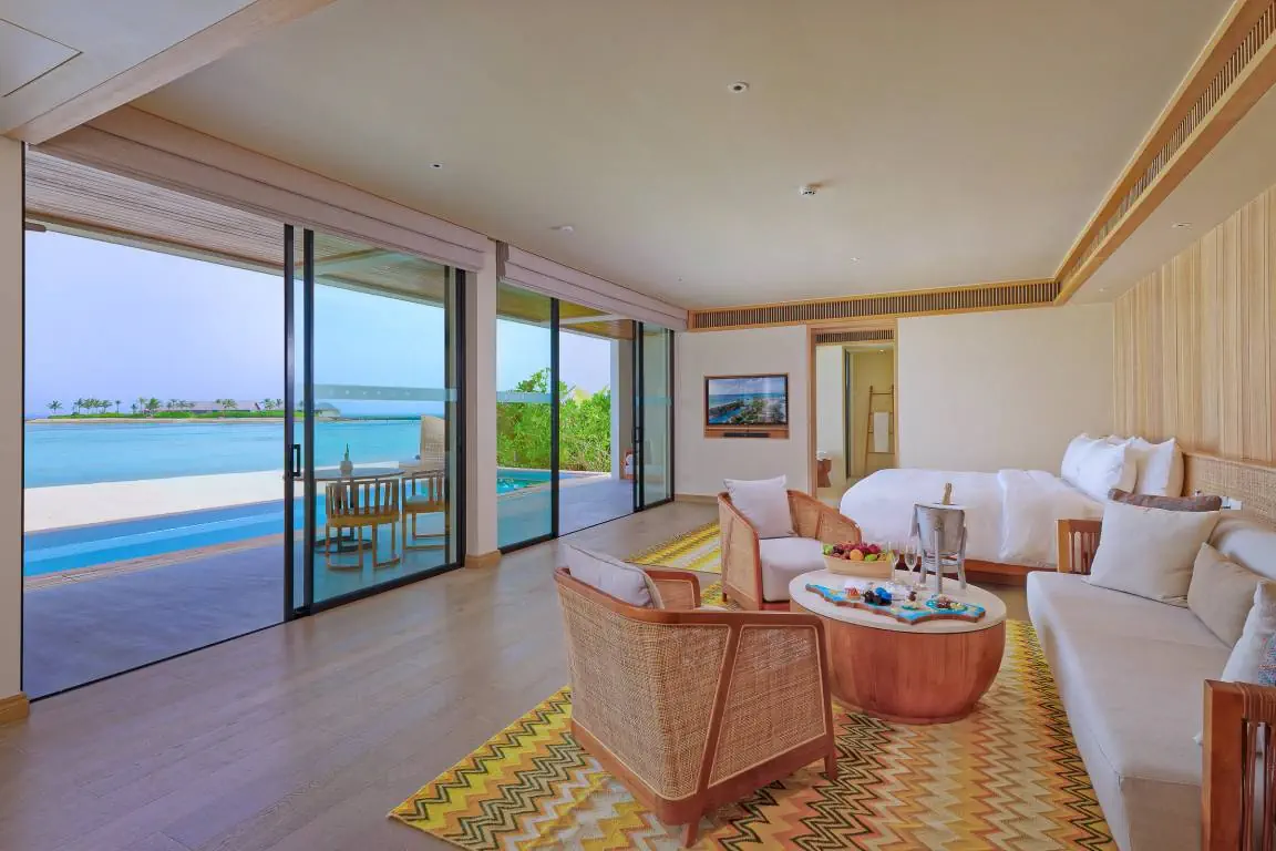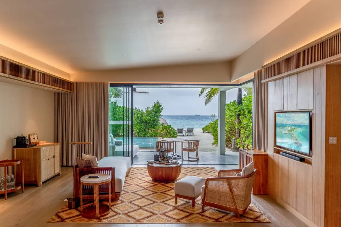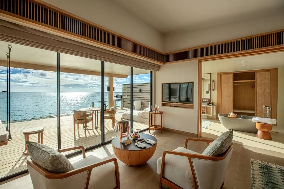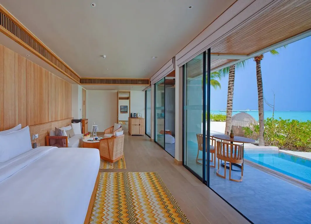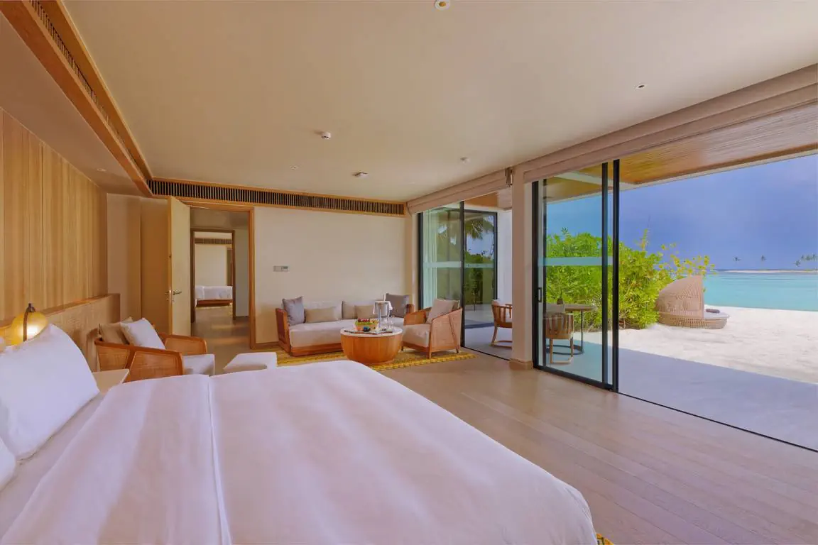 Dla max. 4 osób, Przestrzeń zewnętrzna: Taras, Kanały telewizji: angielski, Telefon w pokoju, wanna, prysznic, Powierzchnia pokoju: ok. 152 m2, Dostawka: łóżko standardowe, Rodzaj podłogi: drewno, Sprzątanie codziennie, 1 sypialnia, Maksymalna liczba osób dorosłych: 2, Maksymalna liczba dzieci: 2, Concierge (bezpłatnie), Frontalny widok na plażę,Widok na ogród i basen,Widok na ogród i morze,Widok na lagunę,Widok na morze, Liczba łazienek: 1, Liczba toalet: 1, Zestaw do parzenia kawy i herbaty, Klimatyzacja: Klimatyzacja indywidualna
