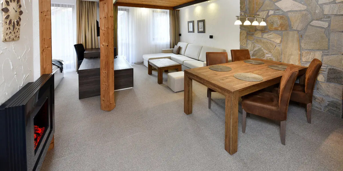 Komfortowy dwupokojowy apartament z odrębną sypialnią i aneksem kuchennym. W wyposażeniu: pokój dzienny z sofą i TV z kanałami satelitarnymi, wifi, kącik jadalny, w aneksie kuchennym płyta grzewcza, kuchenka mikrofalowa, lodówka z minibarem, czajnik, naczynia i sztućce, ręczniki kąpielowe, w łazience prysznic lub wanna, suszarka do włosów.Niektóre apartamenty mogą być wyposażone w piekarnik elektryczny, kominek elektryczny w salonie i/lub bidet w łazience