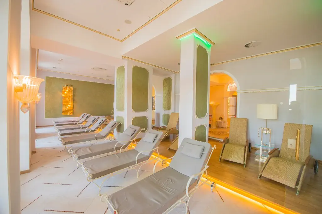 strefa Wellness (350 m2): wstęp dla Gości powyżej 16 lat. Basen kryty, basen infinity w whirlpoolem, łaźnia parowa, sauna fińska, kabina na podczerwień, pomieszczenie do wypoczynkupodgrzewane leżaki, duży taras, strefa Feng-Shui w ogrodzie. Za opłatą: zabiegi kosmetyczne i masaże.