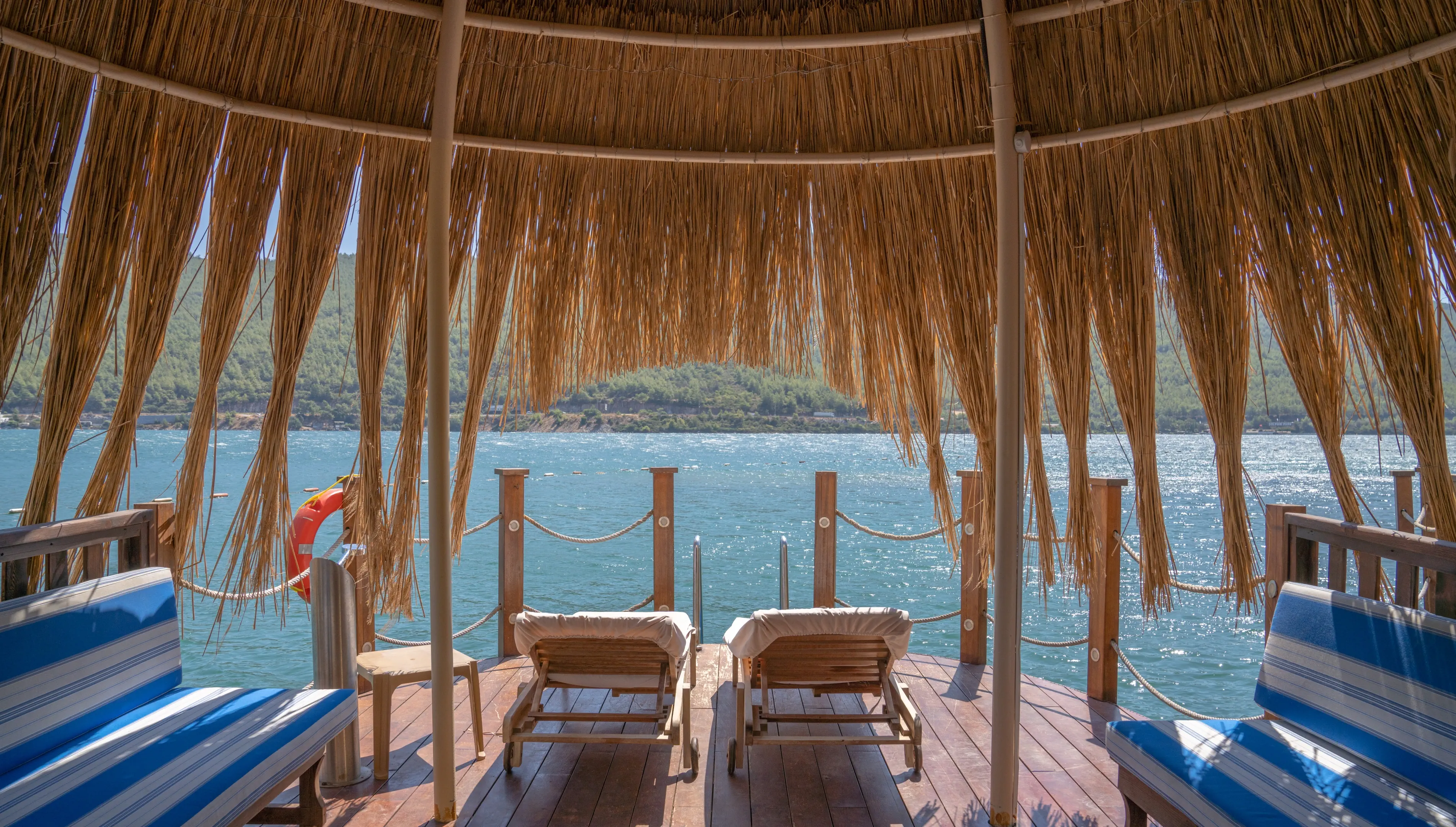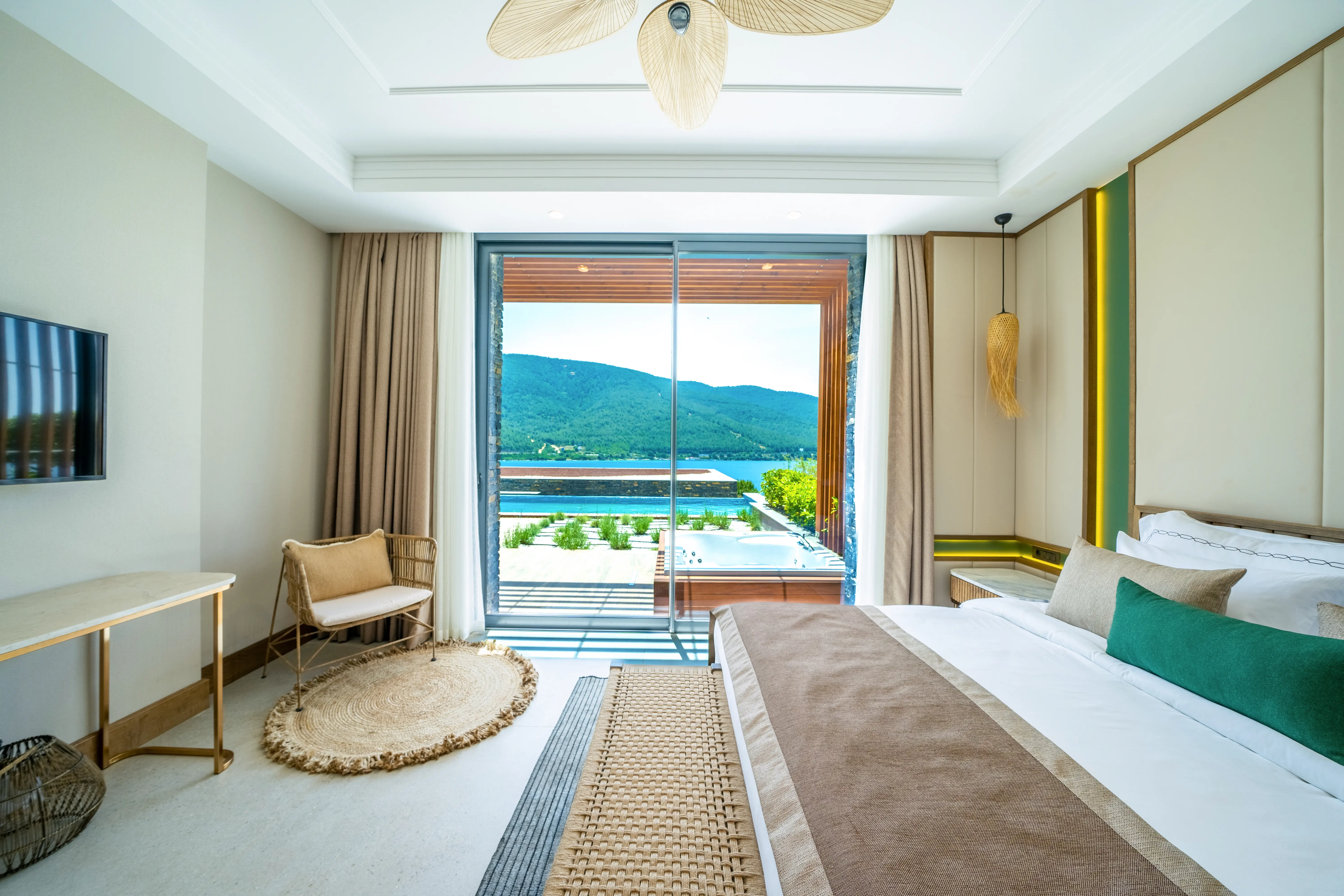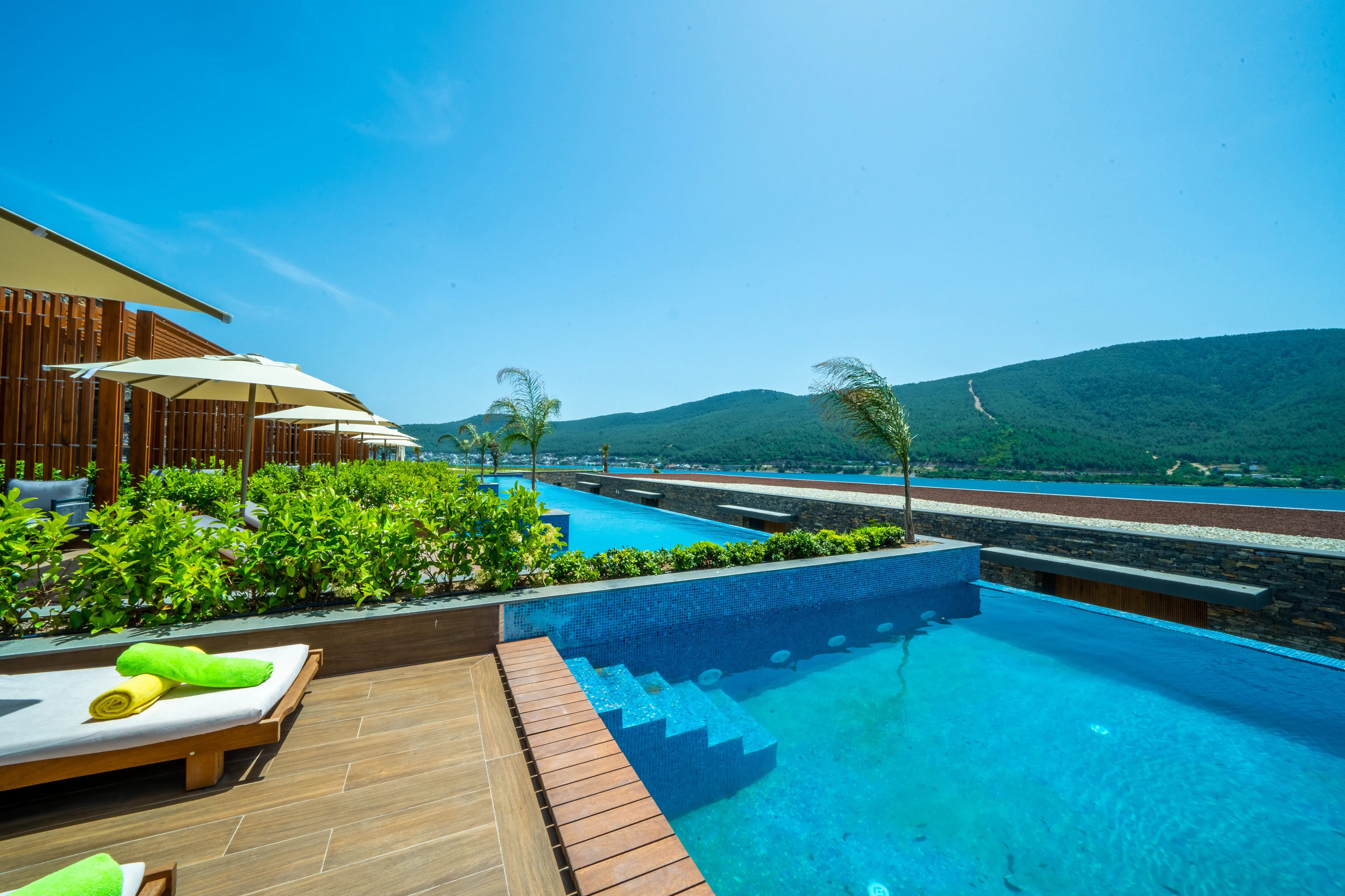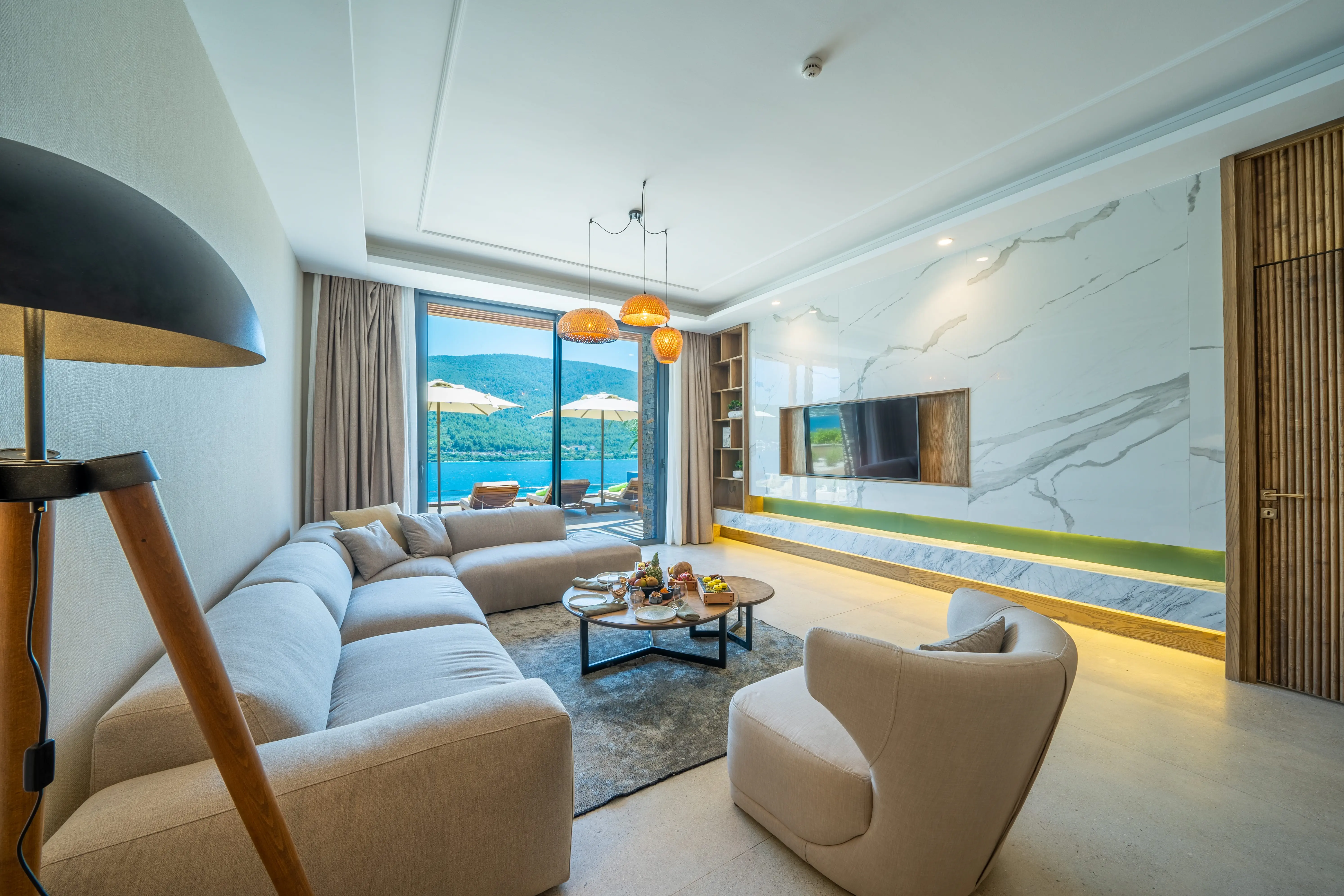 Dla max. 4 osób, Przestrzeń zewnętrzna: Taras, Telefon w pokoju, prysznic, Powierzchnia pokoju: ok. 50 - 65 m2, Dostawka: sofa, Rodzaj podłogi: laminat, Sprzątanie cykliczne, Salon, 1 sypialnia, Drzwi przesuwne, Maksymalna liczba osób dorosłych: 3, Maksymalna liczba dzieci: 2, Concierge (płatne), Od strony morza,Częściowy widok na morze, Wyjście do wspólnego basenu, Prywatny basen, Liczba łazienek: 1, Liczba toalet: 1, Zestaw do parzenia kawy i herbaty, Klimatyzacja: Wybierz