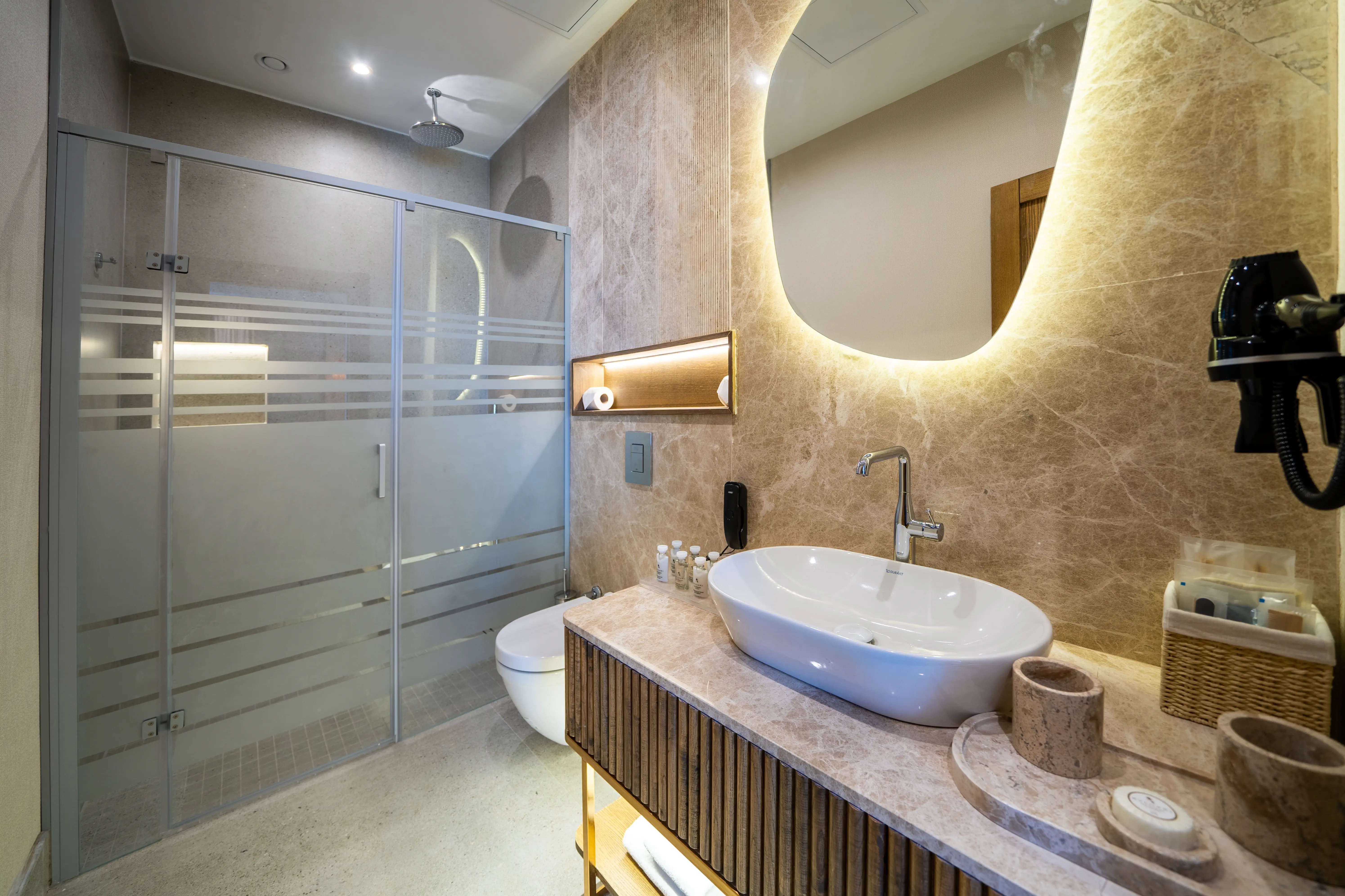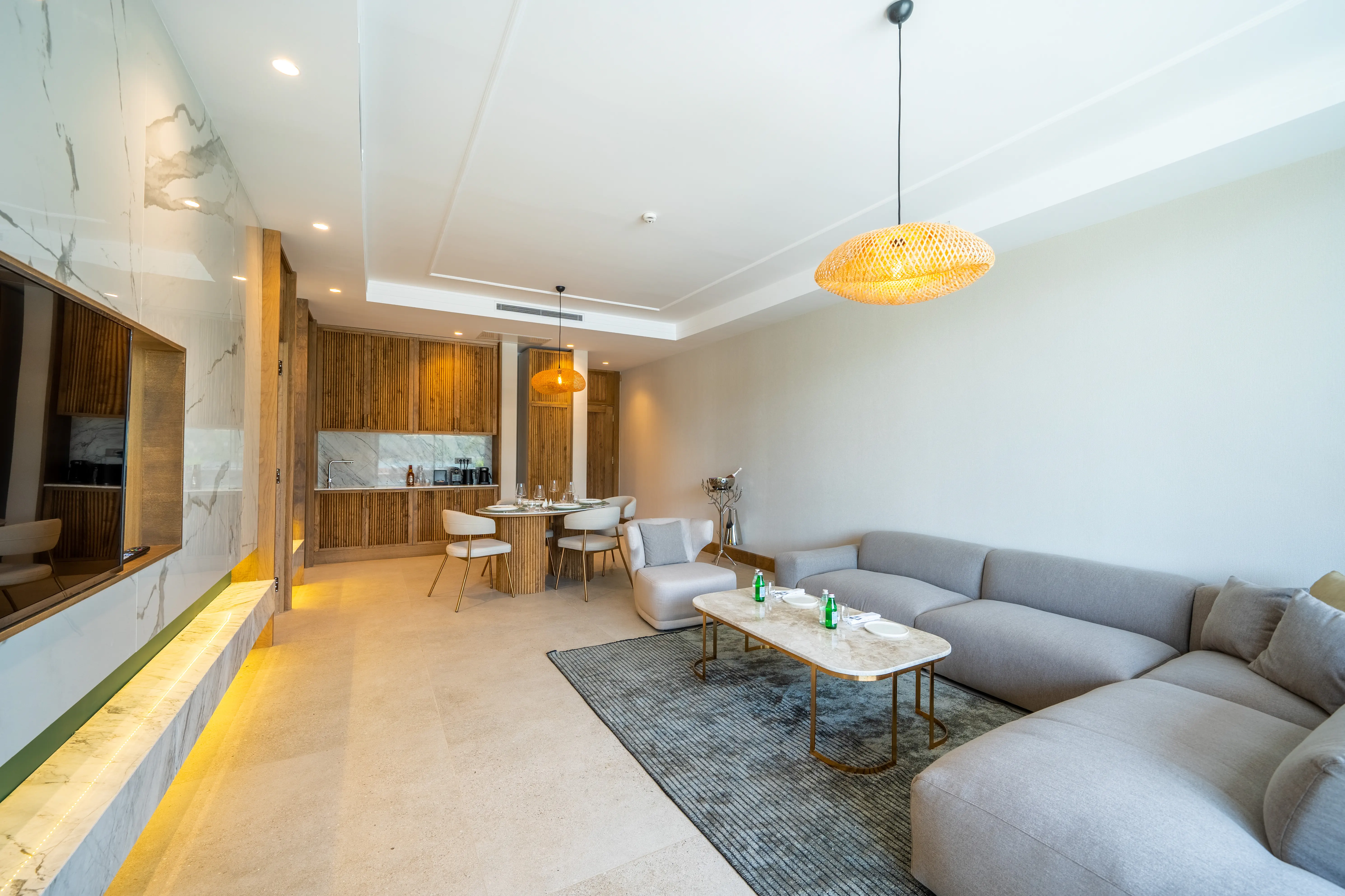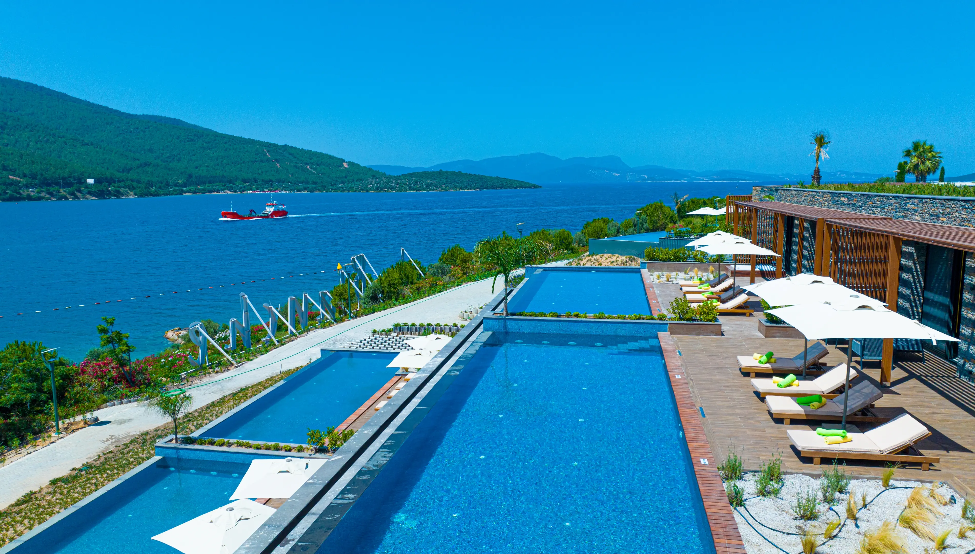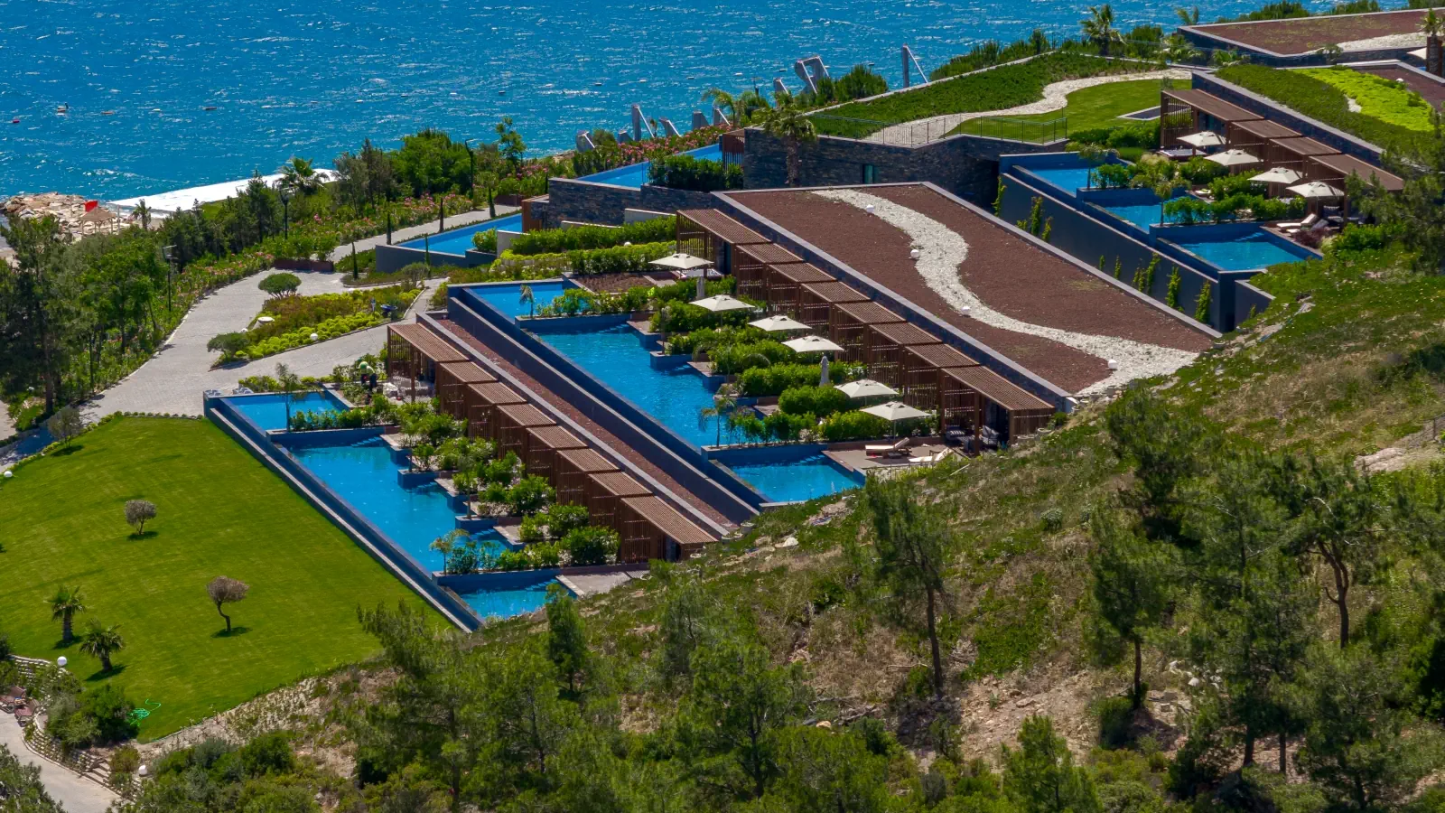 Dla max. 4 osób, Przestrzeń zewnętrzna: Taras, Telefon w pokoju, prysznic, Powierzchnia pokoju: ok. 50 - 65 m2, Dostawka: sofa, Rodzaj podłogi: laminat, Sprzątanie cykliczne, Salon, 1 sypialnia, Drzwi przesuwne, Maksymalna liczba osób dorosłych: 3, Maksymalna liczba dzieci: 2, Concierge (płatne), Od strony morza,Częściowy widok na morze, Wyjście do wspólnego basenu, Prywatny basen, Liczba łazienek: 1, Liczba toalet: 1, Zestaw do parzenia kawy i herbaty, Klimatyzacja: Wybierz