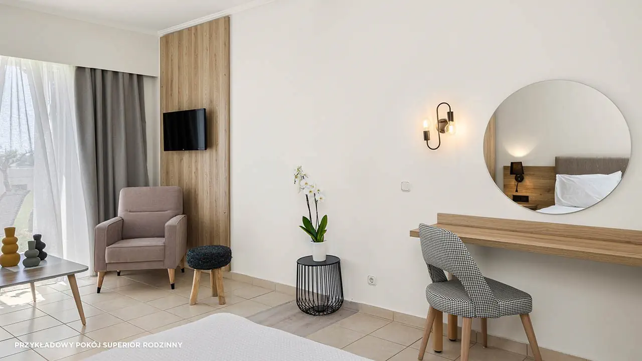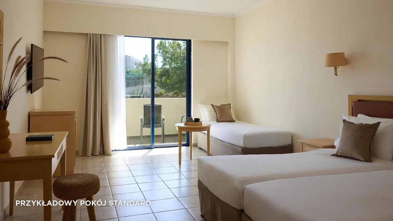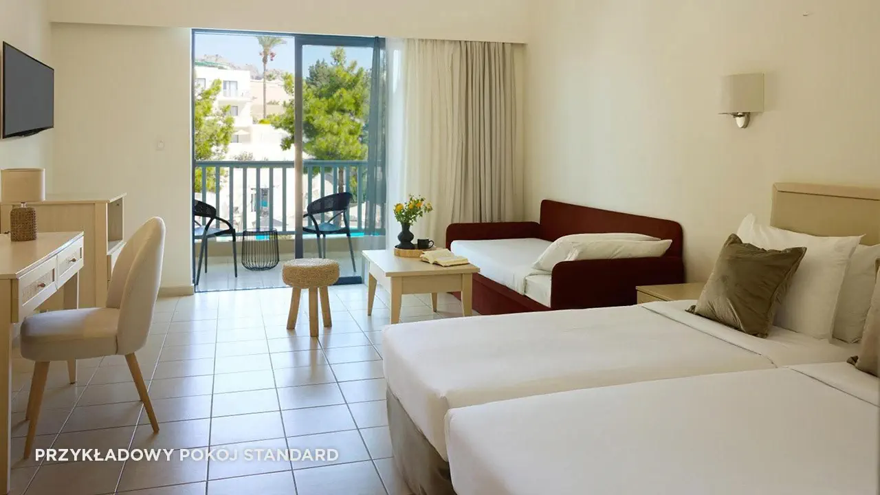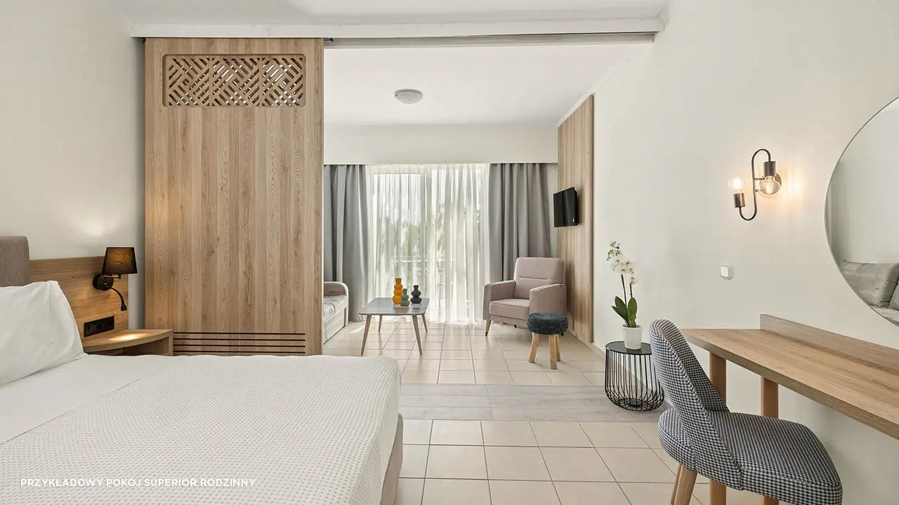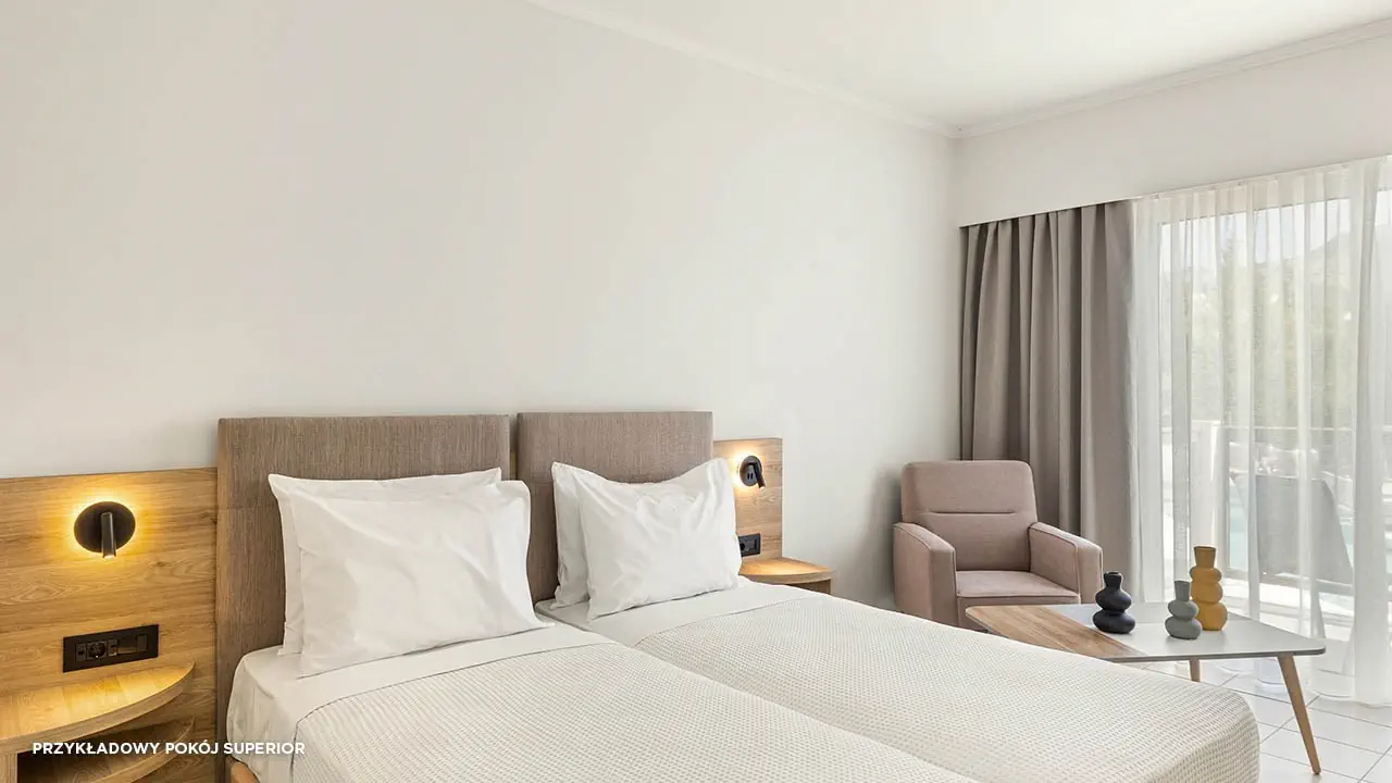 Standard• 2-3 os. (ok. 25 m2)• dostawka dla 3. osoby• klimatyzacja indywidualna (bezpłatna)• TV-SAT, telefon, mini-bar (płatny) • sejf (bezpłatny), Wi-Fi (bezpłatne)• bezpłatna woda, uzupełniania codziennie• zestaw do kawy/herbaty• łazienka - wanna/prysznic, suszarka, mini-kosmetyki• balkon (5 m2), widok na ogród• zlokalizowane w budynkach bocznych • standard widok na morze za dopłatą (budynek boczny lub główny)Pokój rodzinny• 2- 4 os. (ok. 30 m2)• dostawka dla 3. i 4. osoby• dwie sypialnie oddzielone drzwiami• zlokalizowane w budynkach bocznych • wyposażony jak pokój standardSuperior• 2-3 os. (ok. 25 m2)• modernizacja w 2023• dostawka dla 3. osoby• wyposażony jak pokój standard• superior z wid. na morze za dopłatąSuperior Rodzinny• 2-4 os. (ok. 31 m2)• modernizacja w 2023• dostawka dla 3. i 4. osoby• sypialnia oddzielona od strefy dziennej (drzwi przesuwne)• wyposażony jak pokój standard• superior rodzinny z wid. na morze lub superior rodzinny z współdz. basenem za dopłatą