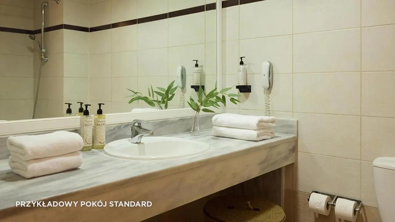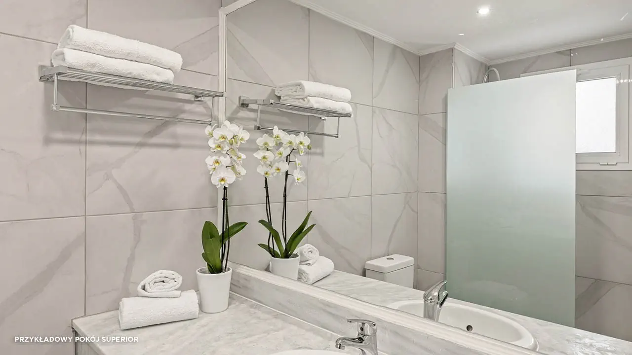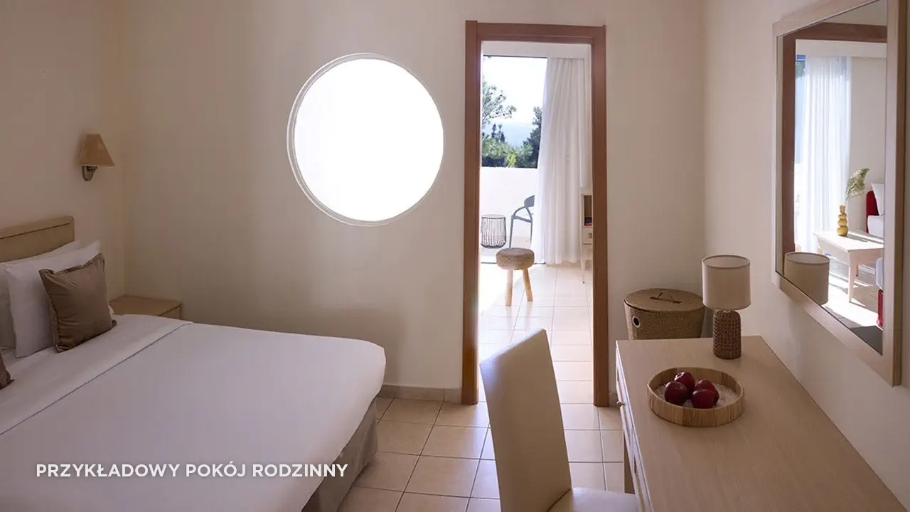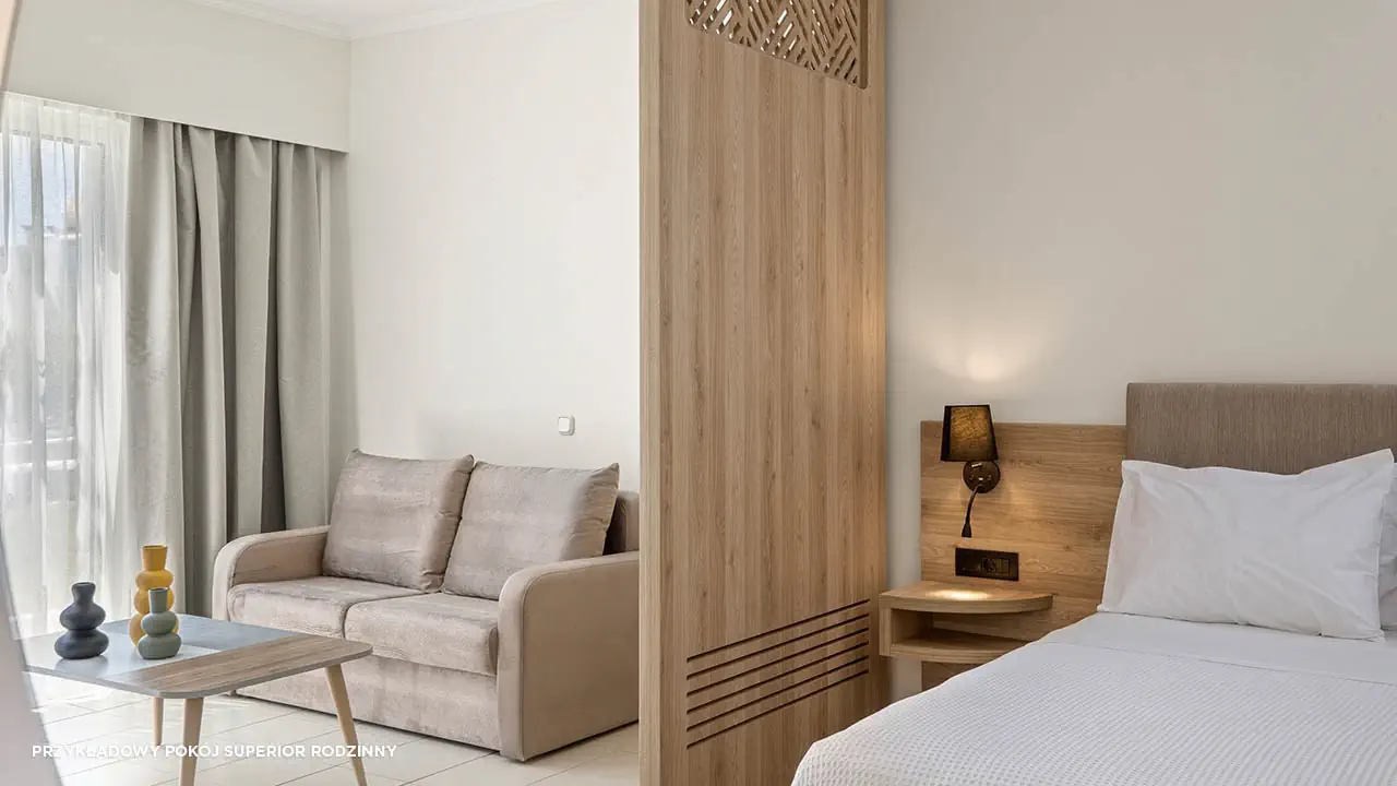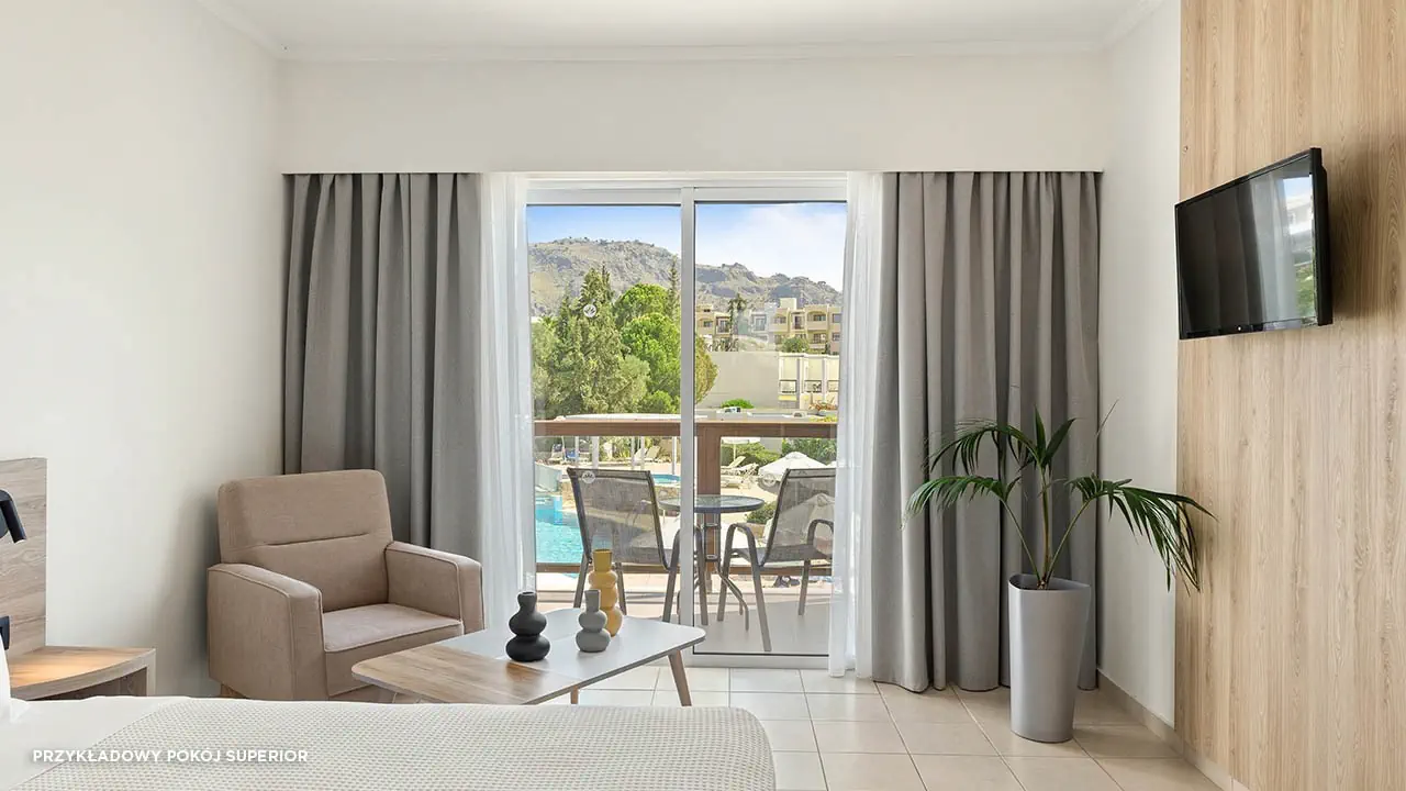 Standard• 2-3 os. (ok. 25 m2)• dostawka dla 3. osoby• klimatyzacja indywidualna (bezpłatna)• TV-SAT, telefon, mini-bar (płatny) • sejf (bezpłatny), Wi-Fi (bezpłatne)• bezpłatna woda, uzupełniania codziennie• zestaw do kawy/herbaty• łazienka - wanna/prysznic, suszarka, mini-kosmetyki• balkon (5 m2), widok na ogród• zlokalizowane w budynkach bocznych • standard widok na morze za dopłatą (budynek boczny lub główny)Pokój rodzinny• 2- 4 os. (ok. 30 m2)• dostawka dla 3. i 4. osoby• dwie sypialnie oddzielone drzwiami• zlokalizowane w budynkach bocznych • wyposażony jak pokój standardSuperior• 2-3 os. (ok. 25 m2)• modernizacja w 2023• dostawka dla 3. osoby• wyposażony jak pokój standard• superior z wid. na morze za dopłatąSuperior Rodzinny• 2-4 os. (ok. 31 m2)• modernizacja w 2023• dostawka dla 3. i 4. osoby• sypialnia oddzielona od strefy dziennej (drzwi przesuwne)• wyposażony jak pokój standard• superior rodzinny z wid. na morze lub superior rodzinny z współdz. basenem za dopłatą