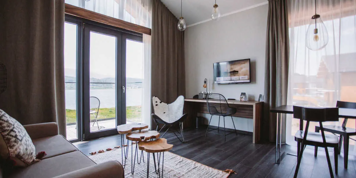 Komfortowy pokój z prywatną łazienką i balkonem z widokiem na zalew i góry. Składający się z dwóch pomieszczeń: części wypoczynkowej z sofą oraz osobnej sypialni. Wnętrze przeznaczone dla dwóch osób z możliwością dokupienia dostawek. W wyposażeniu: TV, WiFi, sejf , czajnik, zestaw do parzenia kawy i herbaty i mini barek.