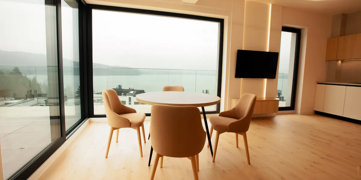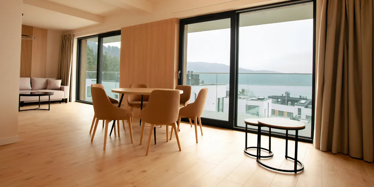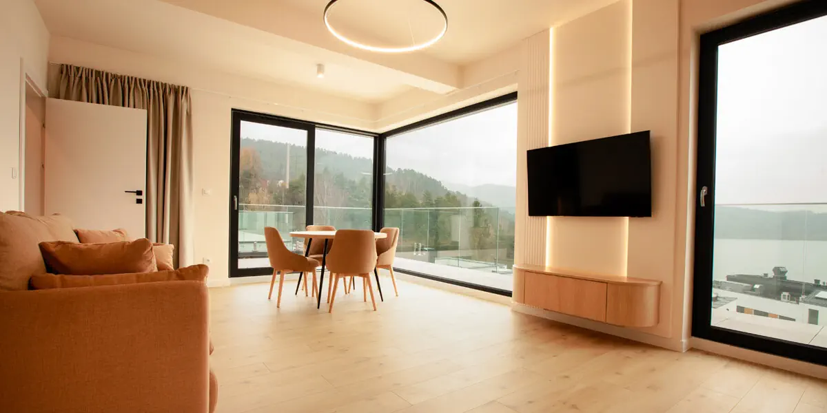Przestrzeń, która łączy wygodę osobnej sypialni z relaksującym widokiem na Jezioro Żywieckie. Część dzienna z rozkładaną sofą sprzyja spokojnym wieczorom, a aneks kuchenny w pełni pozwala stworzyć domową atmosferę. Ten apartament w Beskidach to idealne rozwiązanie dla osób, które szukają balansu między komfortem a naturą, zapewniając luksusowy wypoczynek z widokiem.