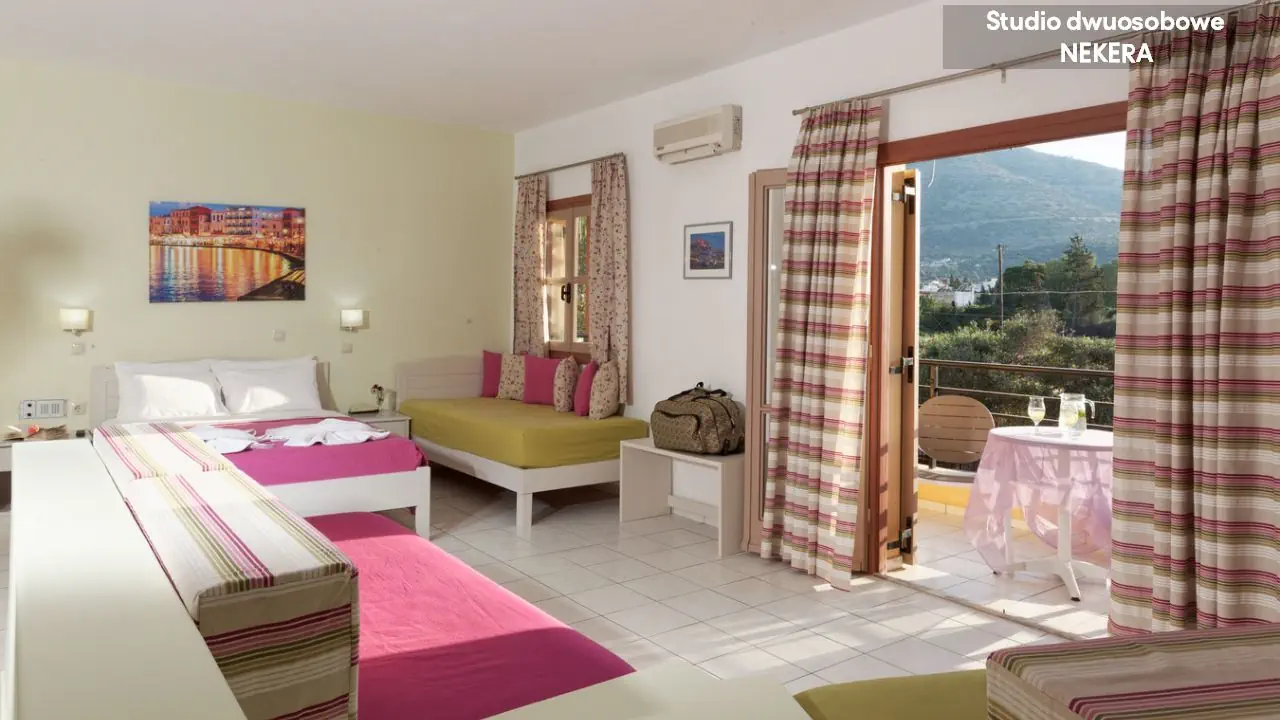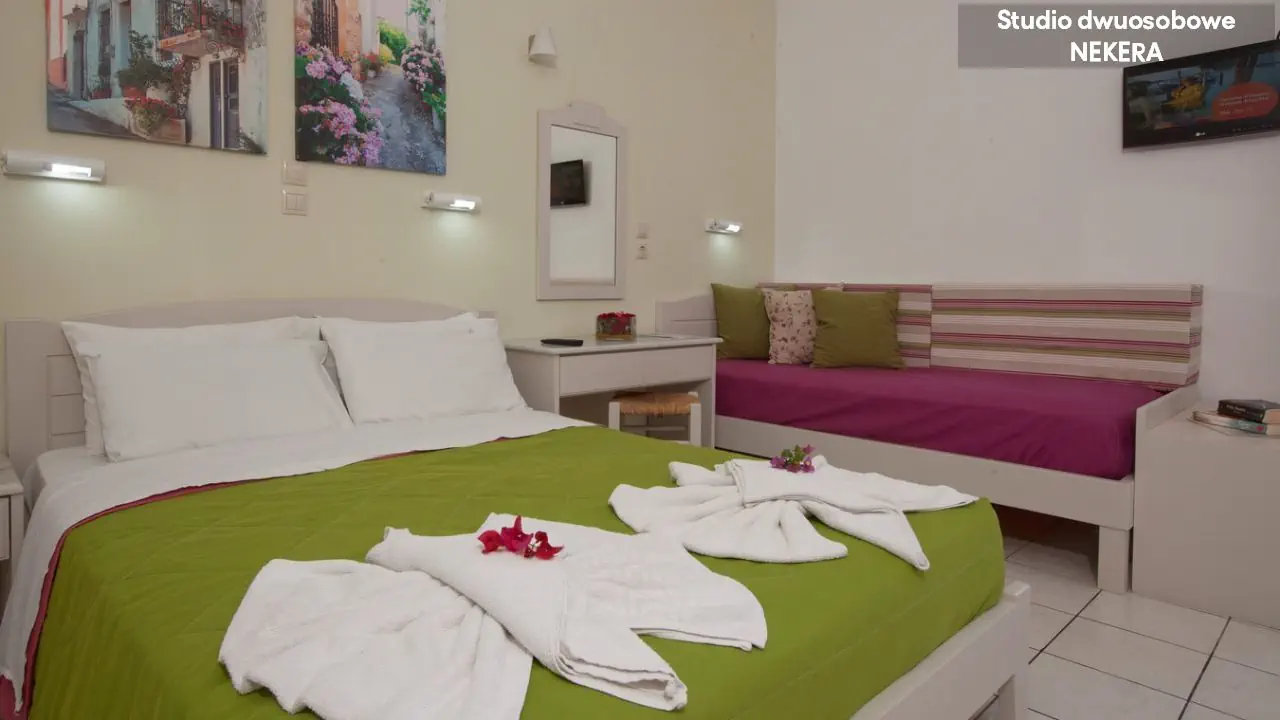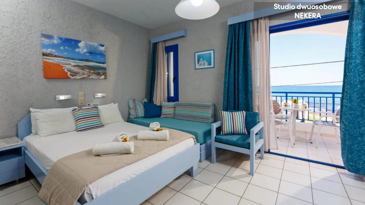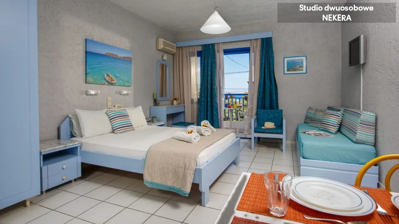 Pokoje typu Studio STUDIO ROOM: dla max. 4 os.; 1 sypialnia; prywatna łazienka (/prysznic, suszarka do włosów, WC), klimatyzacja indywidualna (płatna); sejf (płatny); lodówka; telefon; telewizja satelitarna; wyposażony aneks kuchenny, zestaw do parzenia kawy/herbaty; balkon lub taras. Apartamenty APARTMENT ROOM: dla max. 5 os.; pokój dzienny + sypialnia; prywatna łazienka (wanna, suszarka do włosów, WC), klimatyzacja indywidualna (płatna); sejf (płatny); lodówka; telefon; telewizja satelitarna; wyposażony aneks kuchenny, zestaw do parzenia kawy/herbaty; balkon lub taras.