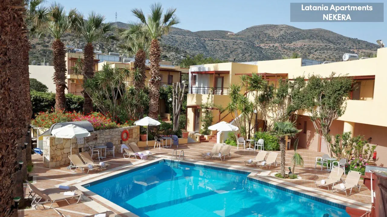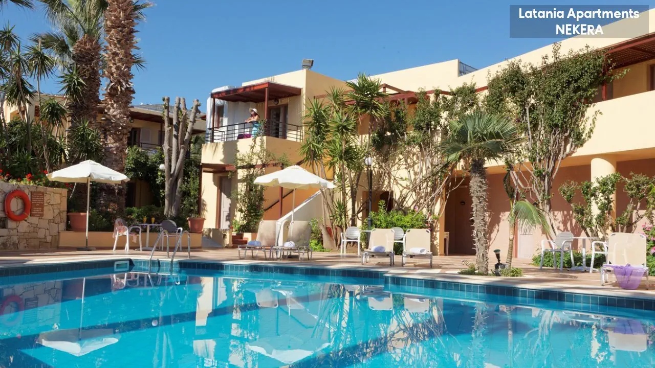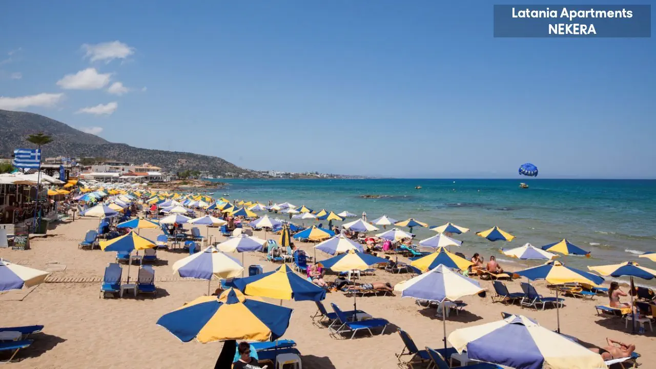 Stalida; ok. 3 km od centrum Hersonissos, ok. 2 km od centrum Malii. Port lotniczy w Heraklionie oddalony o ok. 30 km.