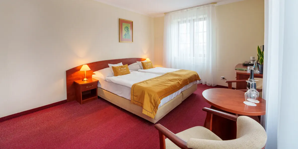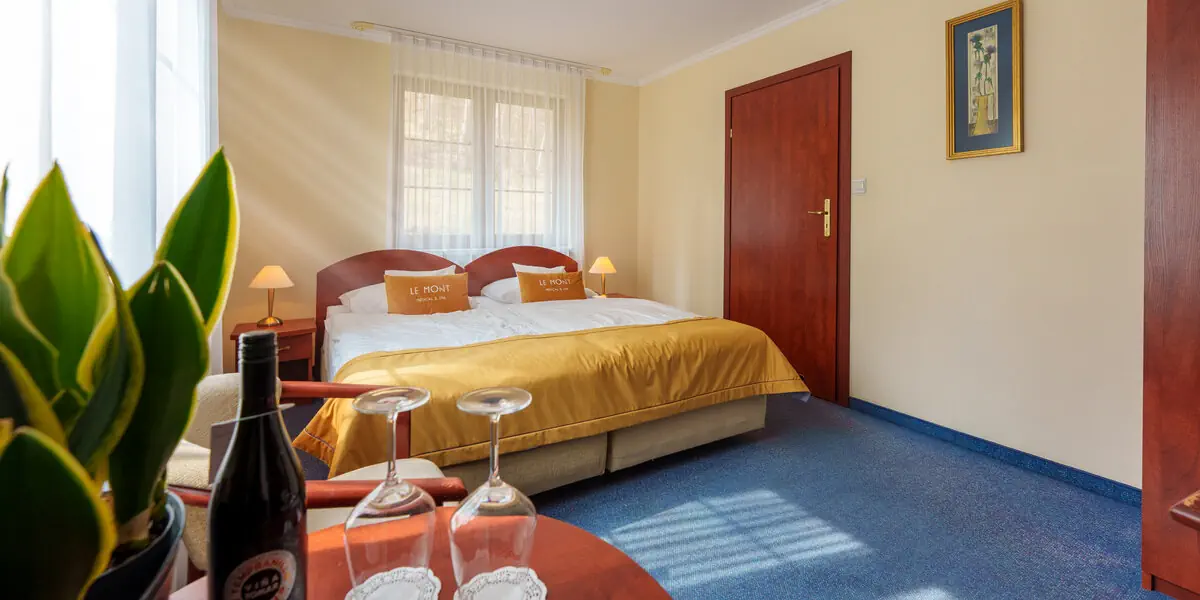 Klasycznie urządzony pokój z pięknym widokiem na panoramę Gór Izerskich. W wyposażeniu: 2 łóżka pojedyncze z możliwością złączenia, łazienka z kabiną prysznicową i suszarką do włosów, kosmetyki hotelowe, ręczniki, szlafrok, woda mineralna, TV, telefon, sejf, lodówkę, dostęp do bezprzewodowego internetu. Wszystkie pokoje przeznaczone są dla osób niepalących.