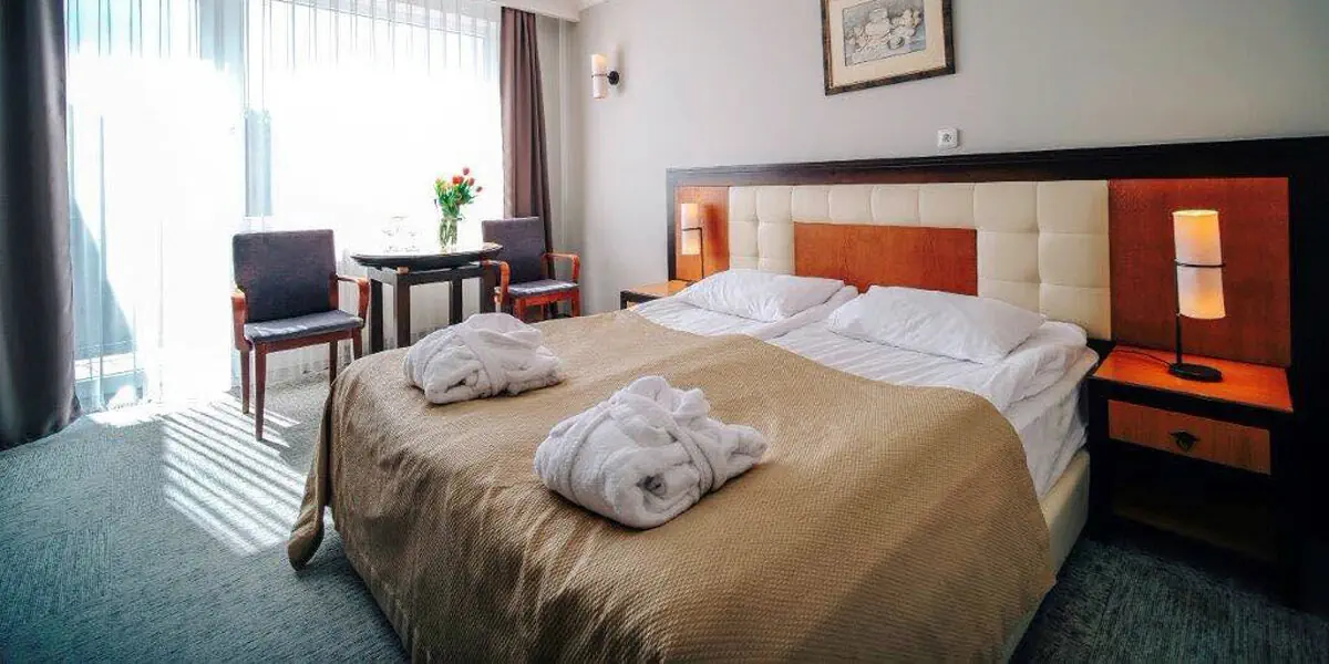 Elegancki i wygodny pokój wyposażony w TV, łącze internetowe, biurko i wodę. W łazience suszarka oraz galanteria hotelowa. Na życzenie w recepcji: deska do prasowania, żelazko, czajnik bezprzewodowy, akcesoria dla dzieci.