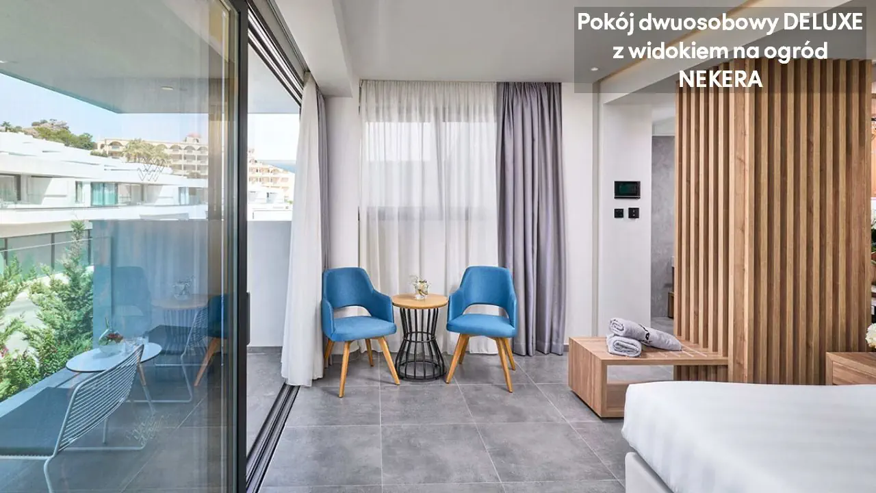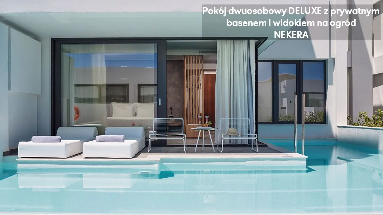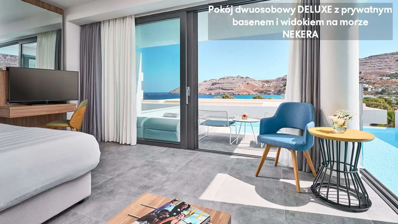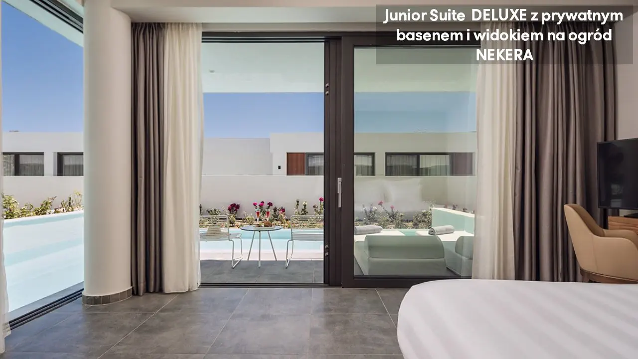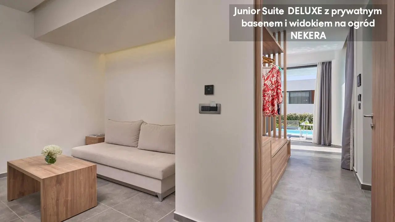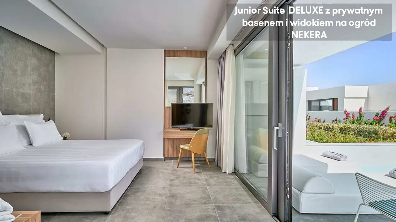 Pokój dwuosobowy Deluxe - powierzchnia 35 m² - max 2-os. - łóżko podwójne lub dwa pojedyncze - klimatyzacja - bezpłatne Wi-Fi - telewizor z płaskim ekranem - telefon - mini bar (płatny) - zestaw do parzenia kawy/herbaty - ekspres do kawy - sejf - łazienka z prysznicem - suszarka do włosów - zestaw mini kosmetyków - kapcie, szlafrok - balkon lub taras z widokiem na ogród lub morze (za dodatkową opłatą) Pokój dwuosobowy Deluxe z prywatnym basenem - powierzchnia 35 m² - max 2-os. - łóżko podwójne lub dwa pojedyncze - klimatyzacja - bezpłatne Wi-Fi - telewizor z płaskim ekranem - telefon - mini bar (płatny) - zestaw do parzenia kawy/herbaty - ekspres do kawy - sejf - łazienka z prysznicem - suszarka do włosów - zestaw mini kosmetyków - kapcie, szlafrok - taras z dostępem do prywatnego basenu widokiem na ogród lub morze (za dodatkową opłatą) Junior Suite Deluxe z widokiem na morze - powierzchnia 45 m² - max 3-os. - łóżko podwójne lub dwa pojedyncze - sofa - klimatyzacja - bezpłatne Wi-Fi - telewizor z płaskim ekranem - telefon - mini bar (płatny) - zestaw do parzenia kawy/herbaty - ekspres do kawy - sejf - łazienka z prysznicem - suszarka do włosów - zestaw mini kosmetyków - kapcie, szlafrok - balkon lub taras Junior Suite Deluxe z prywatnym basenem - powierzchnia 45 m² - max 3-os. - łóżko podwójne lub dwa pojedyncze - sofa - klimatyzacja - bezpłatne Wi-Fi - telewizor z płaskim ekranem - telefon - mini bar (płatny) - zestaw do parzenia kawy/herbaty - ekspres do kawy - sejf - łazienka z prysznicem - suszarka do włosów - zestaw mini kosmetyków - kapcie, szlafrok - taras z dostępem do prywatnego basenu i widokiem na ogród lub plażę (za dodatkową opłatą)