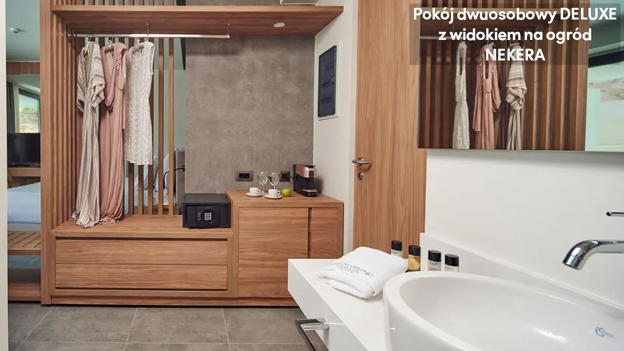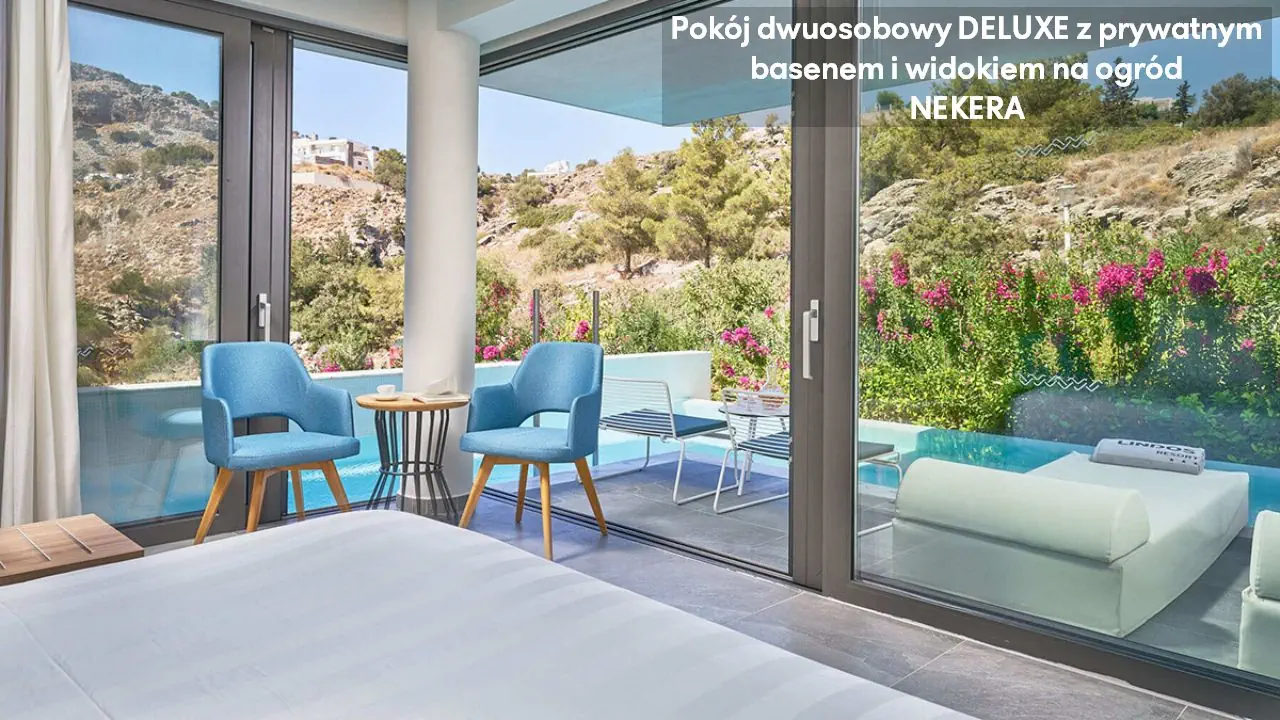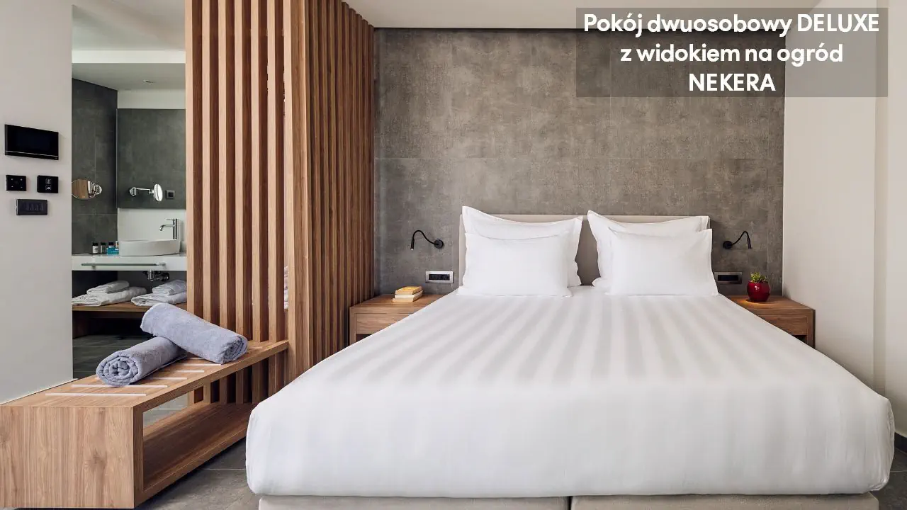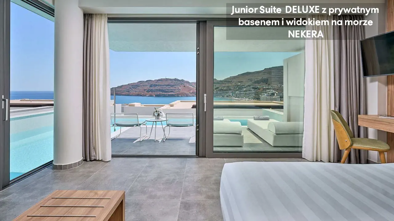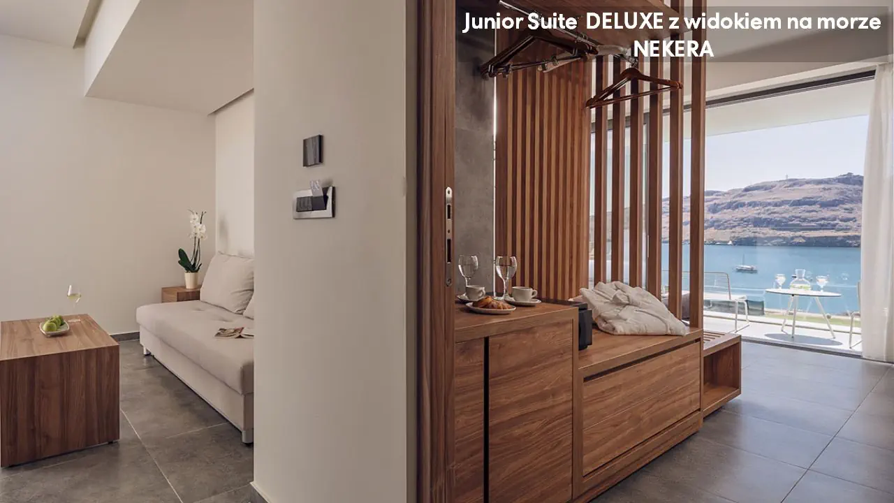 Pokój dwuosobowy Deluxe - powierzchnia 35 m² - max 2-os. - łóżko podwójne lub dwa pojedyncze - klimatyzacja - bezpłatne Wi-Fi - telewizor z płaskim ekranem - telefon - mini bar (płatny) - zestaw do parzenia kawy/herbaty - ekspres do kawy - sejf - łazienka z prysznicem - suszarka do włosów - zestaw mini kosmetyków - kapcie, szlafrok - balkon lub taras z widokiem na ogród lub morze (za dodatkową opłatą) Pokój dwuosobowy Deluxe z prywatnym basenem - powierzchnia 35 m² - max 2-os. - łóżko podwójne lub dwa pojedyncze - klimatyzacja - bezpłatne Wi-Fi - telewizor z płaskim ekranem - telefon - mini bar (płatny) - zestaw do parzenia kawy/herbaty - ekspres do kawy - sejf - łazienka z prysznicem - suszarka do włosów - zestaw mini kosmetyków - kapcie, szlafrok - taras z dostępem do prywatnego basenu widokiem na ogród lub morze (za dodatkową opłatą) Junior Suite Deluxe z widokiem na morze - powierzchnia 45 m² - max 3-os. - łóżko podwójne lub dwa pojedyncze - sofa - klimatyzacja - bezpłatne Wi-Fi - telewizor z płaskim ekranem - telefon - mini bar (płatny) - zestaw do parzenia kawy/herbaty - ekspres do kawy - sejf - łazienka z prysznicem - suszarka do włosów - zestaw mini kosmetyków - kapcie, szlafrok - balkon lub taras Junior Suite Deluxe z prywatnym basenem - powierzchnia 45 m² - max 3-os. - łóżko podwójne lub dwa pojedyncze - sofa - klimatyzacja - bezpłatne Wi-Fi - telewizor z płaskim ekranem - telefon - mini bar (płatny) - zestaw do parzenia kawy/herbaty - ekspres do kawy - sejf - łazienka z prysznicem - suszarka do włosów - zestaw mini kosmetyków - kapcie, szlafrok - taras z dostępem do prywatnego basenu i widokiem na ogród lub plażę (za dodatkową opłatą)