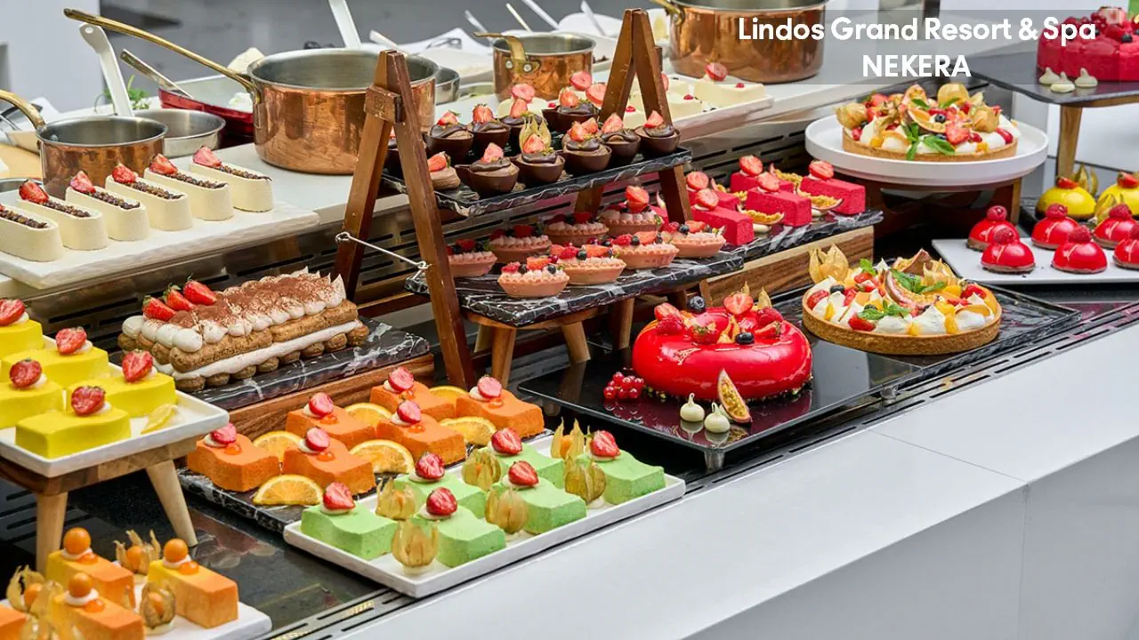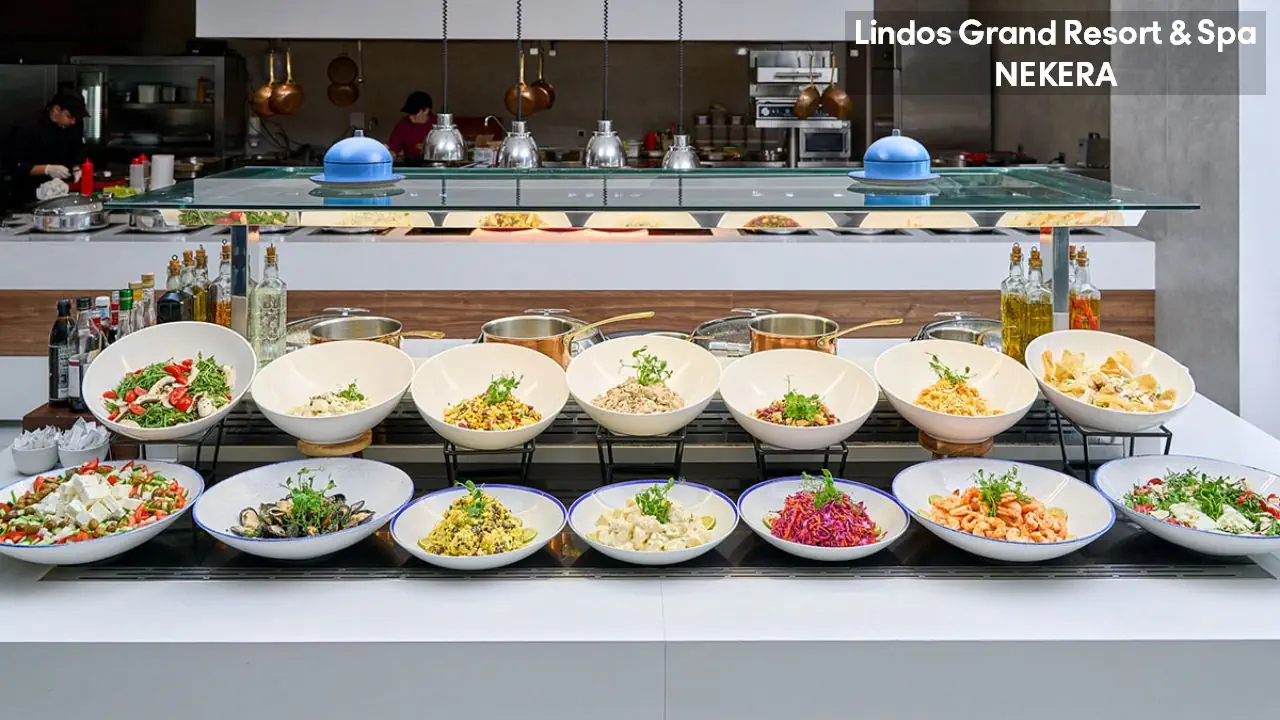 Śniadania - śniadanie 7.00-10.30 Dwa posiłki - śniadanie 7.00-10.30 - obiadokolacja (19.00 – 21.30) - restauracja a’la carte Acqua e Sale (płatna, 12.00 – 18.00) - restauracja a’la Thalatta (Fine Dining, płatna, 19.00 – 22.30, wymagana wcześniejsza rezerwacja) - restauracja a’la carte Agistri (płatna, 19.00 – 22.30, wymagana wcześniejsza rezerwacja) - restauracja a’la carte La Cucina (płatna, 19.00 – 22.30, wymagana wcześniejsza rezerwacja) - restauracja a’la carte Yume mou (płatna, 19.00 – 22.30, wymagana wcześniejsza rezerwacja) - restauracja a’la carte Takara (płatna, 19.00 – 22.30, wymagana wcześniejsza rezerwacja) - Lounge bar (płatny, 10.00 – 00.30) - Shisha Lounge (płatne,19.00 – 22.30) - Enoteca Da Giovanni (na życzenie, płatne, 19.00 – 22.00) - Cigar Lounge (płatne, 19.00 – 23.00)