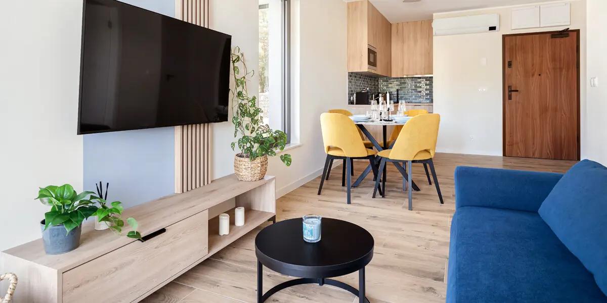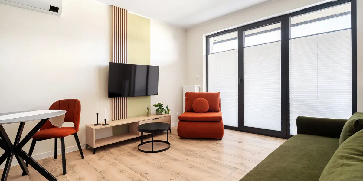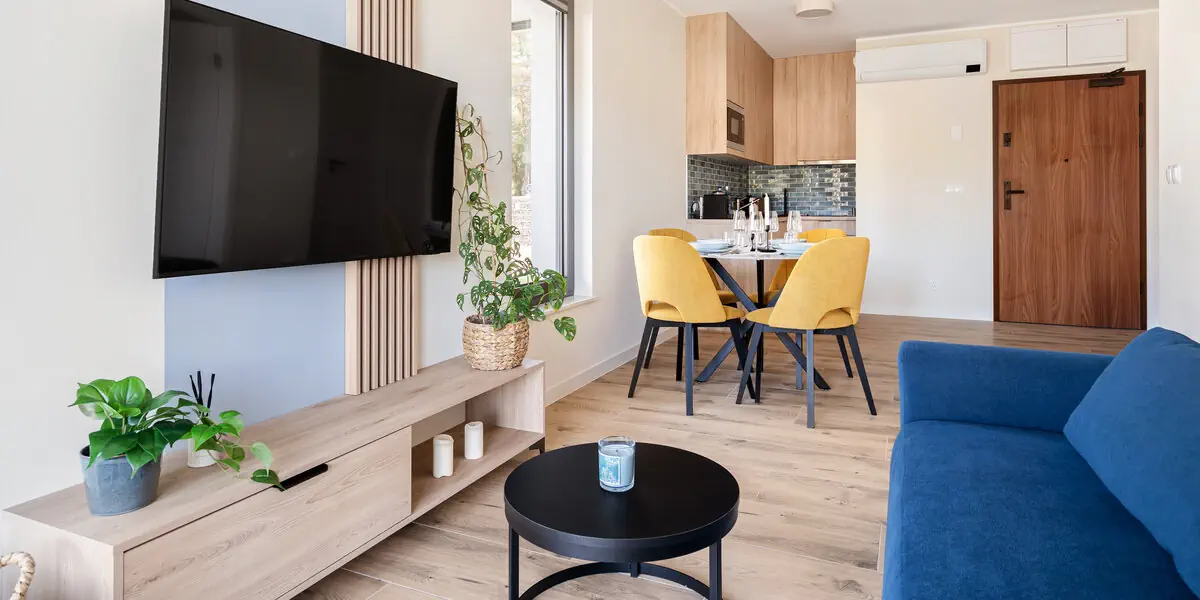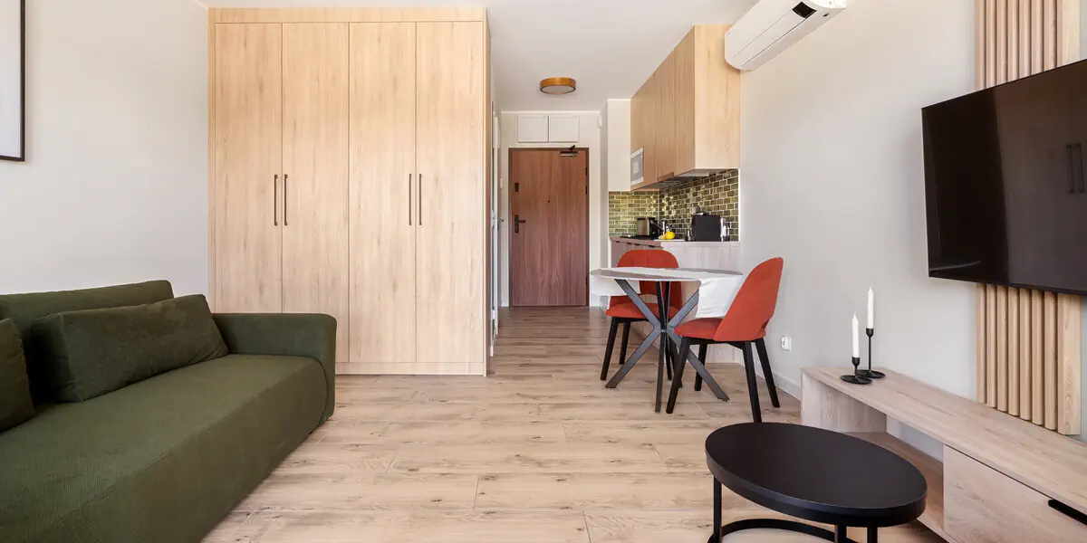 Apartament z balkonem lub tarasem, osobną sypialnią, salonem z aneksem kuchennym i łazienką
