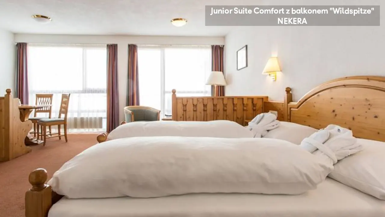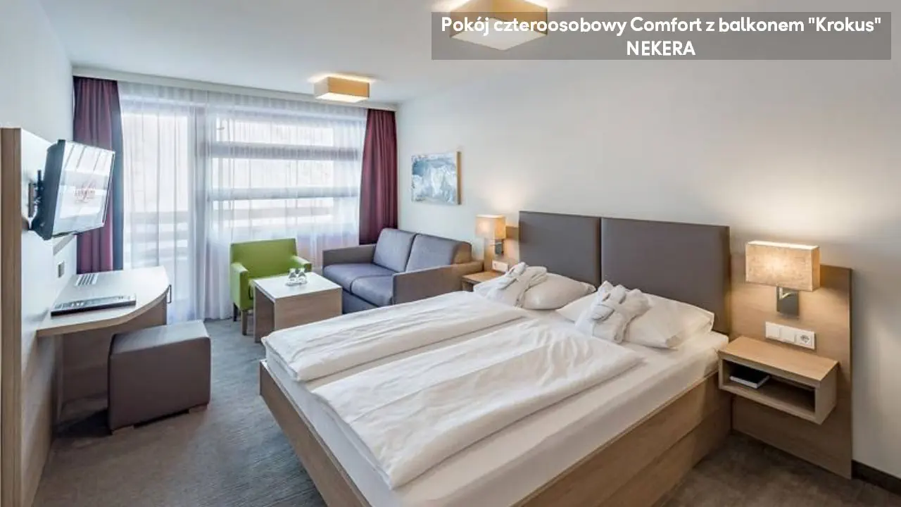 pokoje dwuosobowe "Krokus" (ok. 30 m2): wanna lub prysznic, suszarka, telefon, WiFi, TV, sejf, balkon. Junior suity (ok. 42 m2): wyposażone jak pokoje dwuosobowe. Pokoje rodzinne (ok. 45 m2): wyposażone jak pokoje dwuosobowe, pomieszczenie mieszkalno - sypialne.