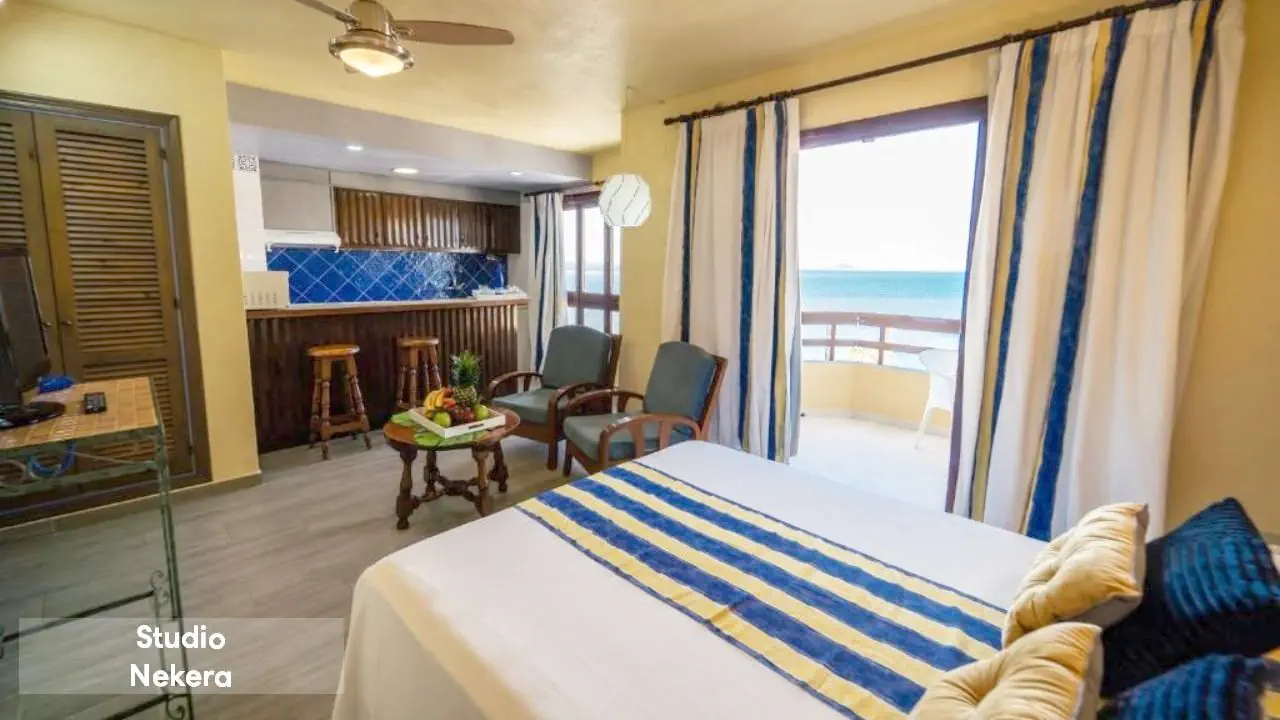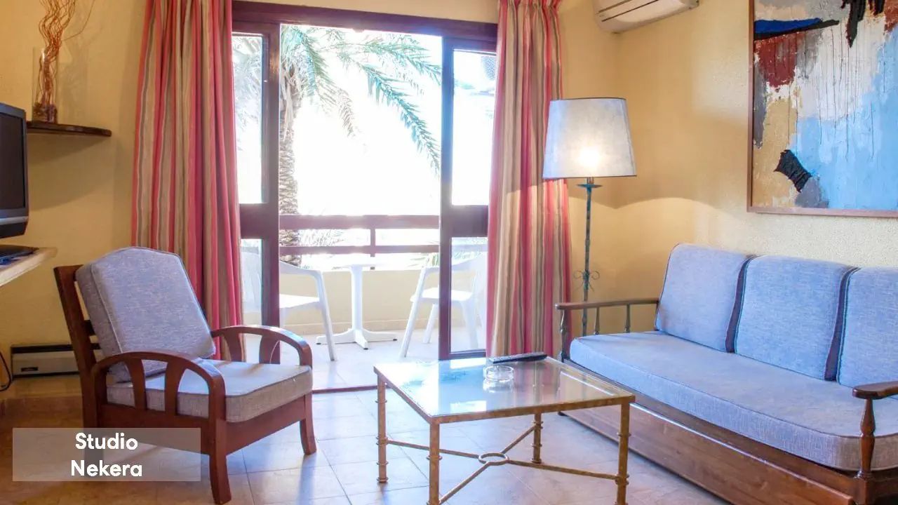 Apartament – ok. 37m2, sypialnia, aneks kuchenny z wyposażeniem (kuchenka mikrofalowa, lodówka, sztućce, naczynia, ekspres do kawy) część wypoczynkowa, TV, taras, łazienka z wyposażeniem (WC, wanna lub prysznic, bezpłatny zestaw kosmetyków, suszarka do włosów) za opłatą: sejf, klimatyzacja. Studio – ok. 37m2, sypialnia, aneks kuchenny z wyposażeniem (kuchenka mikrofalowa, lodówka, sztućce, naczynia, ekspres do kawy) część wypoczynkowa, TV, taras, łazienka z wyposażeniem (WC, wanna lub prysznic, bezpłatny zestaw kosmetyków, suszarka do włosów).