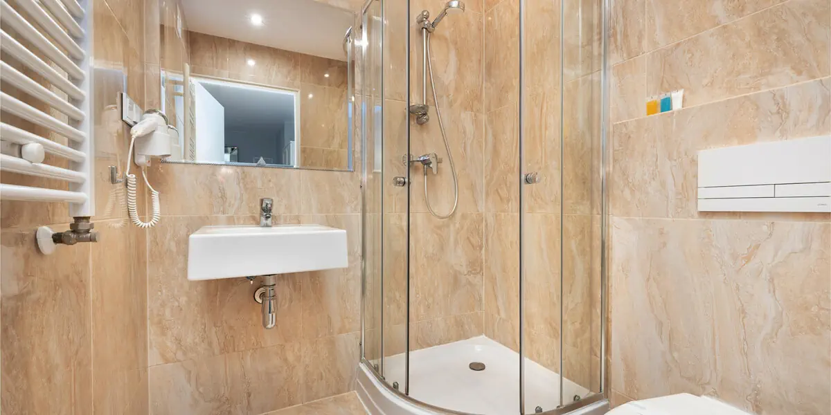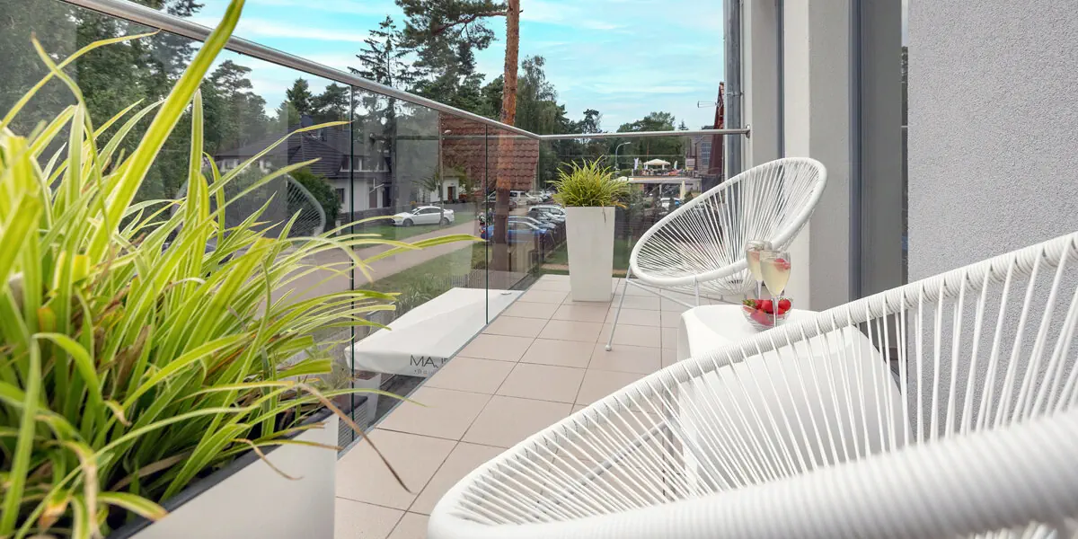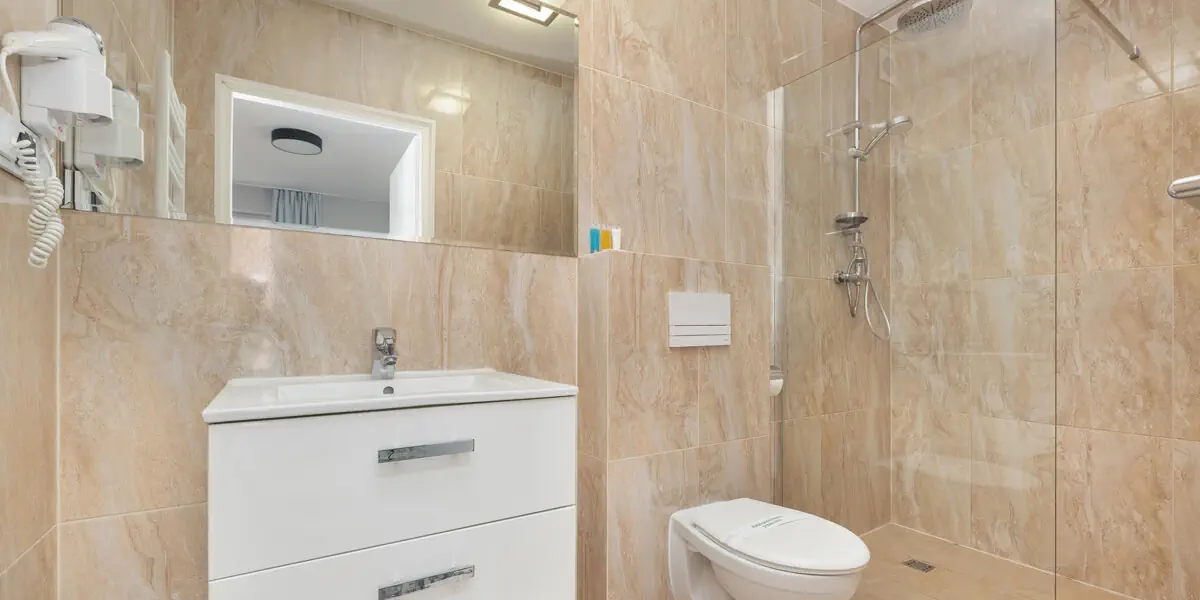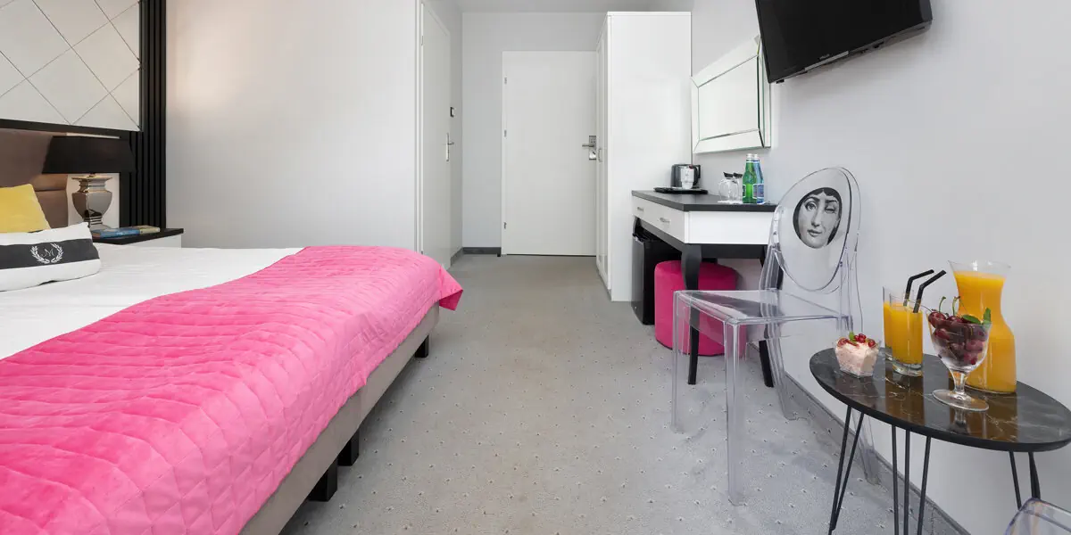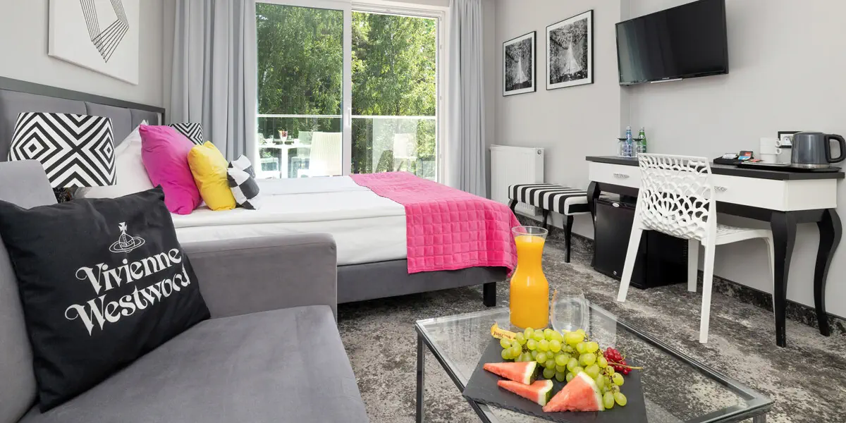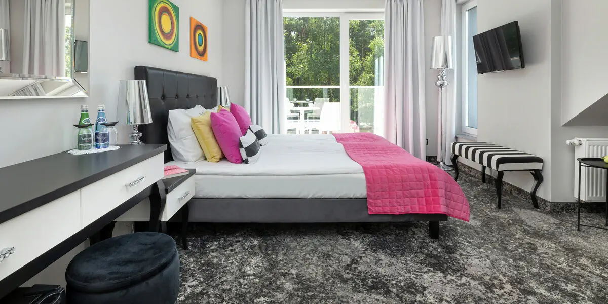Komfortowy nowoczesny pokój z balkonem i łazienką. W wyposażeniu czajnik, lodówka typu minibar, smart TV, wifi, ręczniki, kosmetyki, suszarka do włosów oraz sprzęt plażowy: koc, parawan, parasol, leżaki. Niektóre pokoje są klimatyzowane