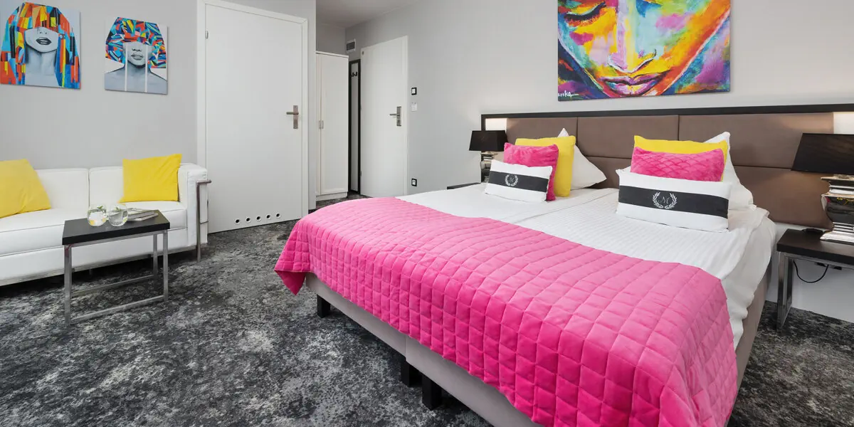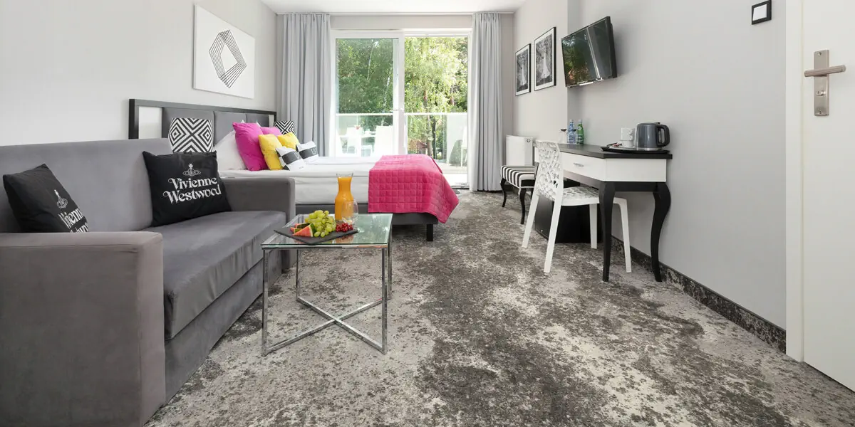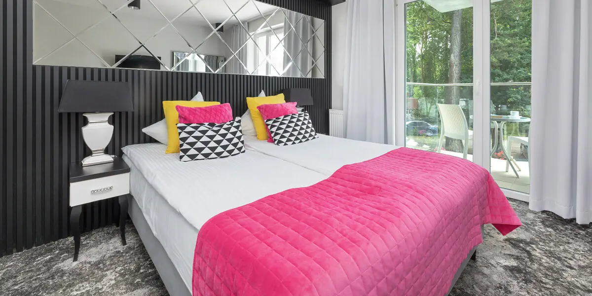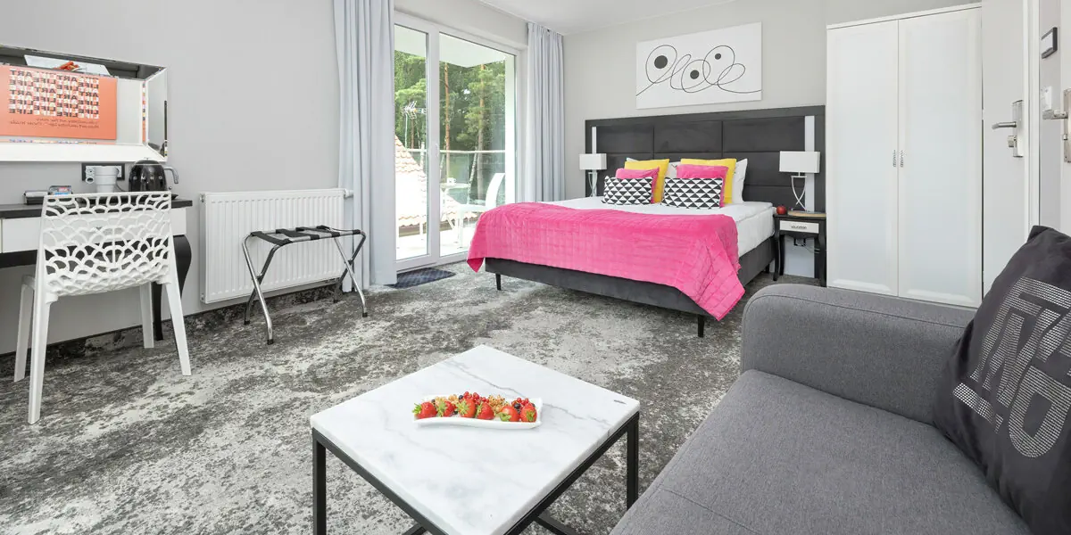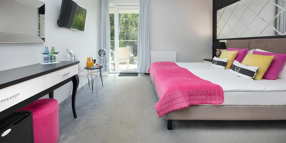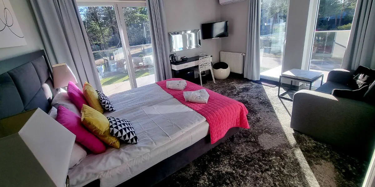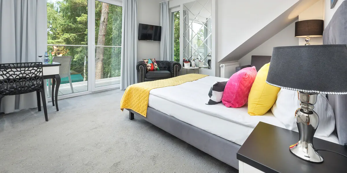 Komfortowy nowoczesny pokój z balkonem i łazienką. W wyposażeniu czajnik, lodówka typu minibar, smart TV, wifi, ręczniki, kosmetyki, suszarka do włosów oraz sprzęt plażowy: koc, parawan, parasol, leżaki.