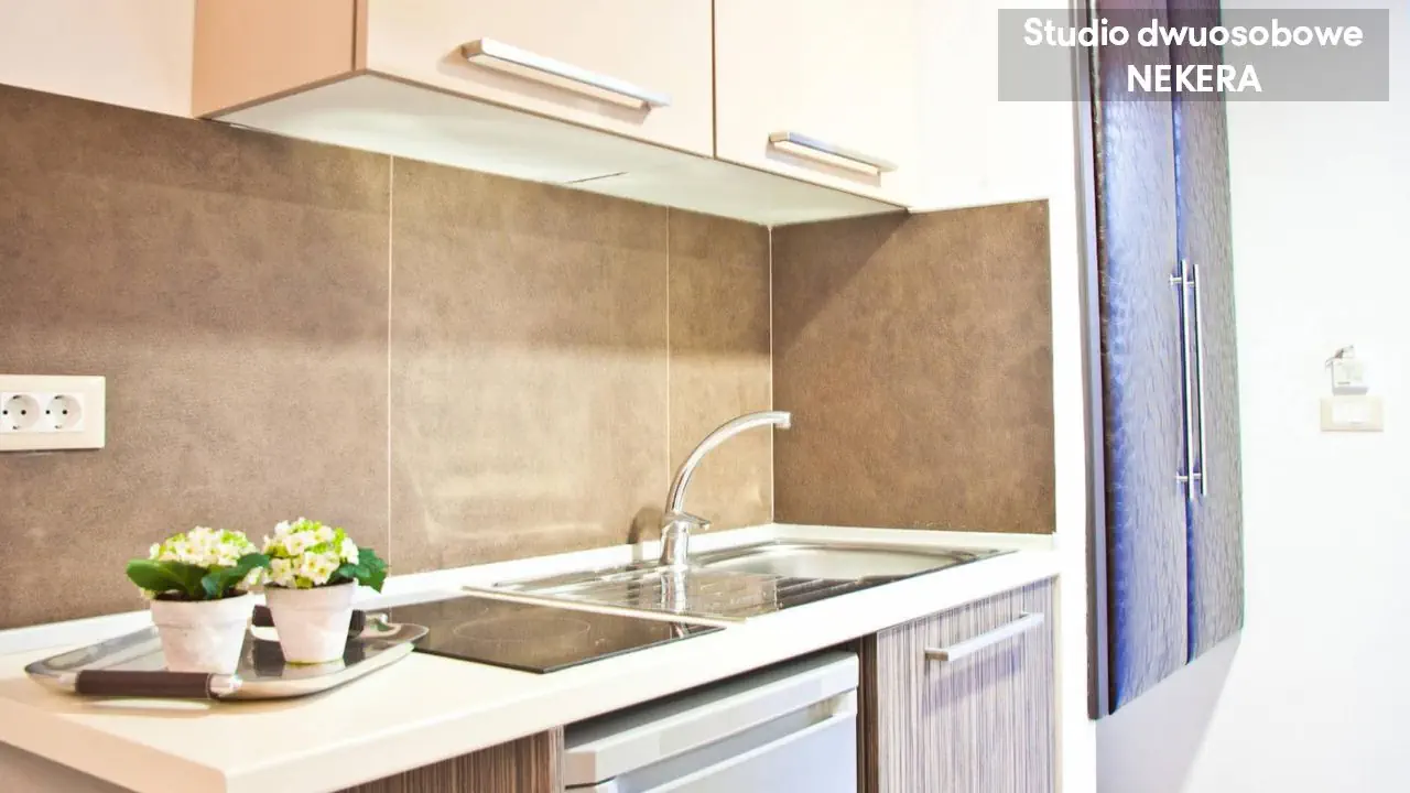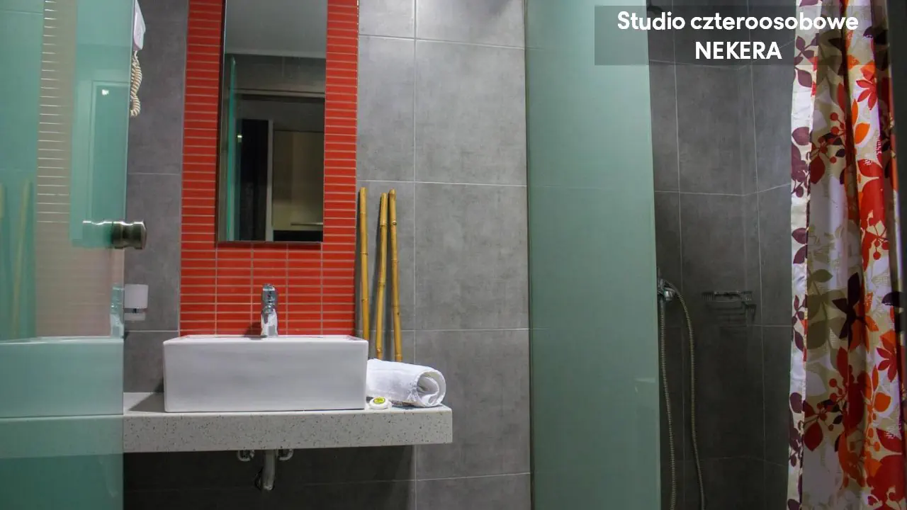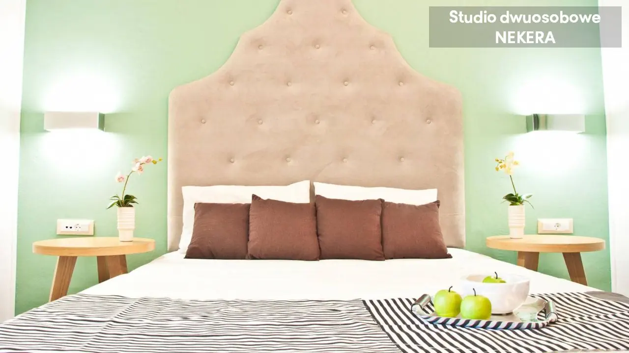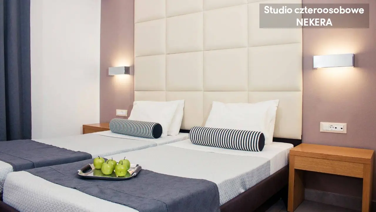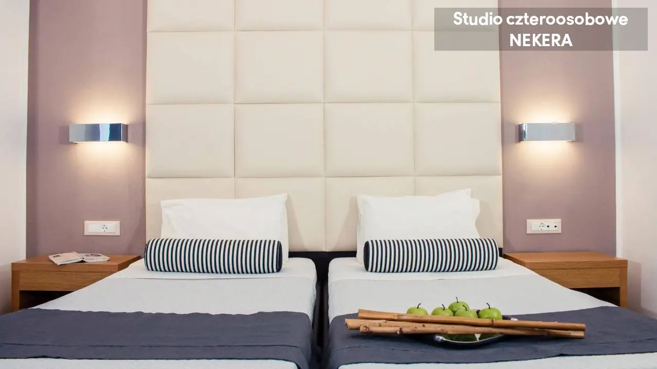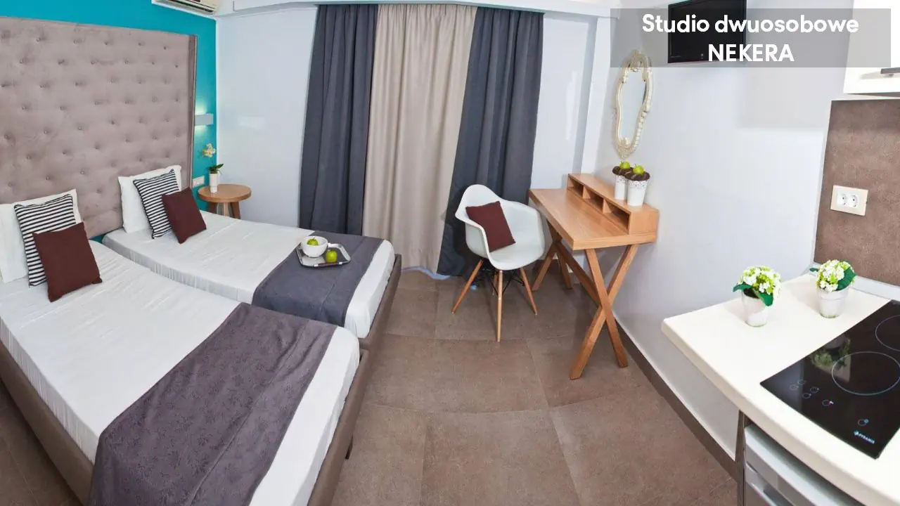 Studio dwuosobowe - powierzchnia 20 m² - max 2-os. - łóżko podwójne lub 2 łóżka pojedyncze - klimatyzacja - bezpłatne Wi-Fi - aneks kuchenny - telewizor z płaskim ekranem - telefon (płatny) - łazienka z prysznicem - suszarka do włosów - zestaw mini kosmetyków - balkon Studio czteroosobowe - powierzchnia 40 m² - max 4-os. - 2 łóżka podwójne lub 4 łóżka pojedyncze - klimatyzacja - bezpłatne Wi-Fi - aneks kuchenny - telewizor z płaskim ekranem - telefon (płatny) - łazienka z prysznicem - suszarka do włosów - zestaw mini kosmetyków - balkon