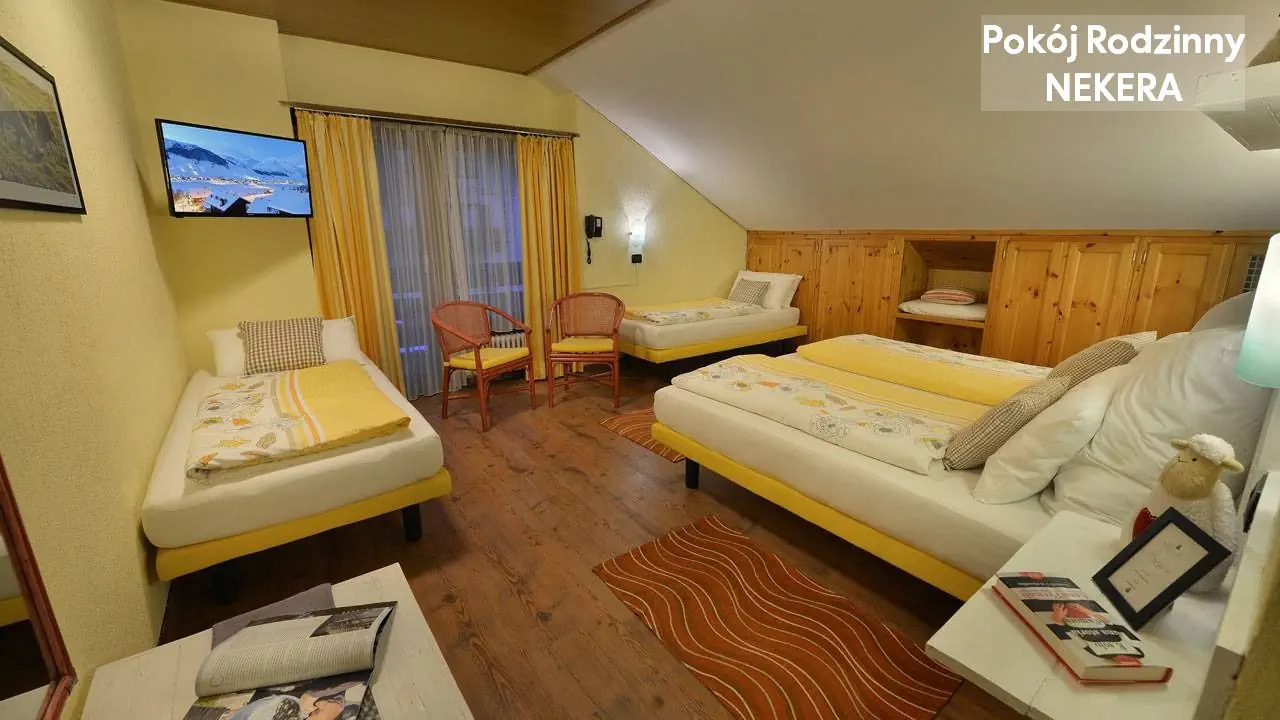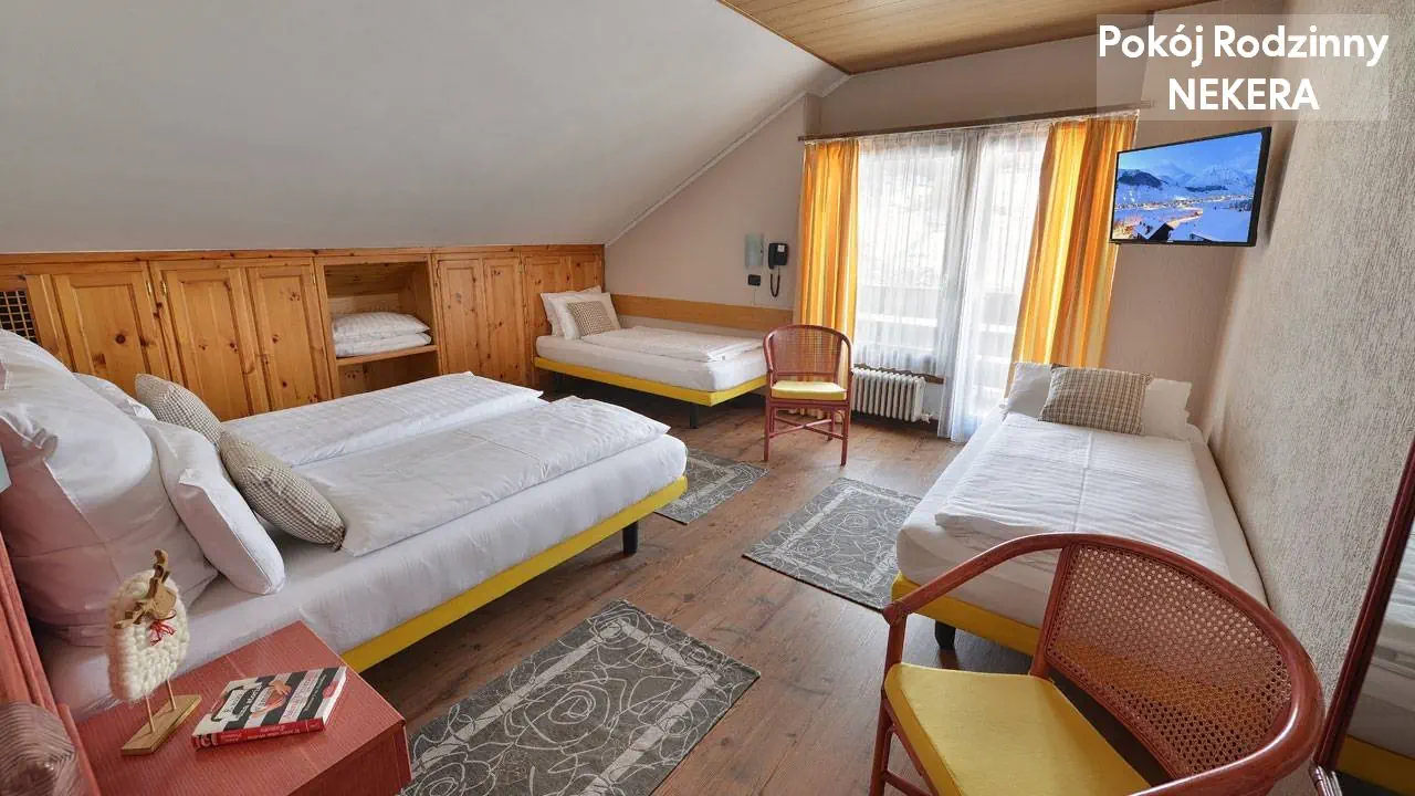 Pokoje ekonomiczne (DBL ECONOMY): ok. 14 m2, ogrzewanie, TV-Sat, telefon, sejf, lodówka, balkon, wanna lub prysznic, WC, suszarka, szlafrok, bez balkonu. Możliwa dostawka dla dziecka poniżej 16 lat. Pokoje dwuosobowe Deluxe (DBL DELUXE): ok. 16 m2; nowocześnie urządzone, dodatkowo balkon z widokiem na góry, poaz tym wyposażone jak pokoje ekonomiczne. Możliwe 1-2 dostawki dla dzieci poniżej 16 lat. Pokoje rodzinne (FAMILY): ok. 18 m2; dodatkowo balkon z widokiem na góry, poaz tym wyposażone jak pokoje ekonomiczne. Dla 4 osób (2+2 dostawki dla dzieci poniżej 16 lat.) Łóżeczko dla dziecka do 2 lat na zapytanie za opłatą 15 EUR / doba.