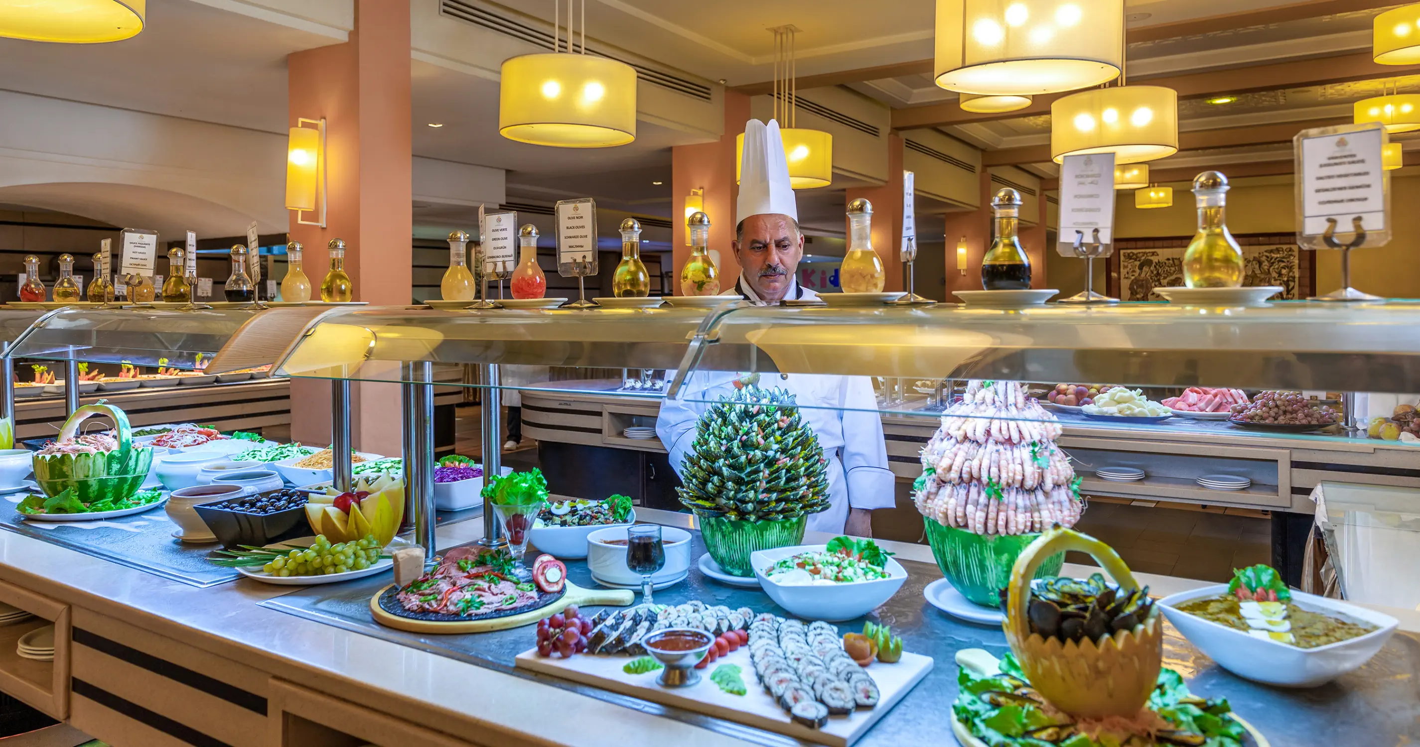 All Inclusive: - Śniadanie, obiad i kolacja w formie bufetu w określonych godzinach - Póżne śniadanie 10:00 - 11:30 - Przekąski w ciagu dnia 15:00 - 17:00 w wybranych barach - Napoje bezalkoholowe i alkohole lokalnej produkcji serwowane w wybranych barach hotelowych w godzinach ich otwarcia od 09:00 do 24:00 - Kolacja w restauracji àla carte raz na pobyt po dokonaniu wcześniejszej rezerwacji - bezpłatnie