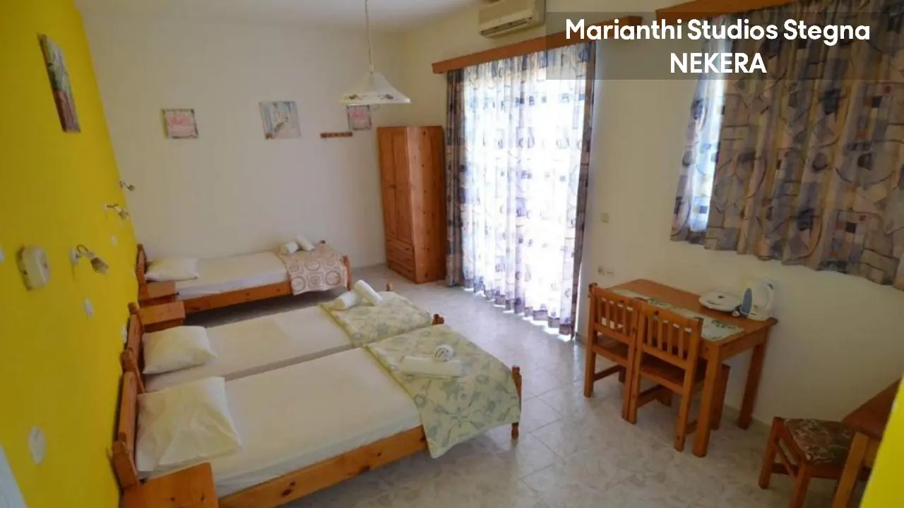 na południu wyspy, w spokojnej miejscowości Stegna; tawerny ok. 50 m; starożytne ruiny w Lindos: ok. 22 km; park wodny w Faliraki ok. 20 km; Rodos ok. 28 km. Port lotniczy Rodos oddalony o ok.35 km.