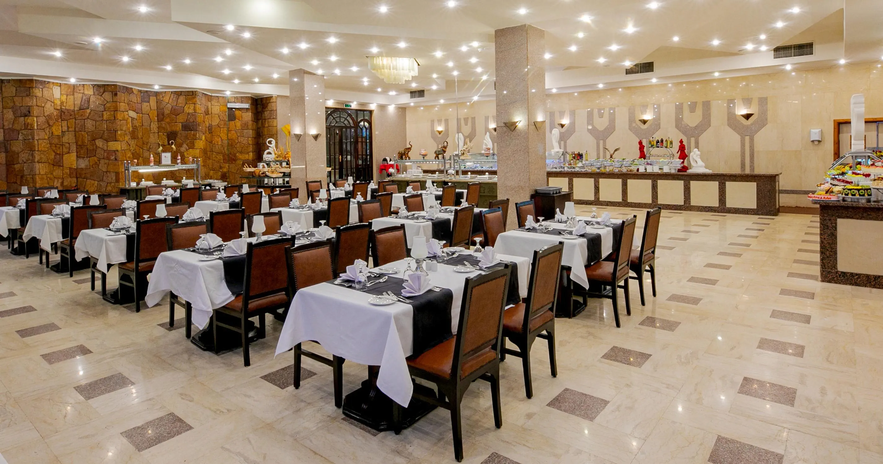 Recepcja 3 restauracje (główna oraz 2 à la carte – włoska i rybna), 5 barów Sklepiki Fitness, wellness, fryzjer - płatnie Dyskoteka 2 baseny, z których jeden przeznaczony jest dla dzieci Leżaki i parasole przy basenach bezpłatnie
