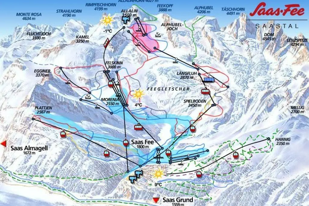 centrum Saas Fee ok. 50 m, do stacji kolejki Alpin Express ok. 400 m, ski bus ok. 20 m.
