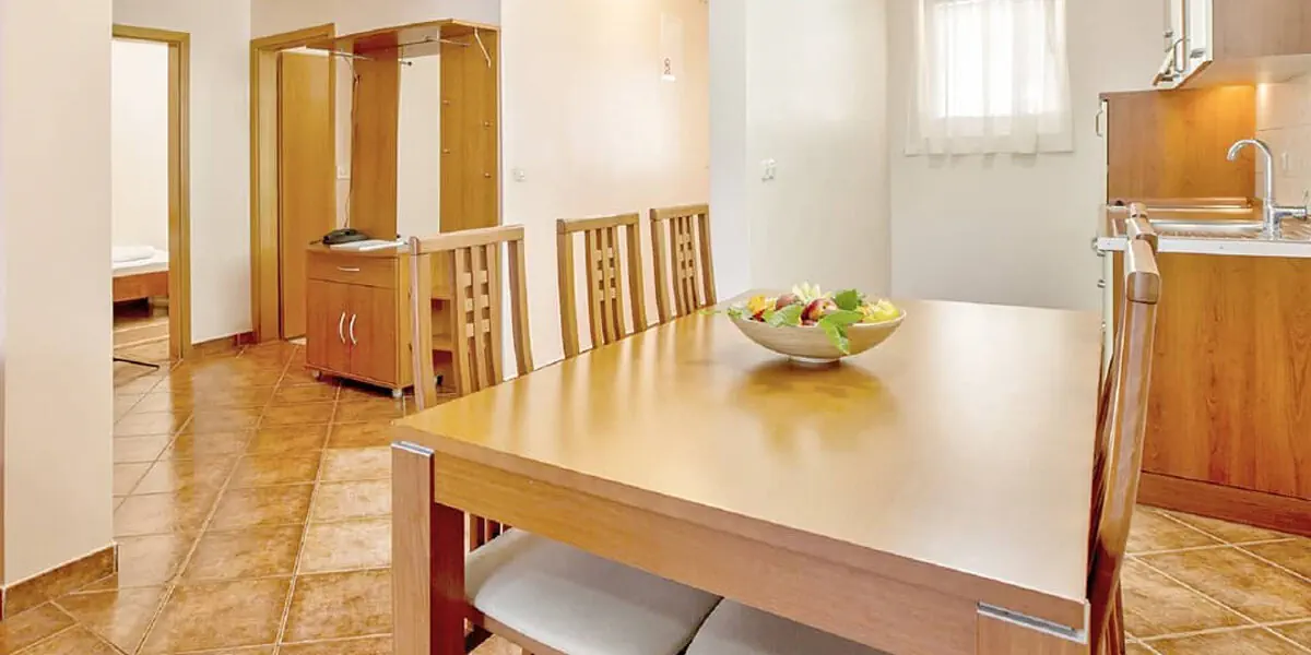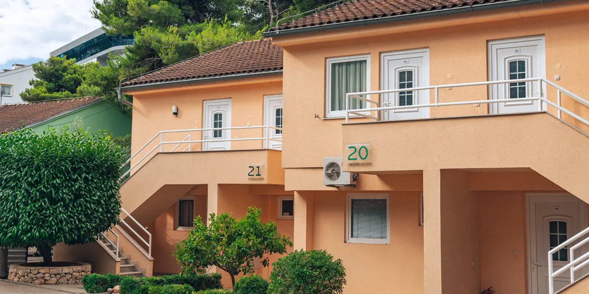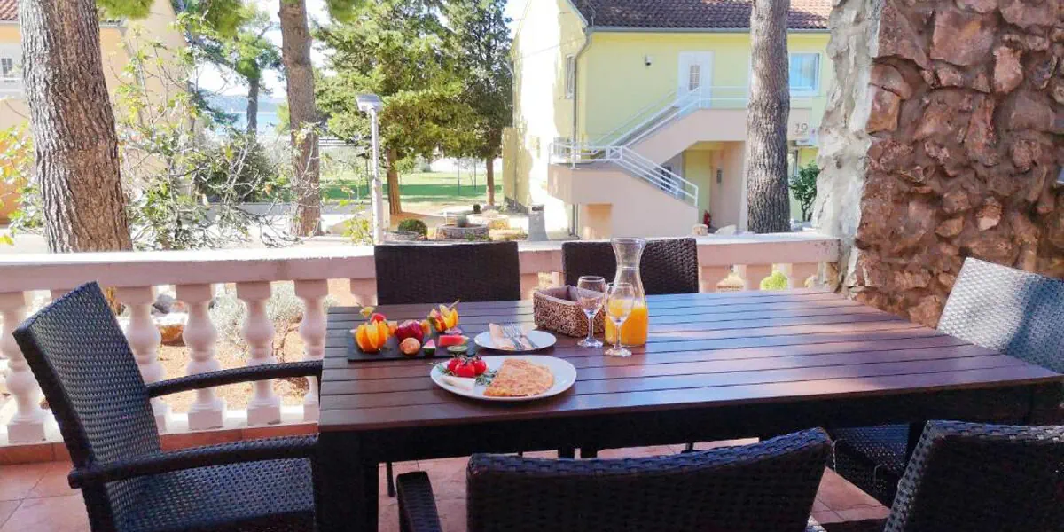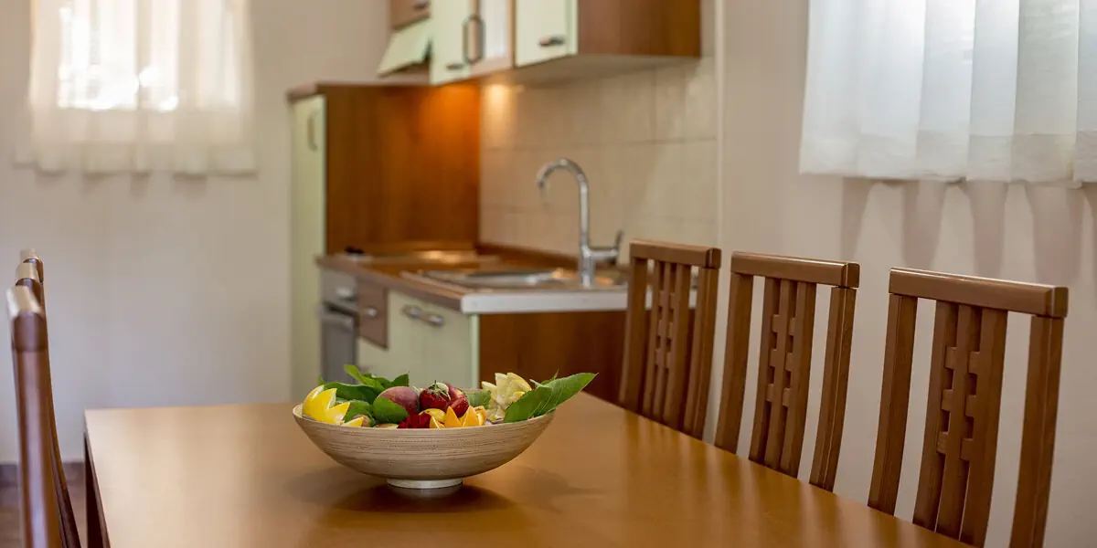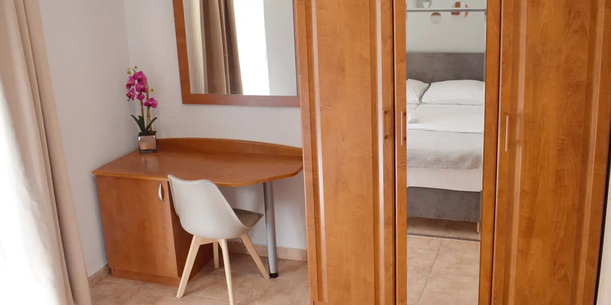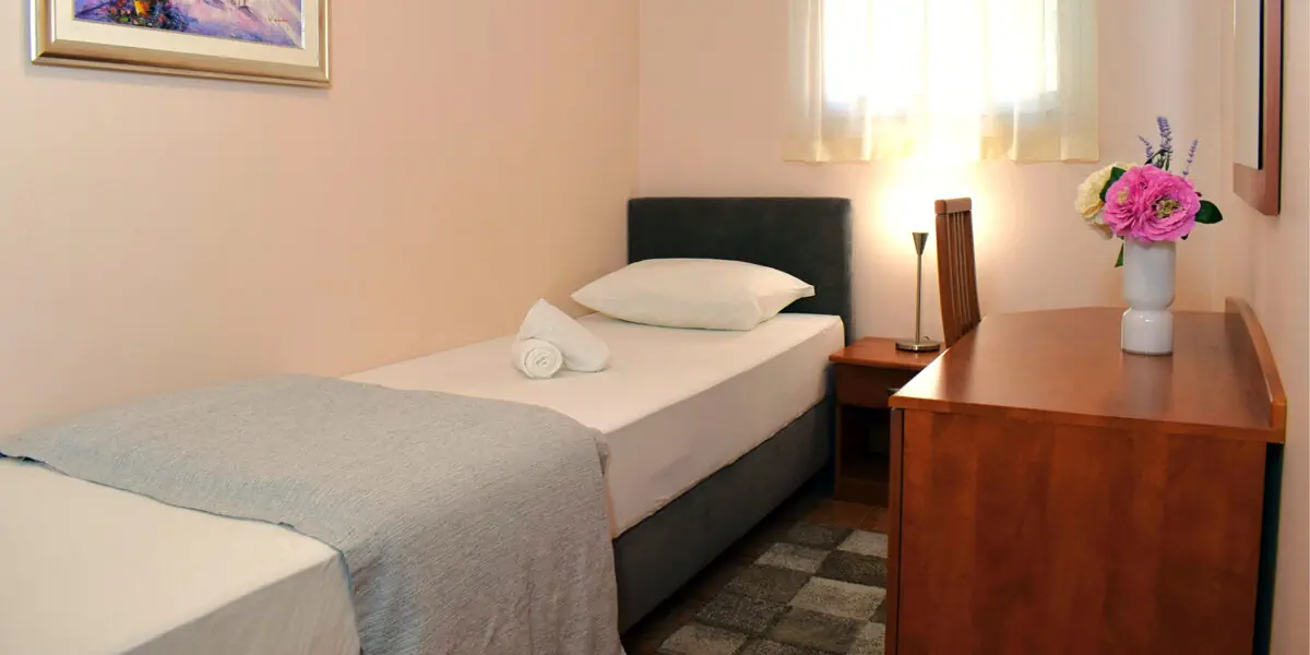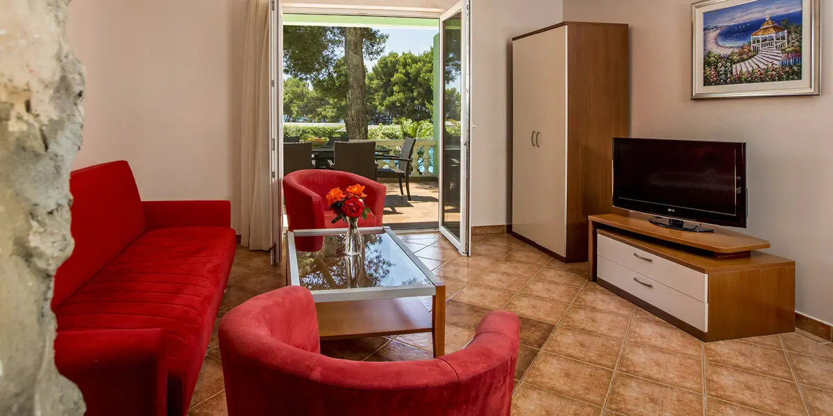 Wygodny apartament z 2 sypialniami, klimatyzacją, łazienką, tarasem. W salonie rozkładana sofa, wyposażony aneks kuchenny, stół jadalny, TV. Apartament na parterze willi z widokiem na morze