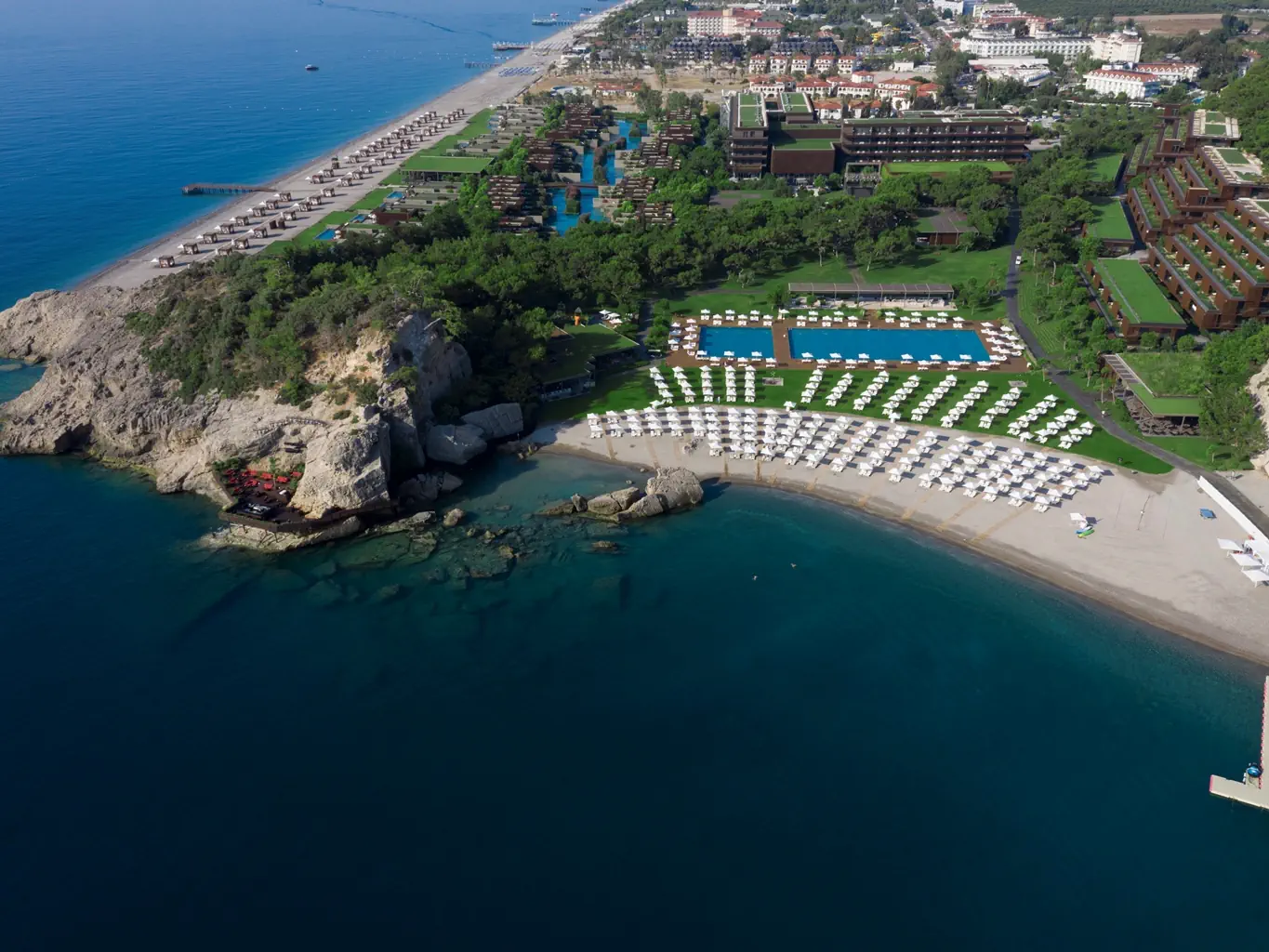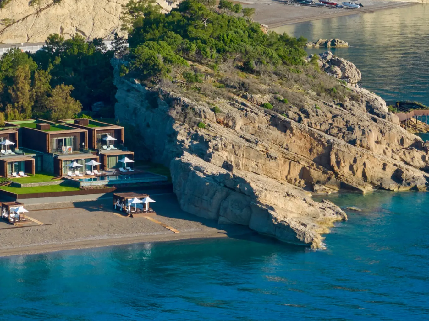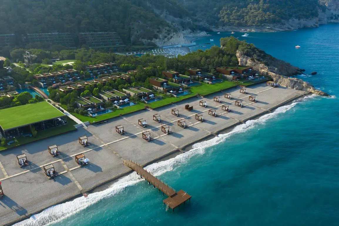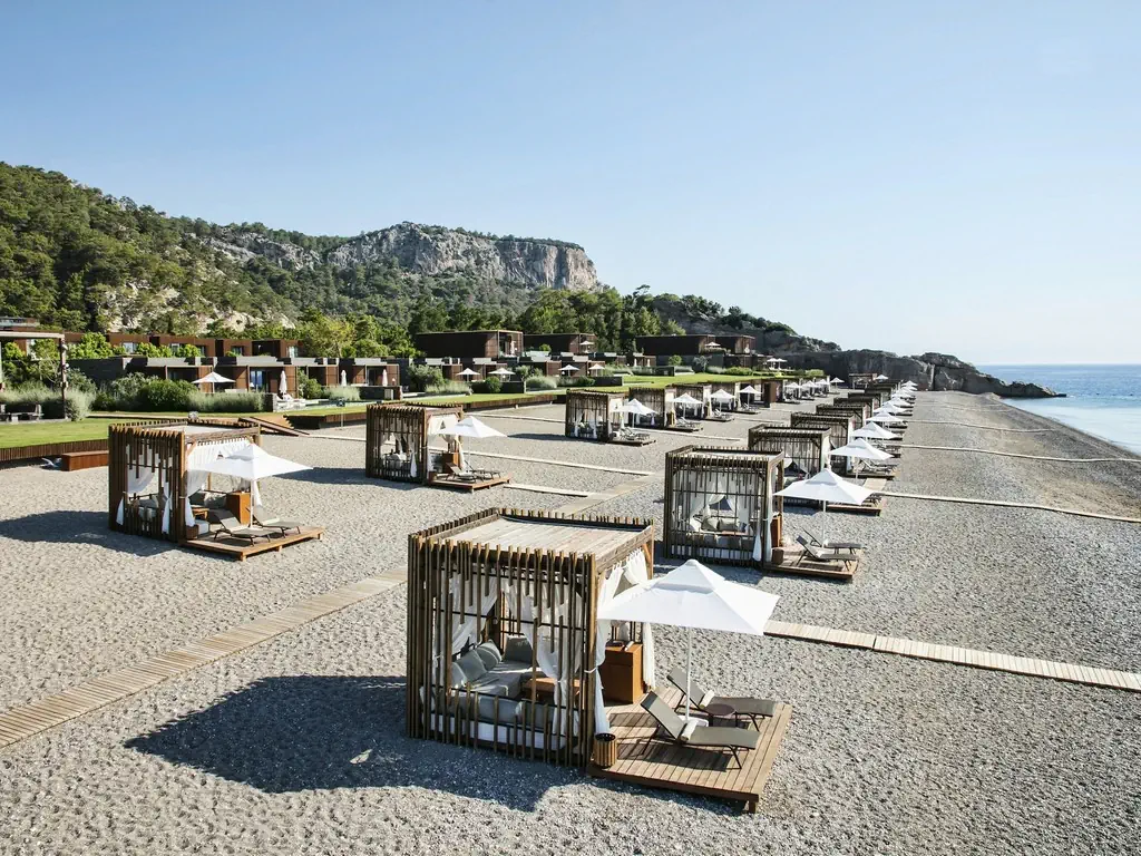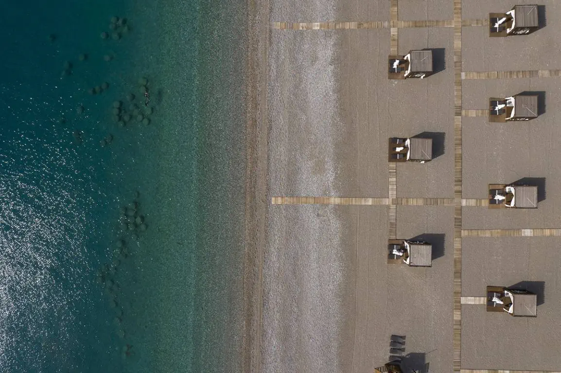 Prywatna, Piaszczysto-żwirowa, Piaszczysto-żwirowe zejście do morza, długość plaży: 800 m, pomost na plaży, Parasole - bezpłatnie, Leżaki - bezpłatnie, Ręczniki - bezpłatnie, Pawilony na plaży - płatne, Beach Bar - bezpłatnie, Prysznic