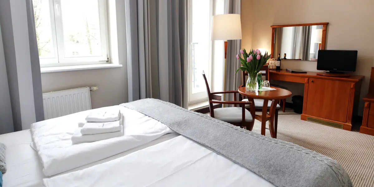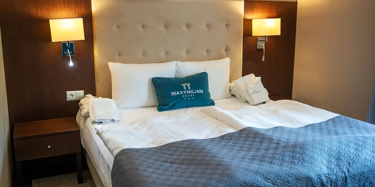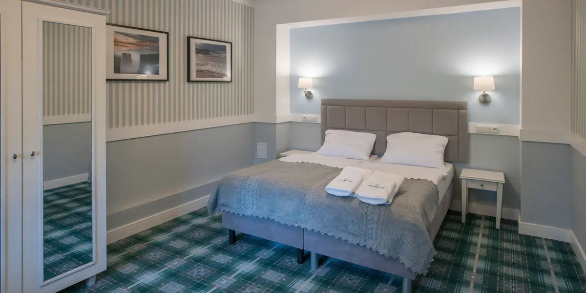 Wygodny pokój z łazienką i udogodnieniami. W pokoju typu SUPERIOR znajdzie się miejsce dla max. 4 osób dorosłych (dwie na rozkładanej sofie, szer. 160 cm).