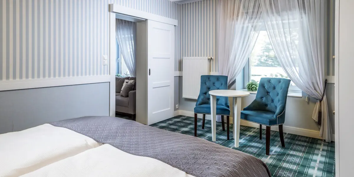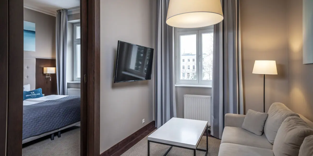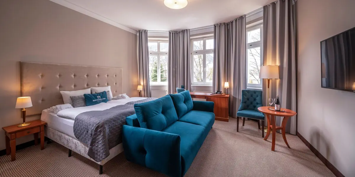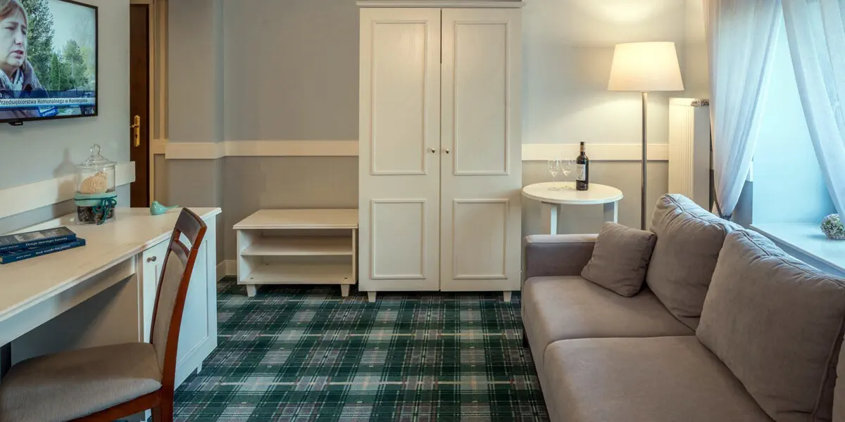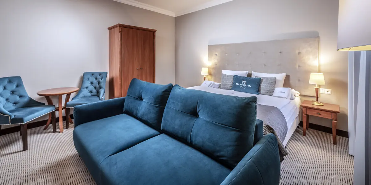 Pokój SUITE DELUXE dysponuje dwoma pomieszczeniami rozdzielonymi drzwiami o łącznej powierzchni między 33 m2 a 45 m2. W pokoju typu SUITE DELUXE znajdzie się miejsce dla max. 4 osób dorosłych (kanapa o szer. 160 cm).