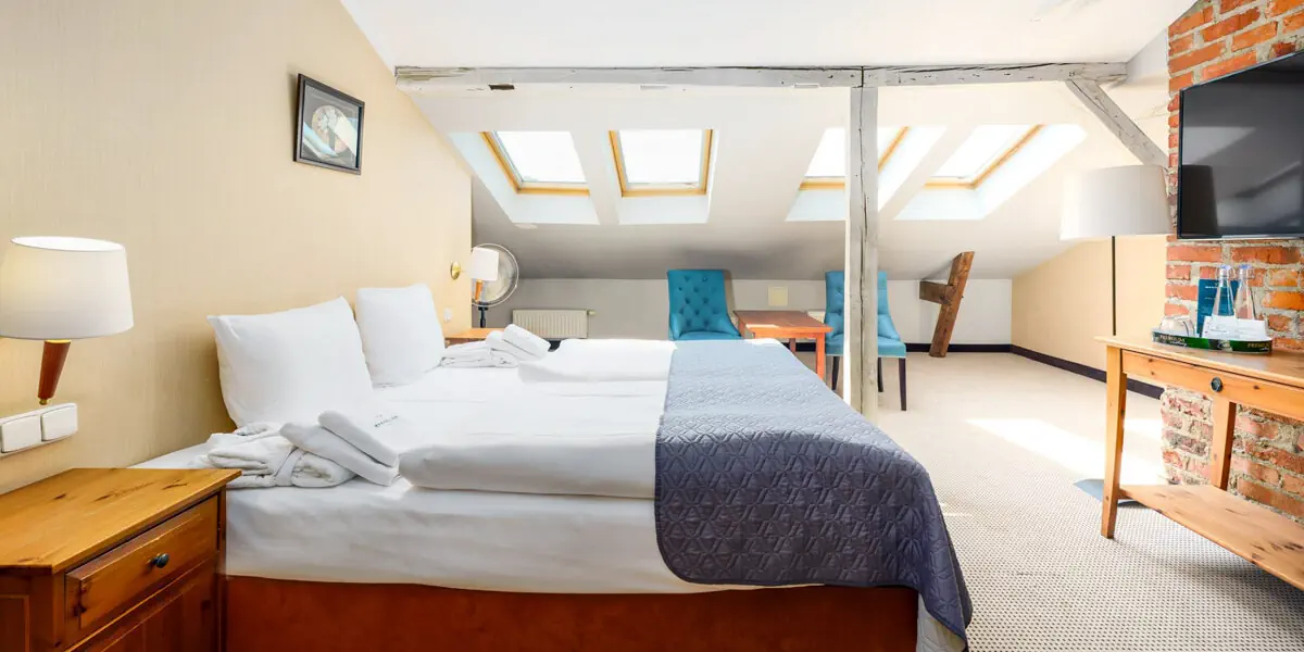 Pokój dwuosobowy w kondygnacji poddaszowej wyposażony w klimatyzator