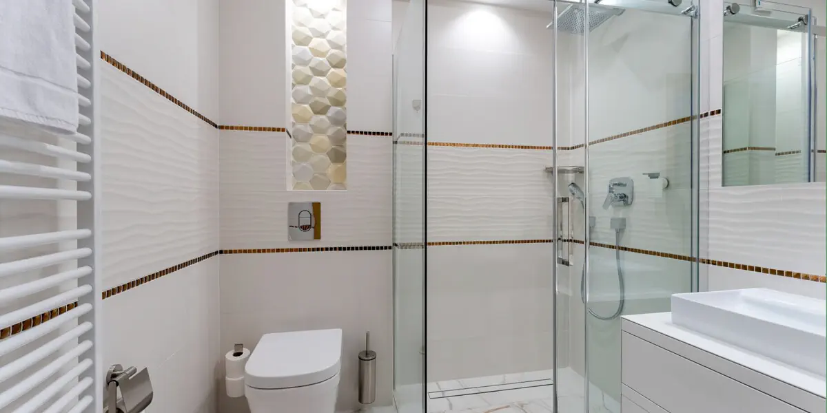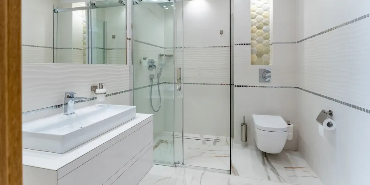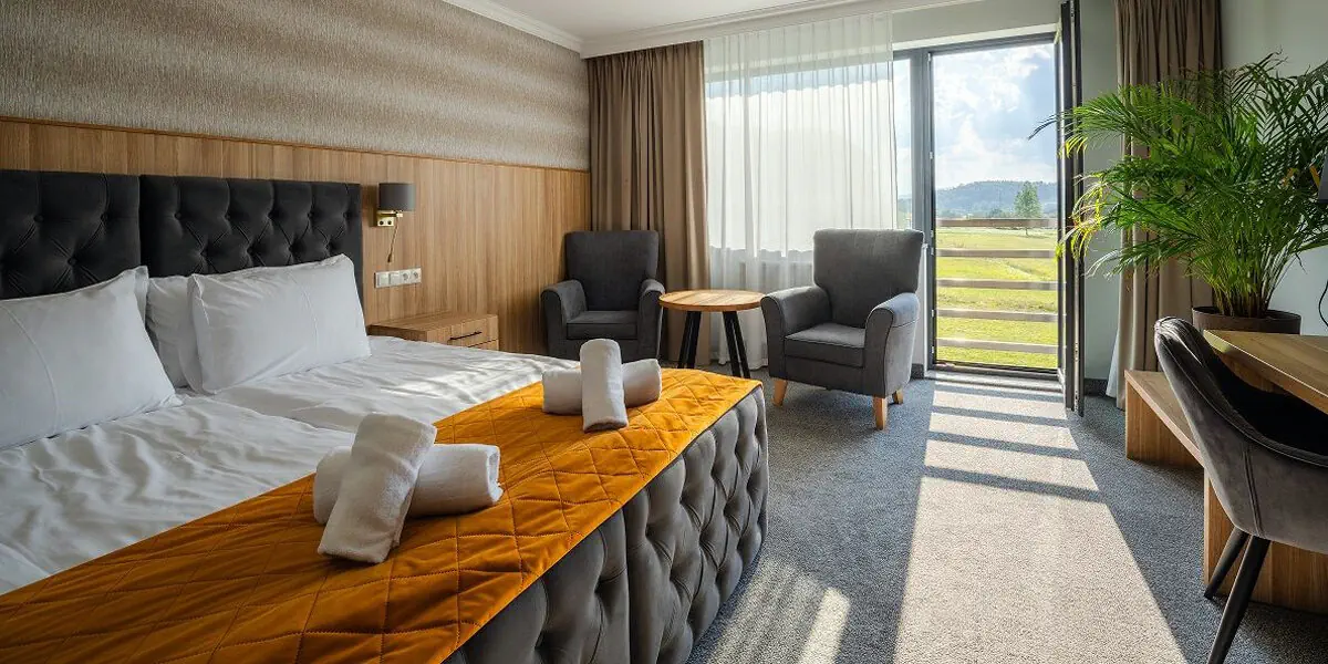 Wygodny pokój z łazienką i widokiem przez okno na łąkę i las