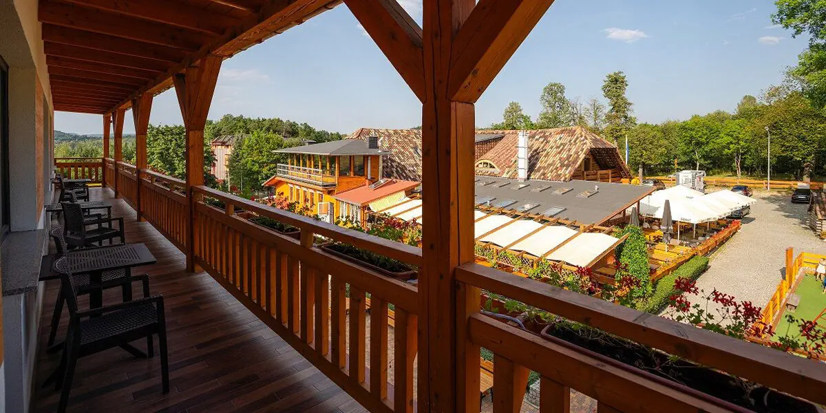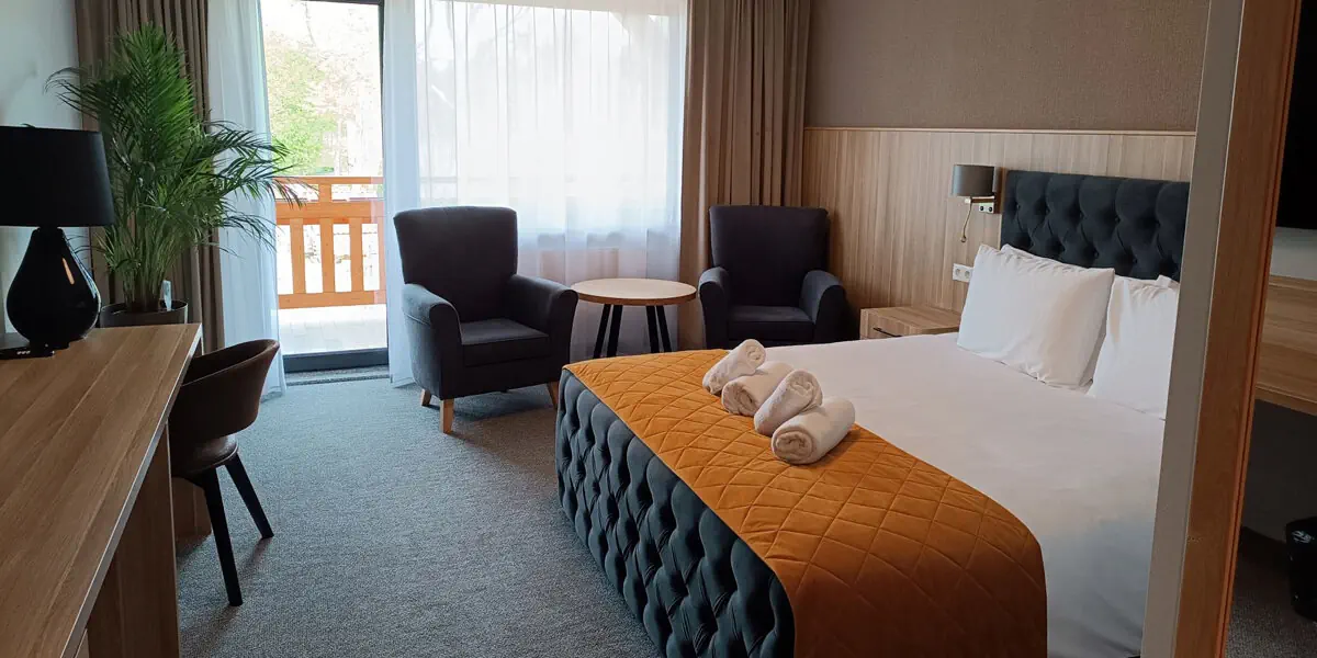 Wygodny pokój z łazienką i balkonem z widokiem na teren hotelu