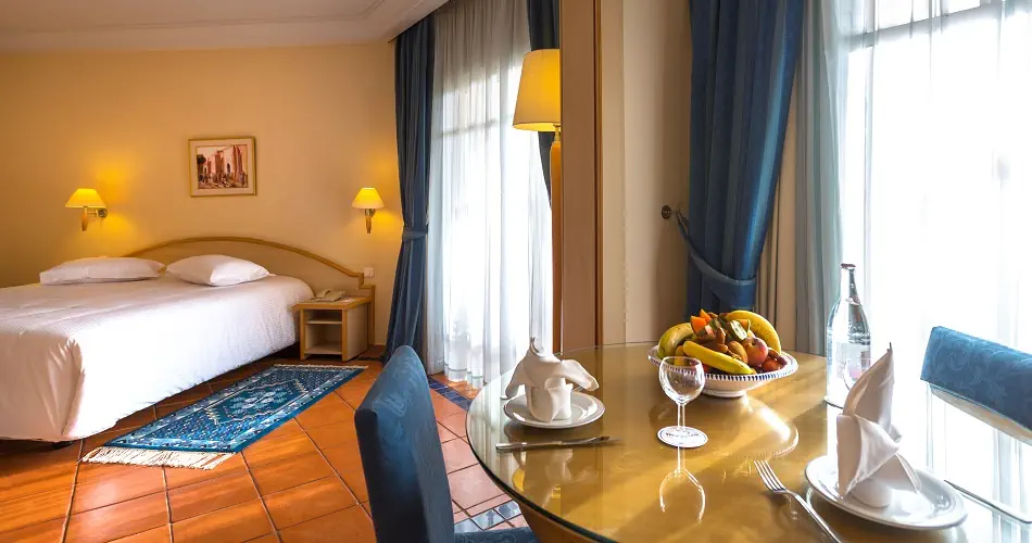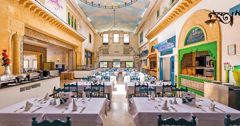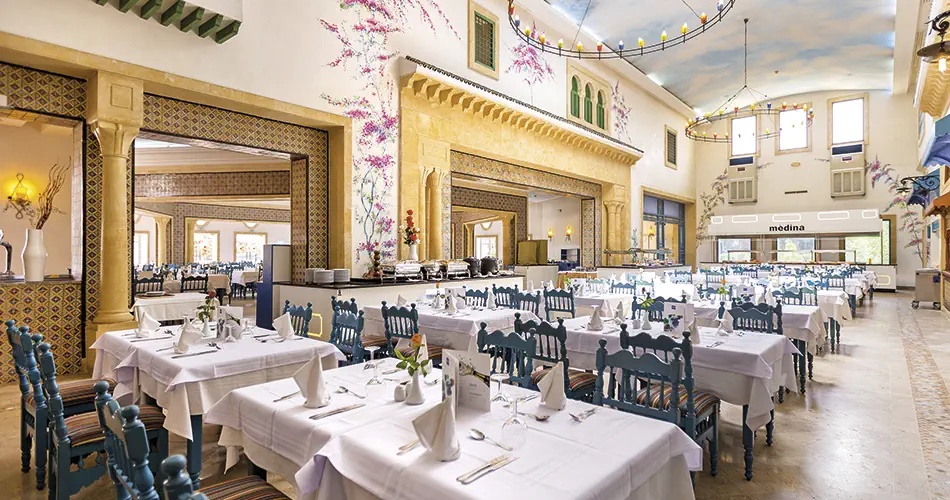 All Inclusive 24H: - Śniadanie, obiad i kolacja w formie bufetu w restauracji głównej - Wczesne śniadanie 04:00- 06:30 - Późne śniadanie 10:00- 12:00 - Przekąski w godz. 15:00 - 18:00 - Późna kolacja 22:00- 02:00 - Nocne przekąski 02:00- 04:00 - Napoje bezalkoholowe oraz alkohole lokalnej produkcji dostępne są całą dobę - Alkohole importowane są dodatkowo płatne Dine Around: - Goście All Inclusive mają możliwość korzystania raz na pobyt z restauracji à la carte w Medina Complex (Włoska kuchnia w Medina Solaria & Thalasso 5*, Marokańska kuchnia w Medina Diar Lemdina 4*, oraz Śródziemnomorska kuchnia w Medina Belisaire & Thalasso 4*) wymagana jest wcześniejsza rezerwacja.