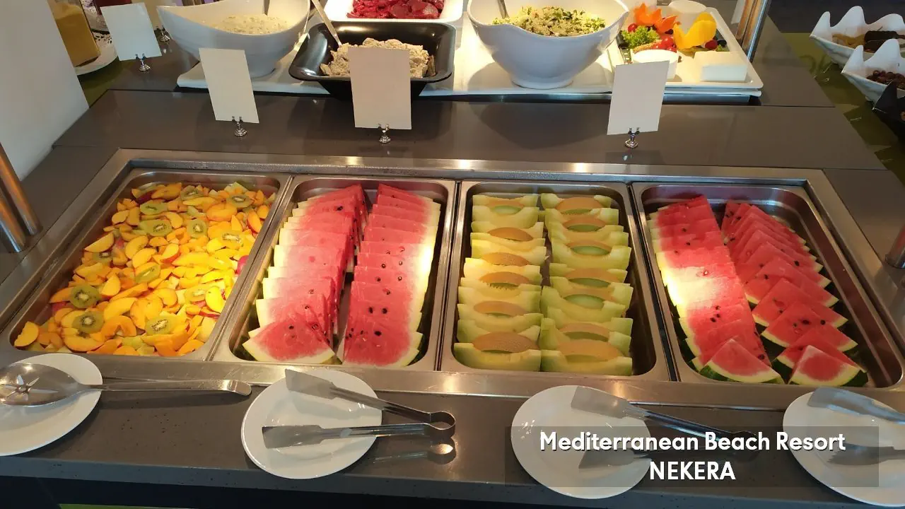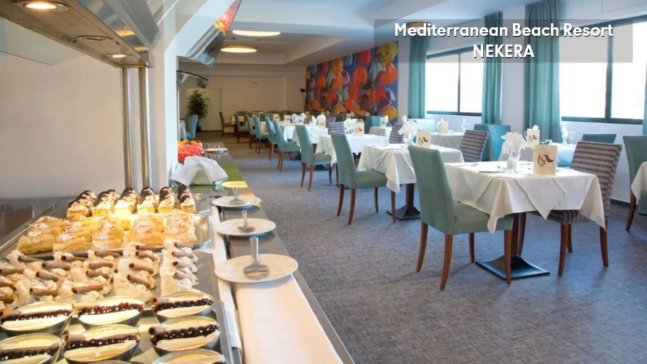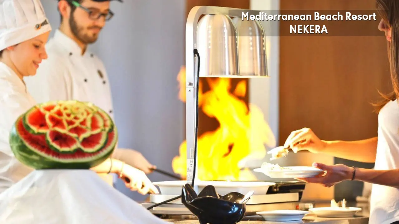 • śniadania i obiadokolacje • śniadanie (7.00-10.00, bufet, w cenie) • kolacja (19.00-21.30, bufet, napoje płatne) • restauracja główna • 2 bary (w lobby i przy basenie, płatne) • kuchnia grecka i międzynarodowa • show cooking • wieczory tematyczne