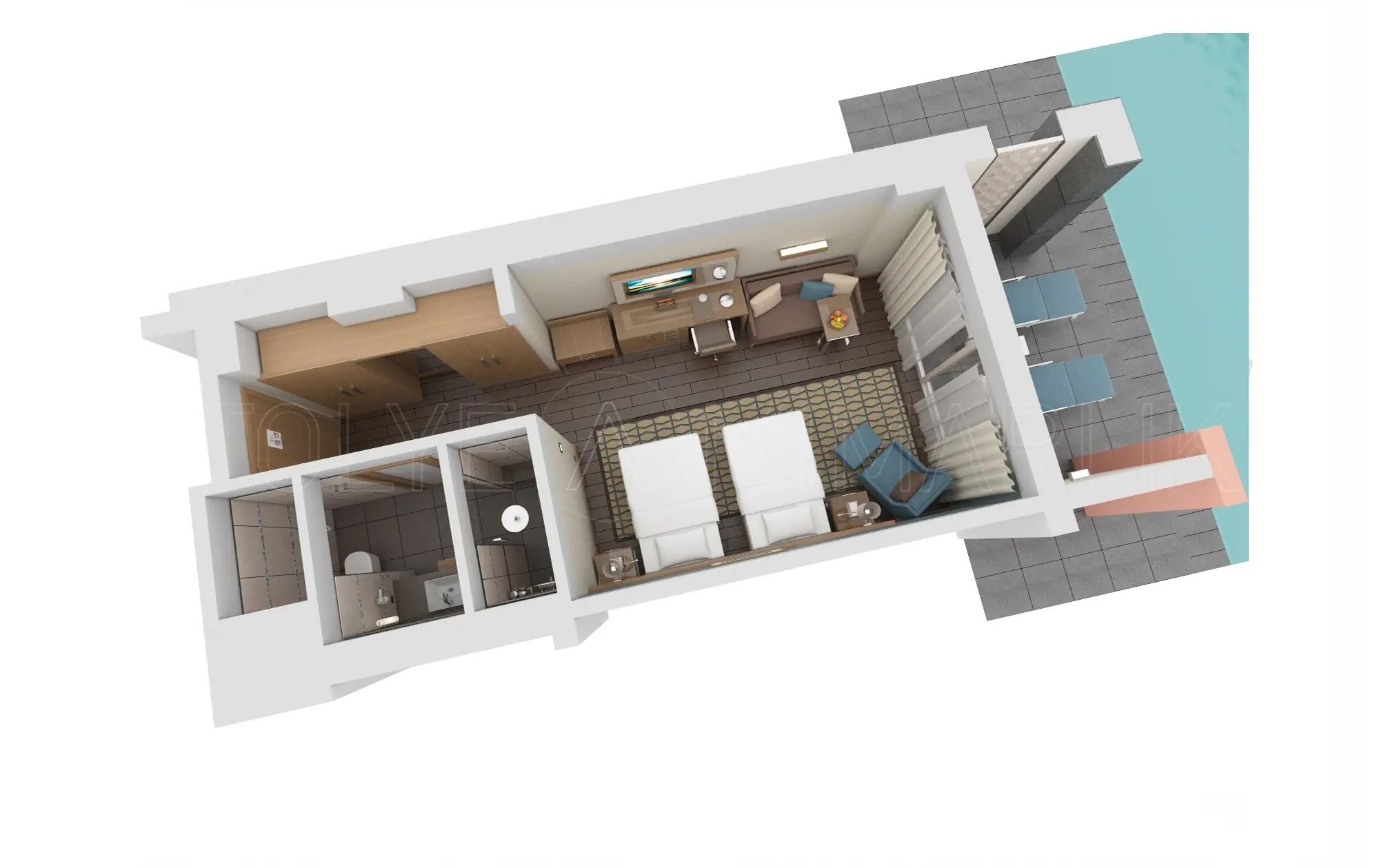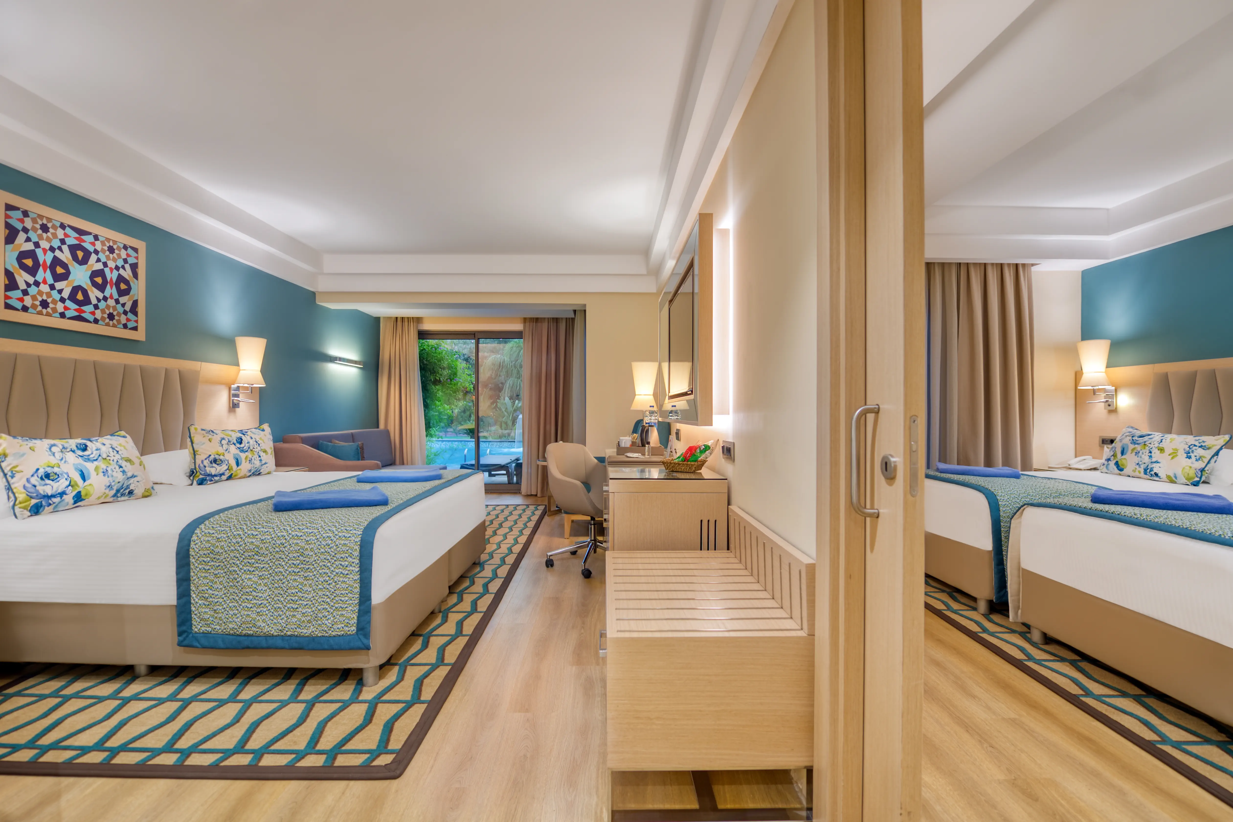 Dla max. 5 osób, Przestrzeń zewnętrzna: Balkon, Kanały telewizji: Angielski, Telefon w pokoju, prysznic, Powierzchnia pokoju: ok. 62 m2, Dostawka: łóżko rozkładane, Rodzaj podłogi: laminat, Sprzątanie codziennie, 2 sypialnie, Drzwi łączące między pokojami, Maksymalna liczba osób dorosłych: 4, Maksymalna liczba dzieci: 2, Widok na ogród,Widok na basen, Liczba łazienek: 2, Liczba toalet: 2, Klimatyzacja: Klimatyzacja centralna, Działa w godzinach: 23:59-23:59Marzec, Kwiecień, Maj, Czerwiec, Lipiec, Sierpień, Wrzesień, Październik, Listopad