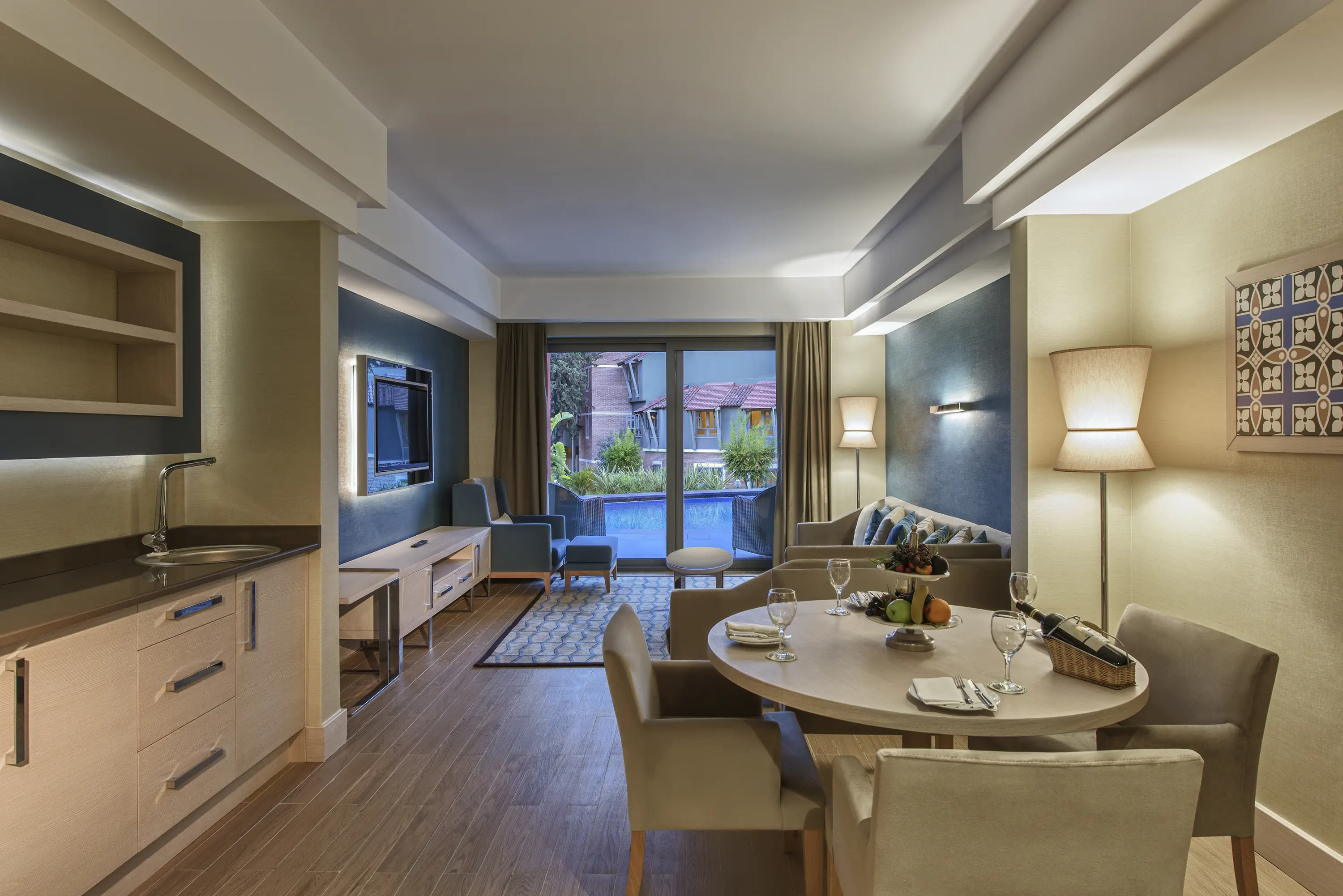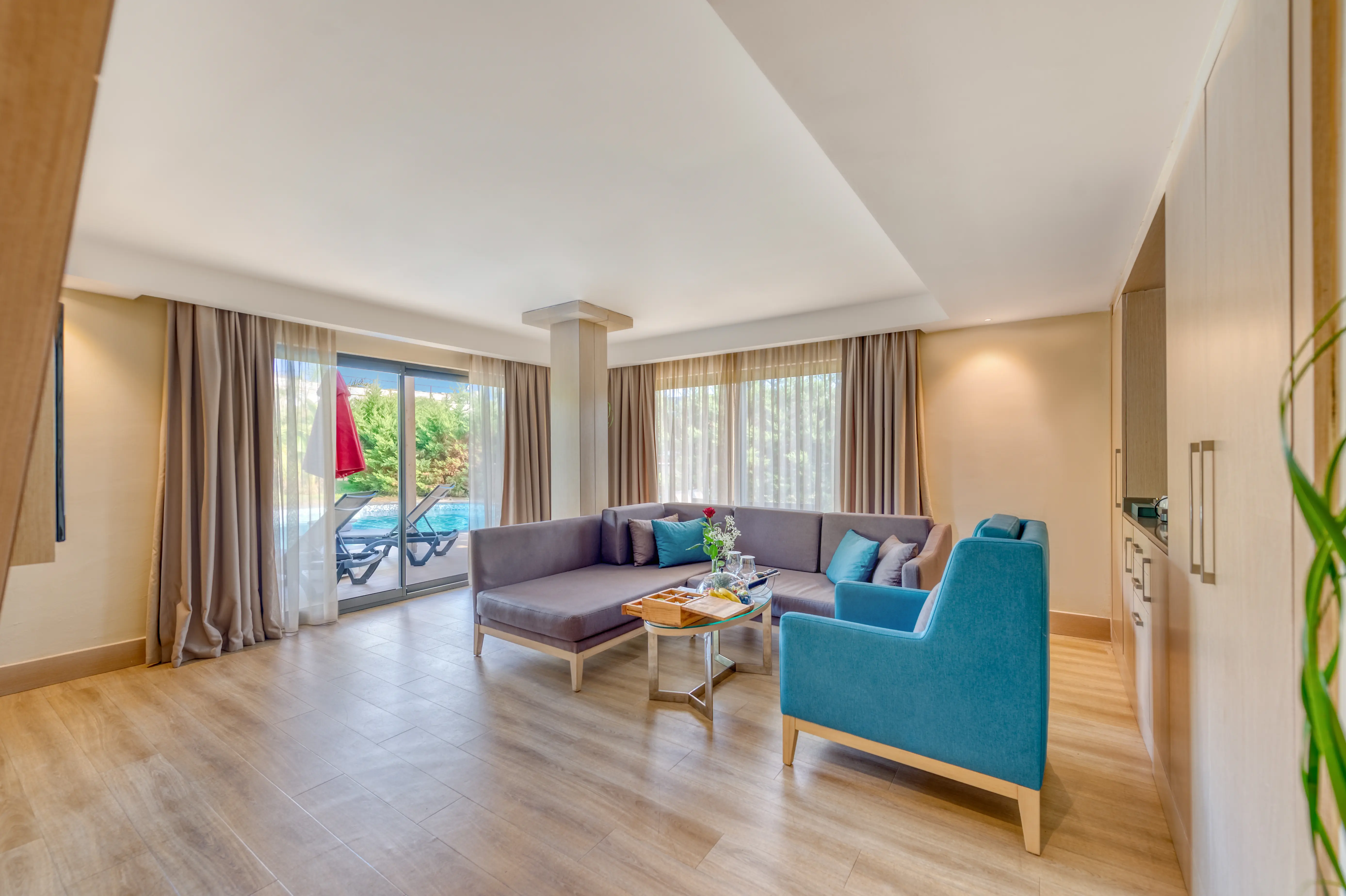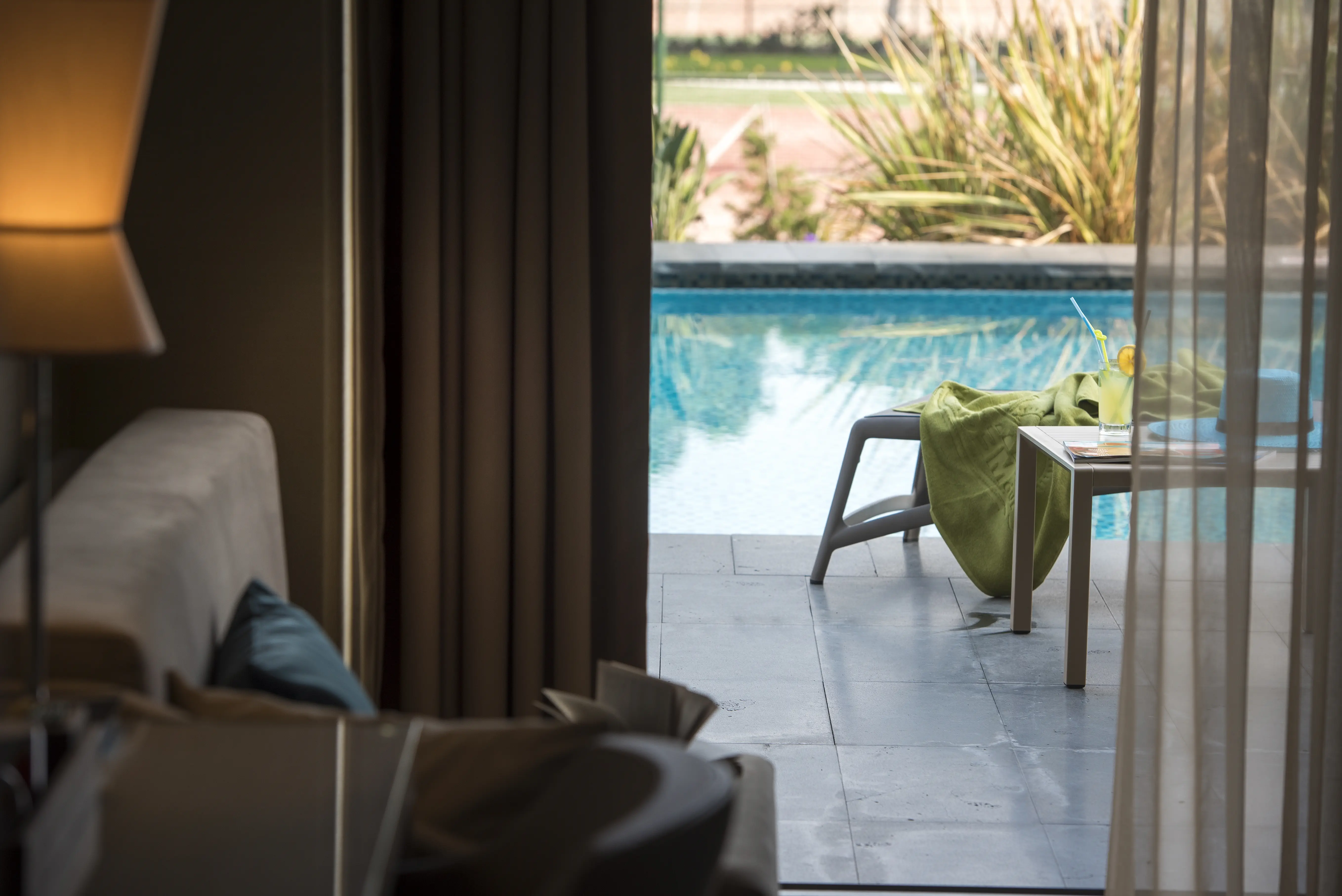 Dla max. 5 osób, Przestrzeń zewnętrzna: Taras, Kanały telewizji: Angielski, Telefon w pokoju, prysznic, Powierzchnia pokoju: ok. 50 - 64 m2, Dostawka: łóżko rozkładane, Rodzaj podłogi: płytki, Sprzątanie codziennie, 2 sypialnie, Drzwi łączące między pokojami, Maksymalna liczba osób dorosłych: 4, Maksymalna liczba dzieci: 2, Widok na ogród,Frontalny widok na basen,Widok na basen, Wyjście do wspólnego basenu, Prywatny basen, Liczba łazienek: 2, Liczba toalet: 2, Zestaw do parzenia kawy i herbaty, Klimatyzacja: Klimatyzacja centralna, Działa w godzinach: 23:59-23:59Marzec, Kwiecień, Maj, Czerwiec, Lipiec, Sierpień, Wrzesień, Październik, Listopad