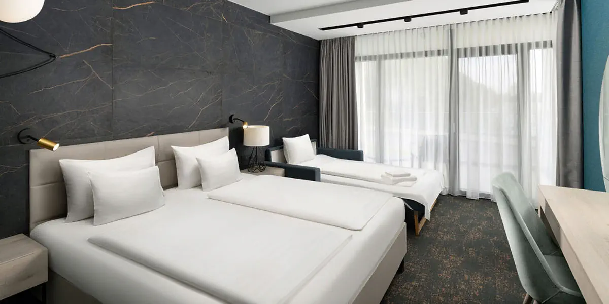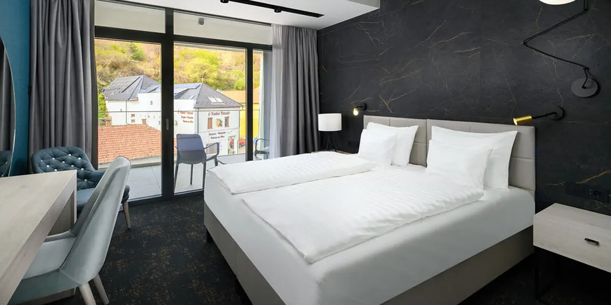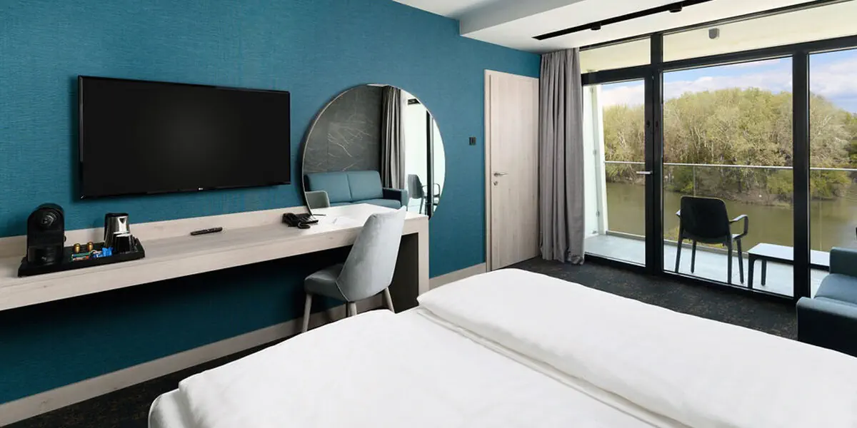 Nowoczesny i bogato wyposażony pokój z balkonem z widokiem na rzekę i łazienką oraz dodatkową sofą. Dostawki są możliwe dla 1 osoby dorosłej LUB 2 dzieci do 12 lat