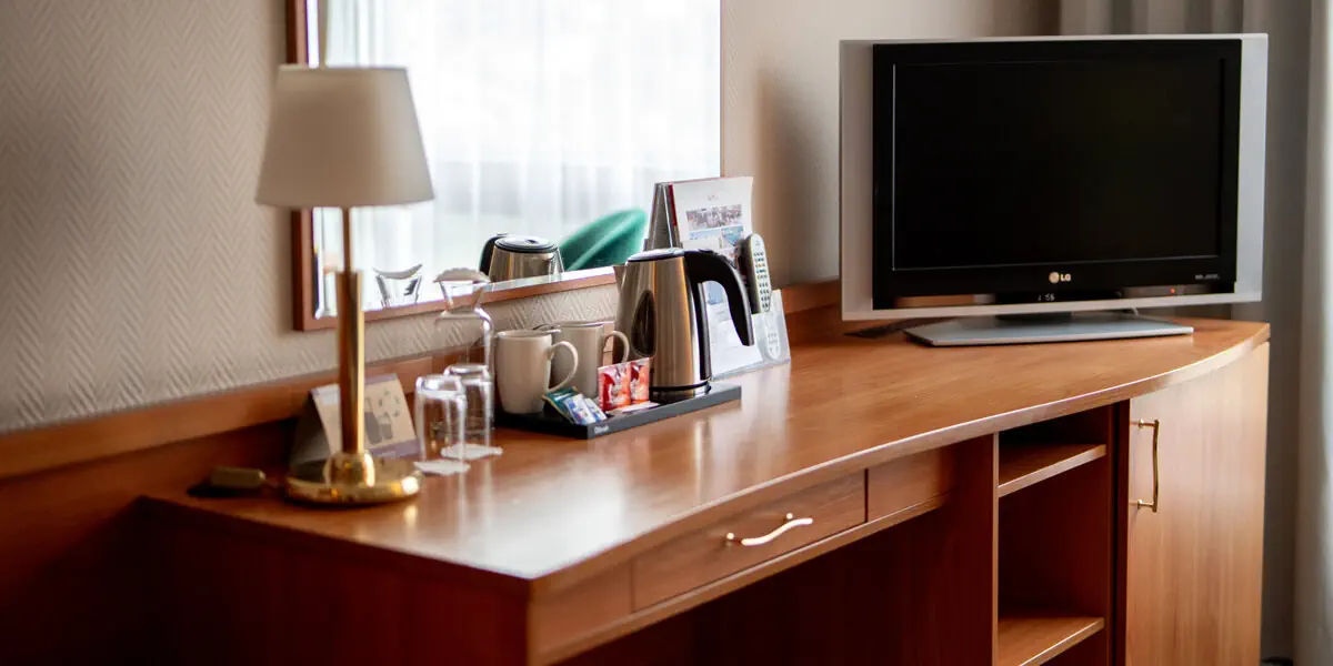 Nowocześnie wyposażony pokój z miejscem do pracy i wygodnymi pojedynczymi łóżkami. Wyposażony w telewizję satelitarną, bezpłatne WIFI, sejf, zestaw do parzenia kawy i herbaty, wodę mineralną, łazienkę z prysznicem. W łazience znajdują się ręczniki oraz podstawowe kosmetyki.