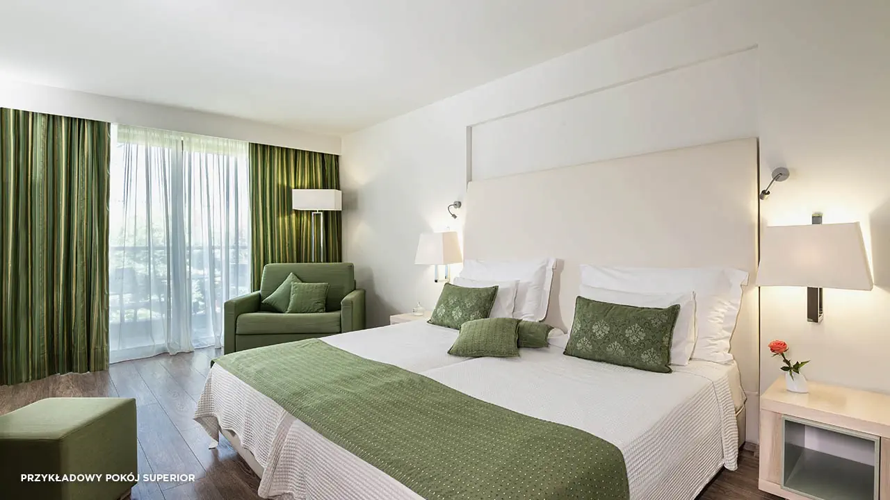 Superior • 2-3 os. (ok. 22 m2)• dostawka dla 3 os.• klimatyzacja indywidualna (bezpłatna)• Wi-Fi (bezpłatne)• TV-SAT, telefon• sejf (bezpłatny)• minibar (płatny)• zestaw do parzenia kawy i herbaty• balkon lub taras• łazienka- prysznic/wanna, suszarka