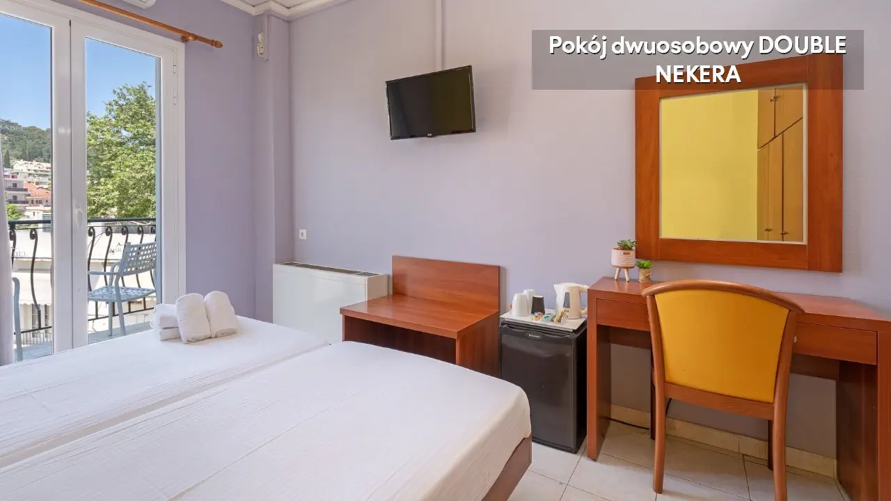 Pokój dwuosobowy DOUBLE: ok. 20 m2, dla maks. 2 osób dorosłych; łóżko podwójne. Wyposażenie: klimatyzacja indywidualnie sterowana, 28’ TV-Sat., sejf, telefon (płatny), minilodówka, zestaw do parzenia kawy/herbaty, ręcznik plażowy, prywatna łazienka (prysznic/wanna, toaleta, umywalka, suszarka do włosów, szlafrok, kapcie), balkon. Pokój Trzyosobowy TRIPLE: ok. 23 m2, dla maks. 3 osób dorosłych; łóżko podwójne i pojedyncze. Poza tym wyposażony jak pokój dwuosobowy DOUBLE.