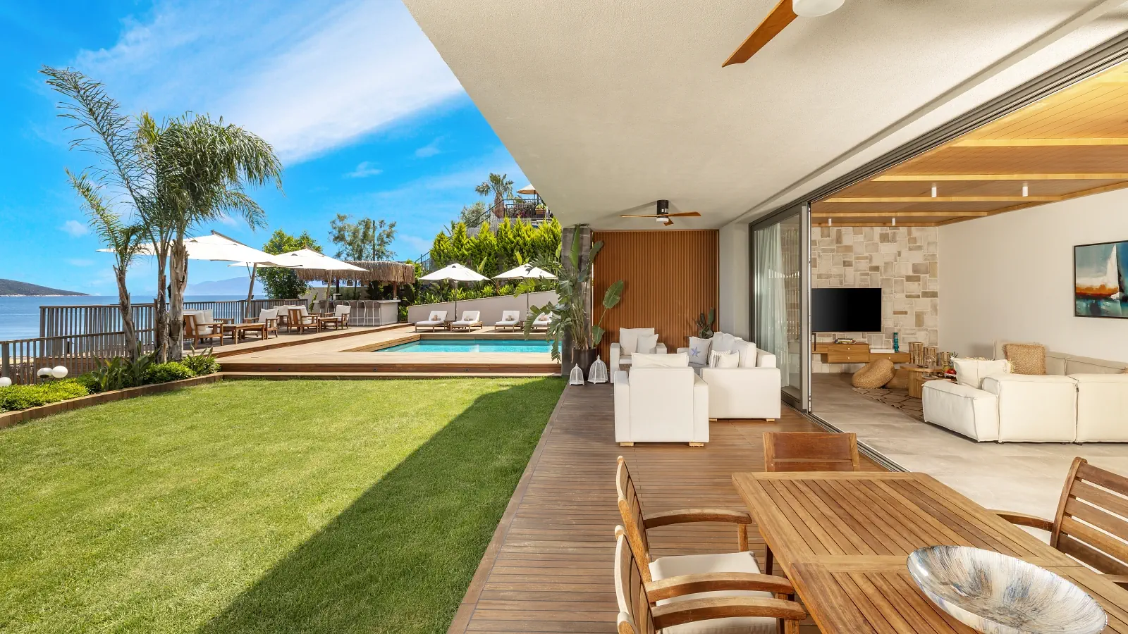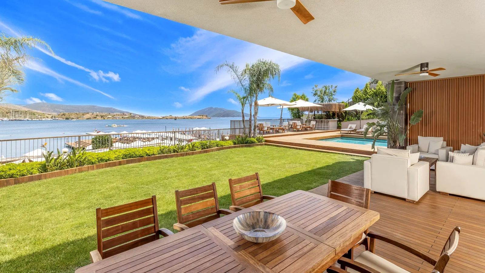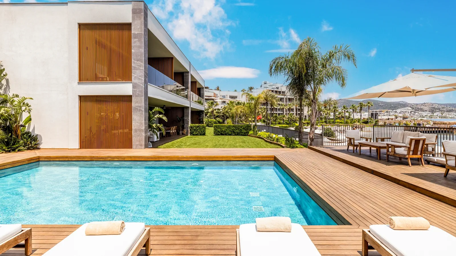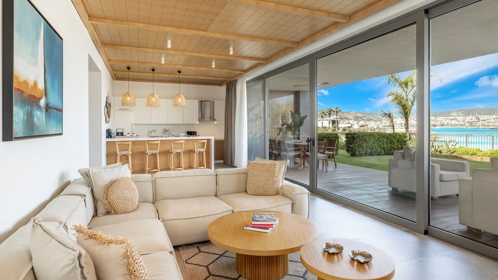 Dla max. 4 osób, Przestrzeń zewnętrzna: Balkon, Kanały telewizji: Angielski, Telefon w pokoju, prysznic, Powierzchnia pokoju: ok. 65 m2, Dostawka: sofa, Rodzaj podłogi: płytki, Sprzątanie cykliczne, Salon, 2 sypialnie, Drzwi łączące między pokojami, Maksymalna liczba osób dorosłych: 4, Maksymalna liczba dzieci: 3, Widok na ogród,Widok na morze, Liczba łazienek: 2, Liczba toalet: 2, Zestaw do parzenia kawy i herbaty, Klimatyzacja: Klimatyzacja centralna, Działa w godzinach: 24hMaj, Czerwiec, Lipiec, Sierpień, Wrzesień, Październik